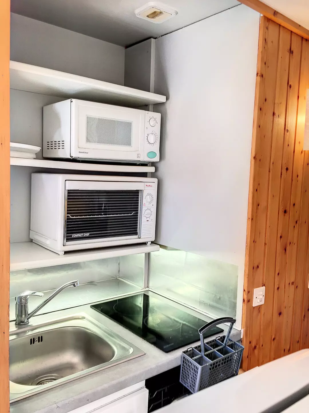La cuisine comprend des plaques électriques, un mini four, un réfrigérateur, un micro-ondes combiné et un lave vaisselle.