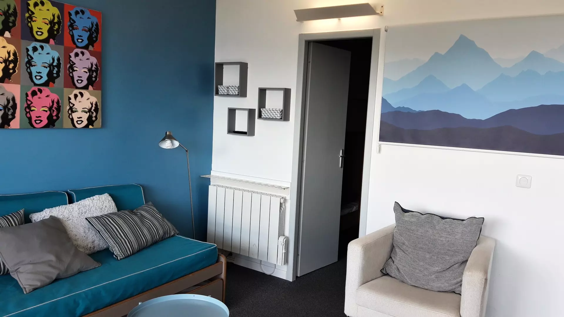Trois pièces meublé pour 7/8 personnes, d'une superficie de 54m², situé au 8e étage la résidence Thuria, avec balcon exposé Ouest.