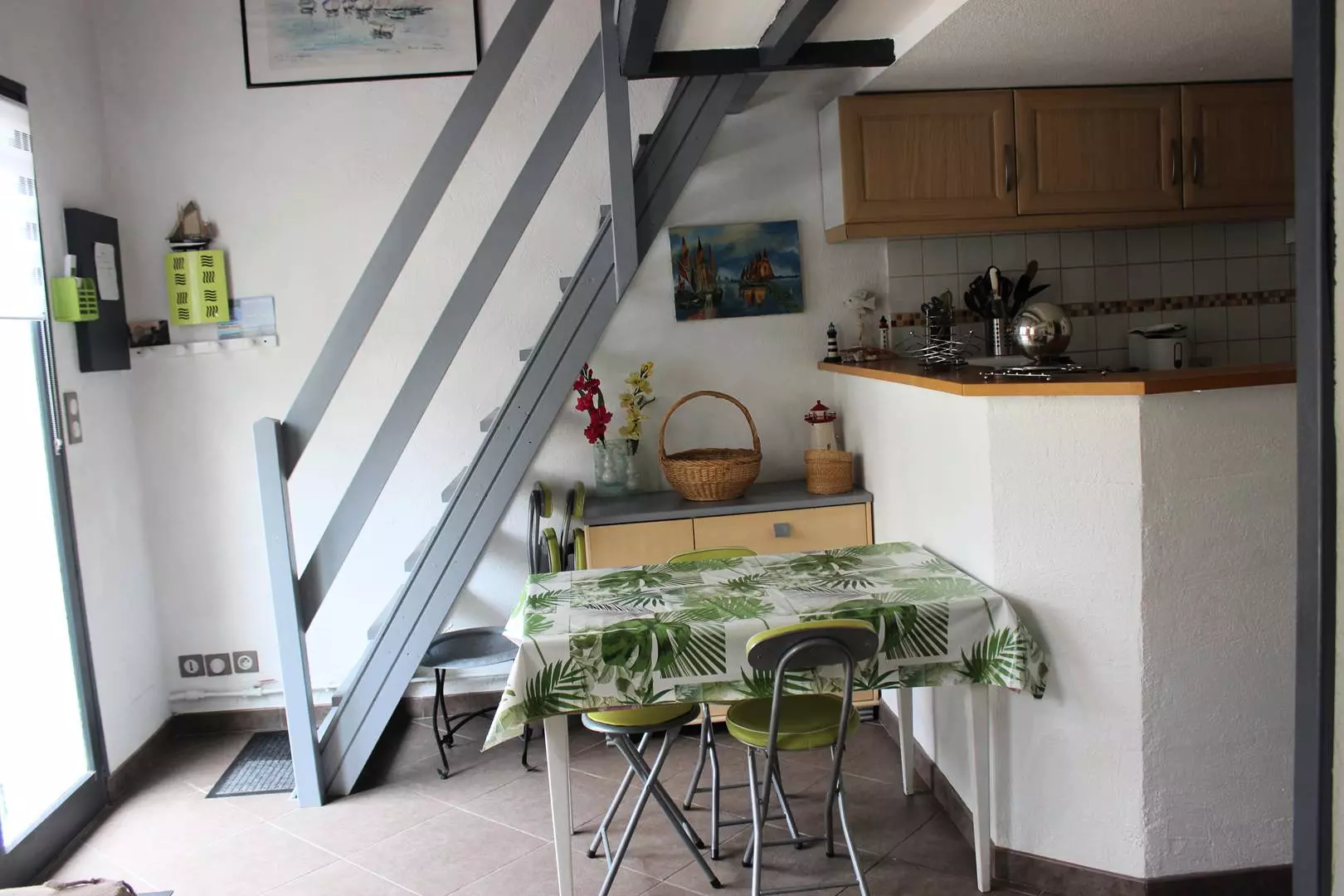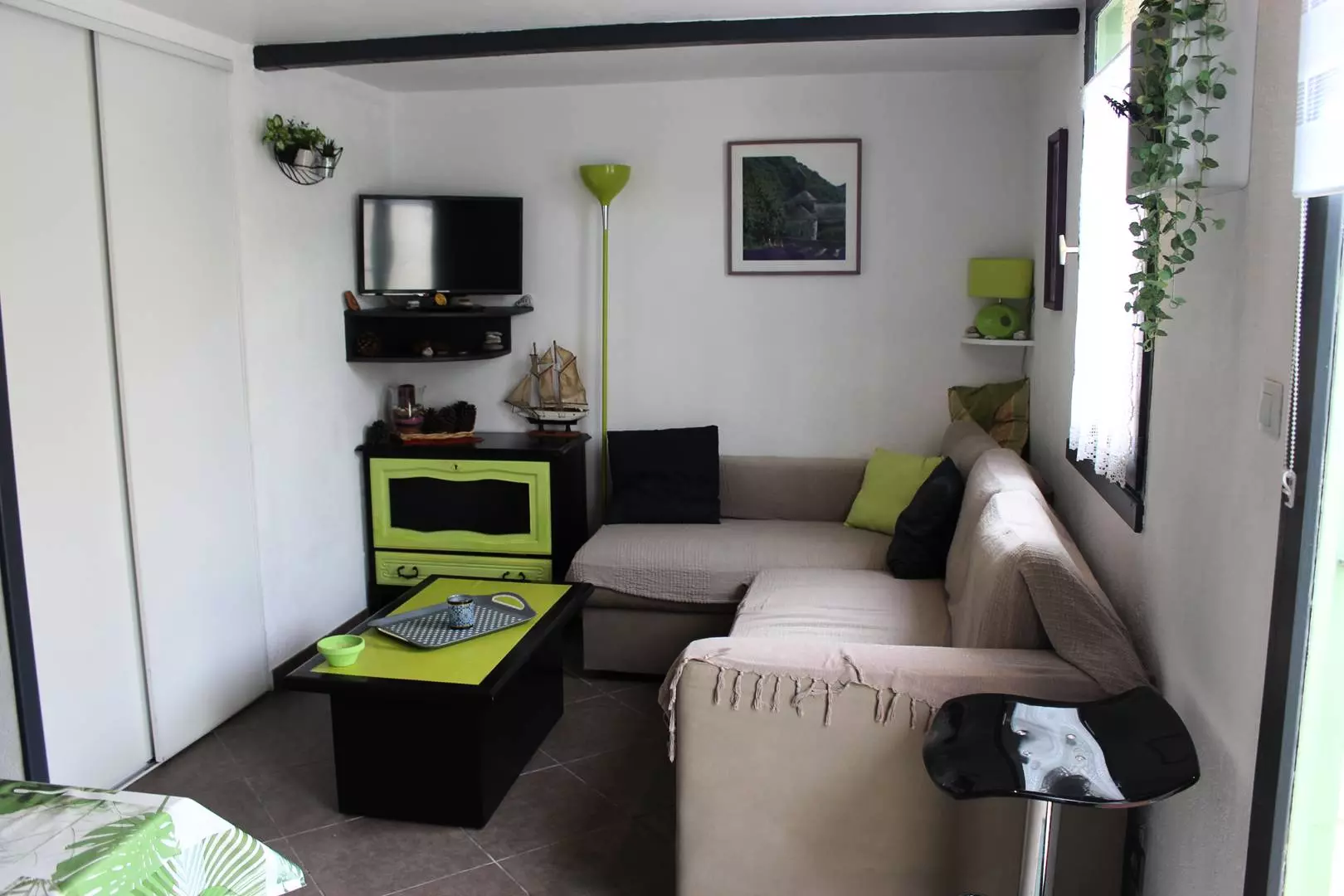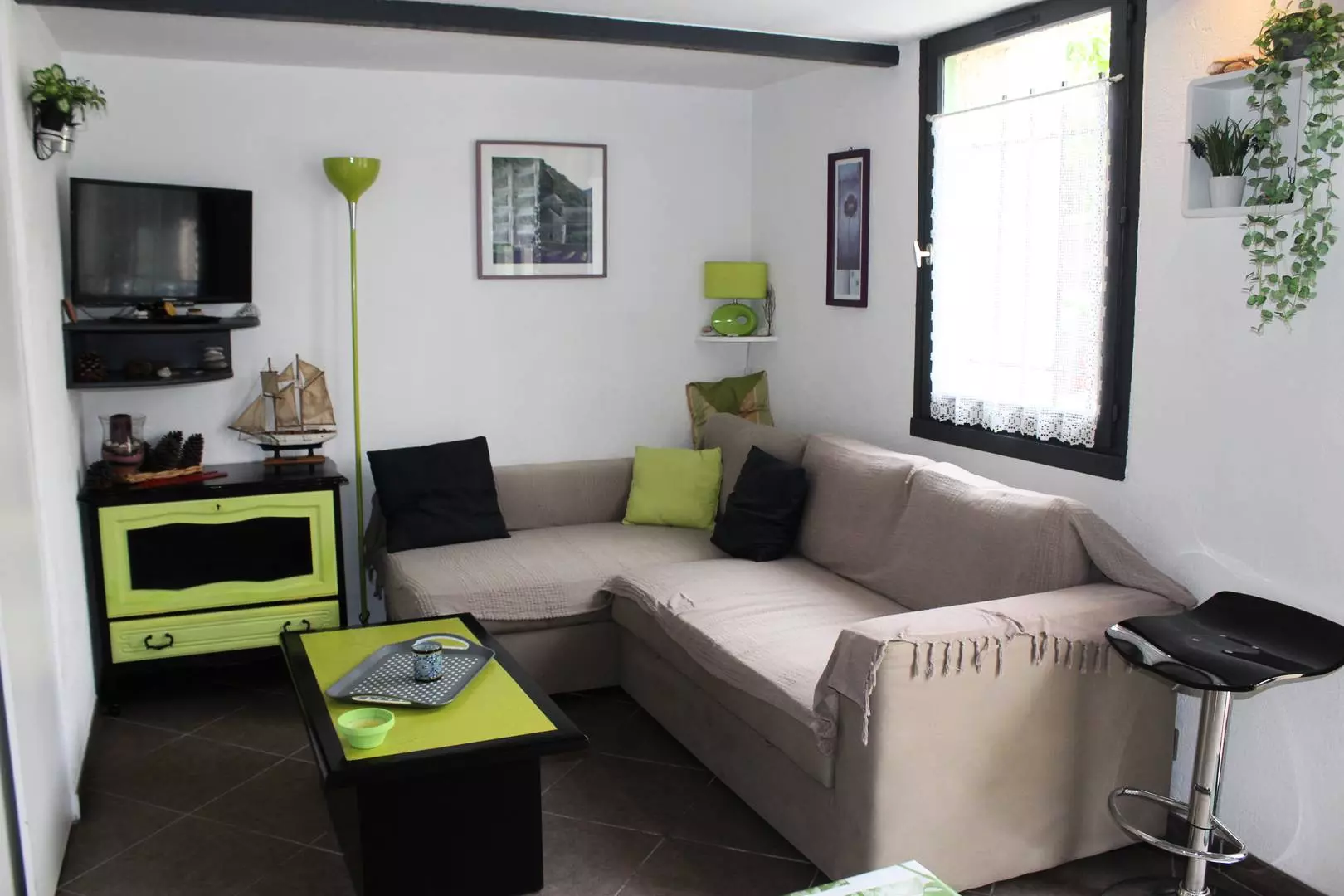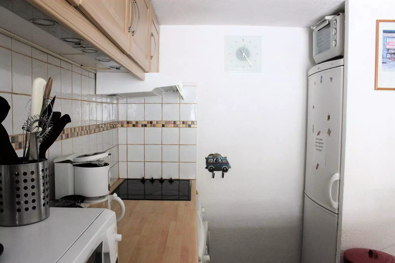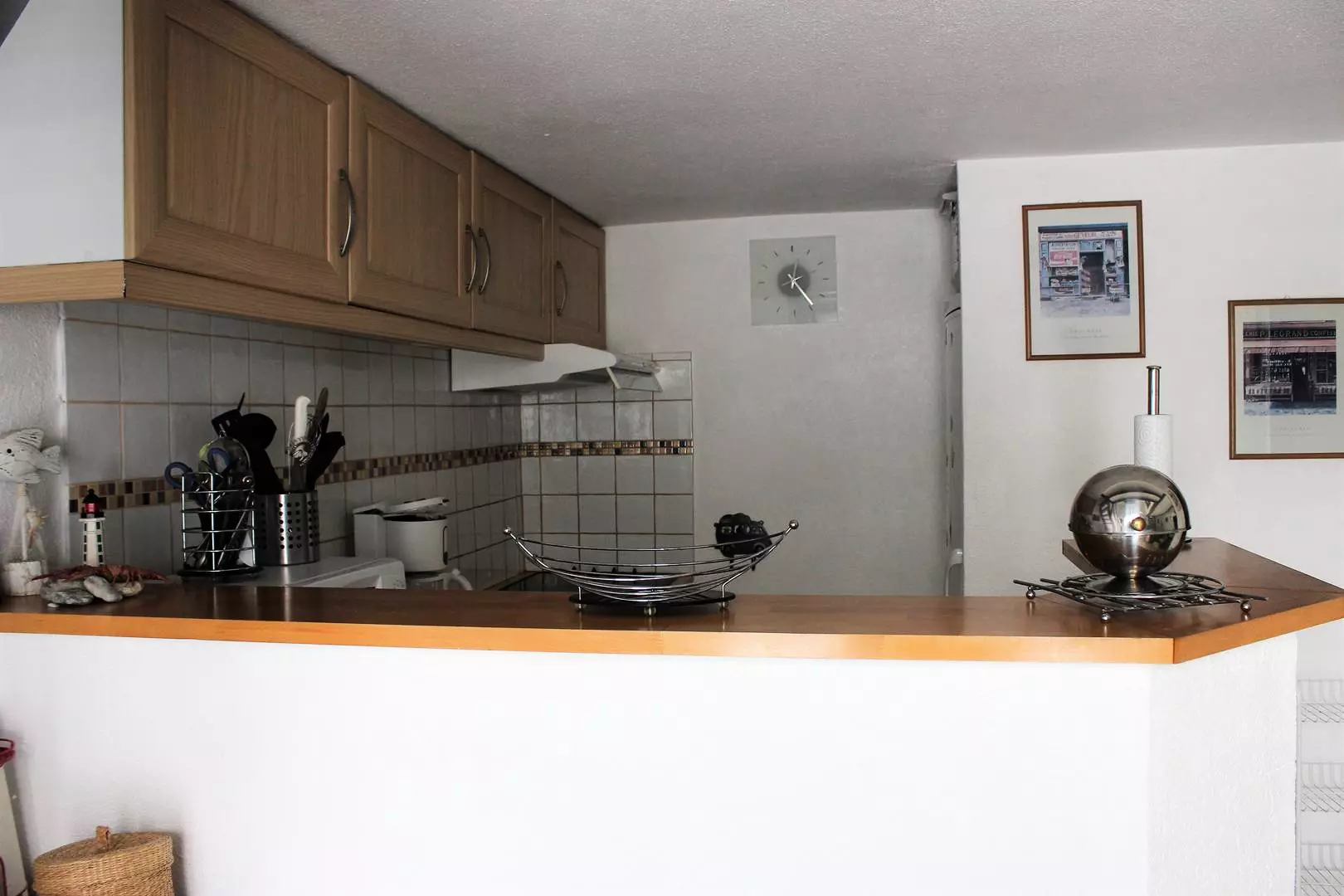 Séjour/ salon avec TV et canapé convertible en 140, cuisine américaine tout équipée (lave vaisselle, lave-linge, four, micro-ondes,réfrigérateur/congélateur, plaque de cuisson vitrocéramique..)