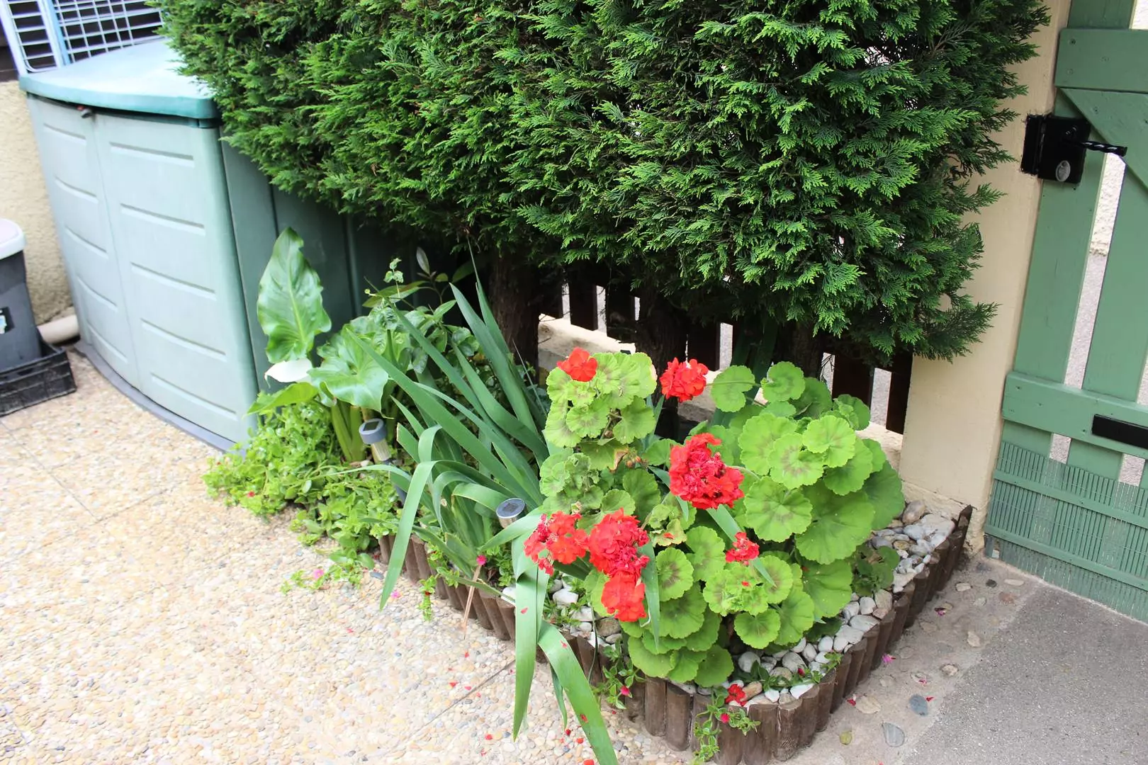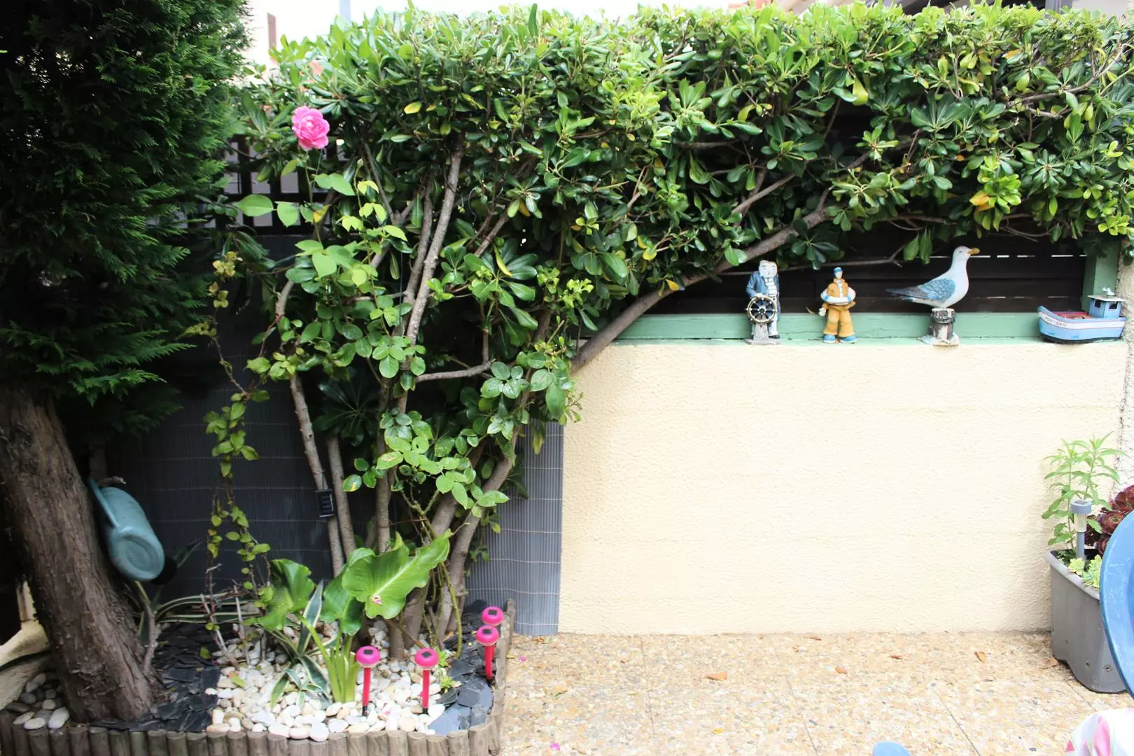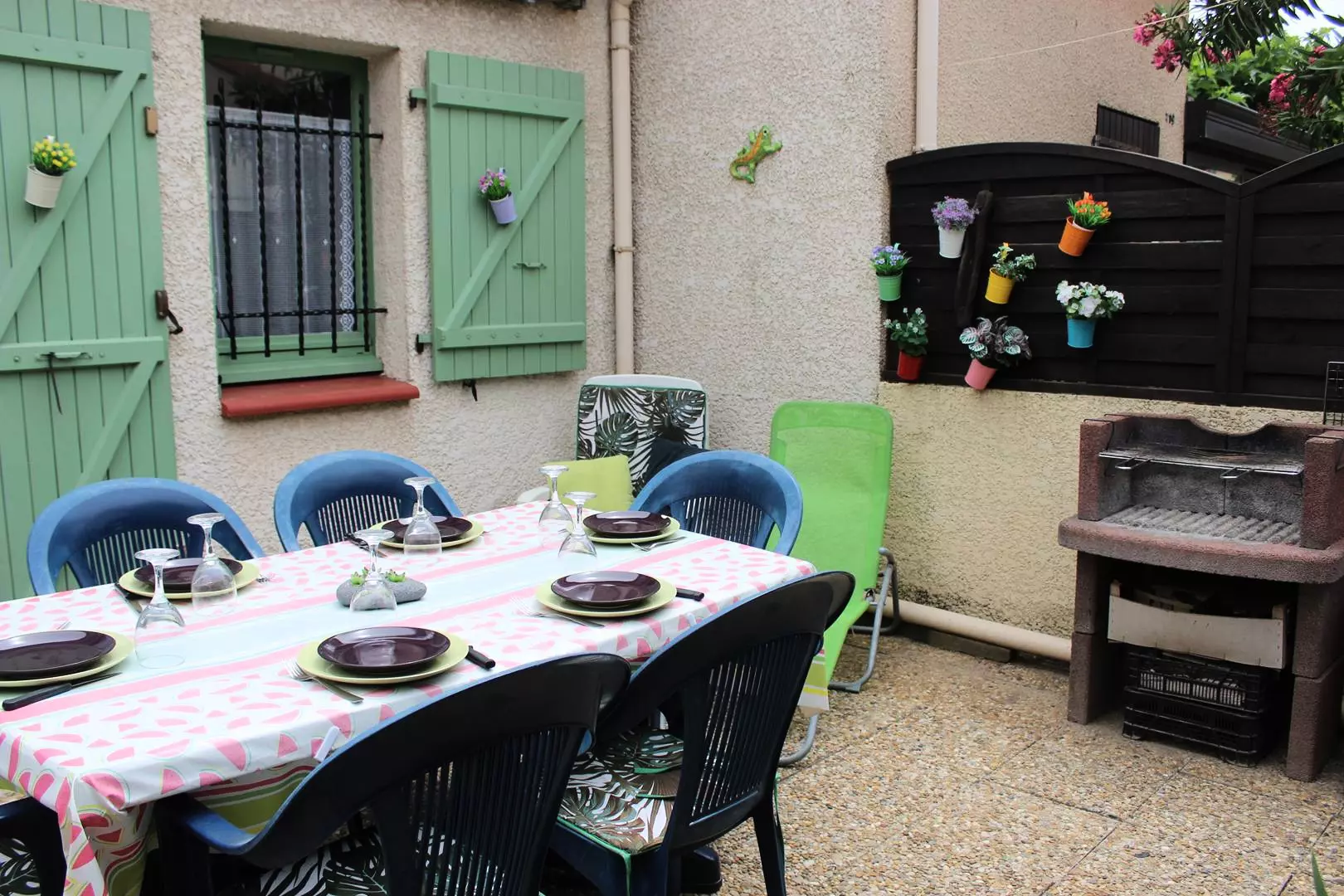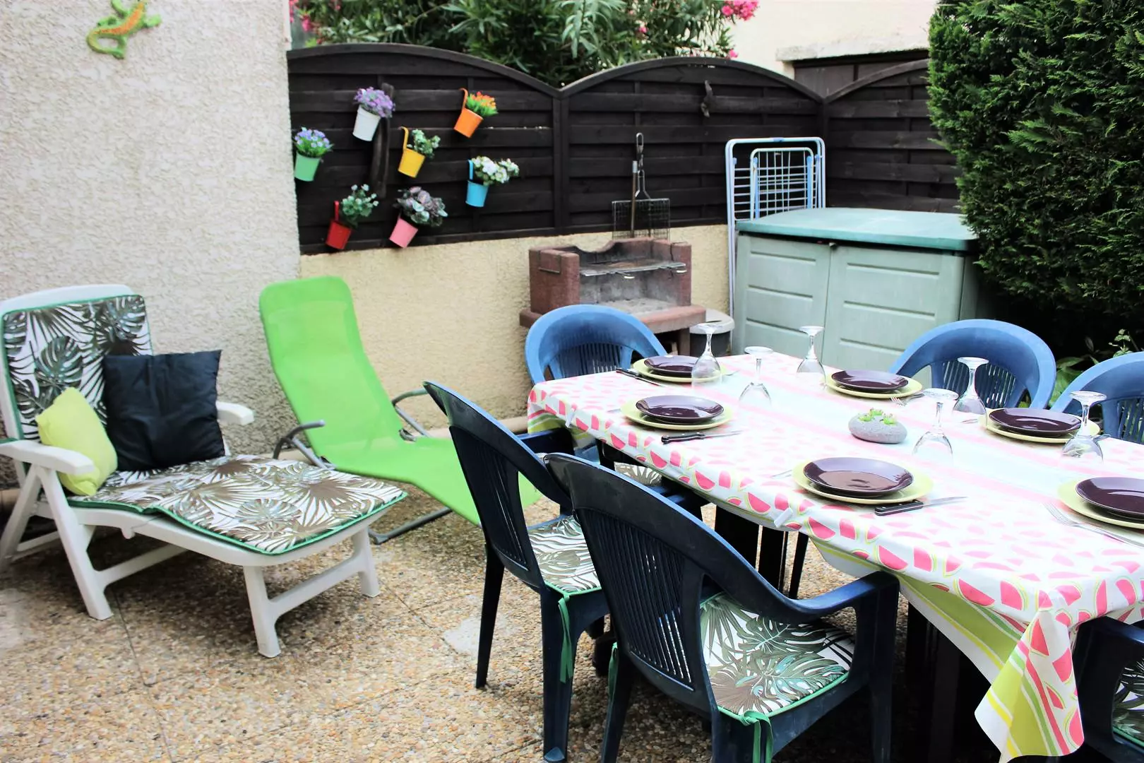 Entrée par cour/ jardinet bien aménagé sans vis à vis avec store banne, table et chaises de jardin, barbecue, transats.