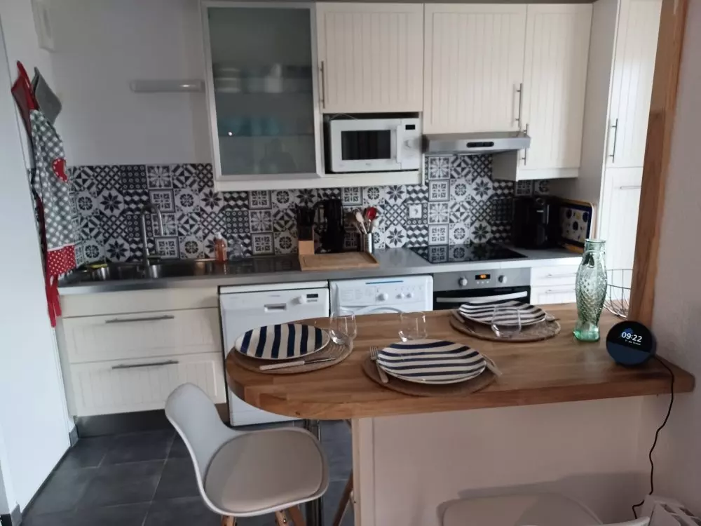 CUISINE OUVERTE rénovée avec comptoir et chaises de bar : plaque de cuisson vitrocéramique, air-fryer, micro-onde, four, réfrigérateur et bloc congélateur, lave-linge, lave-vaisselle, rangements, cafetière Dolce Gusto.