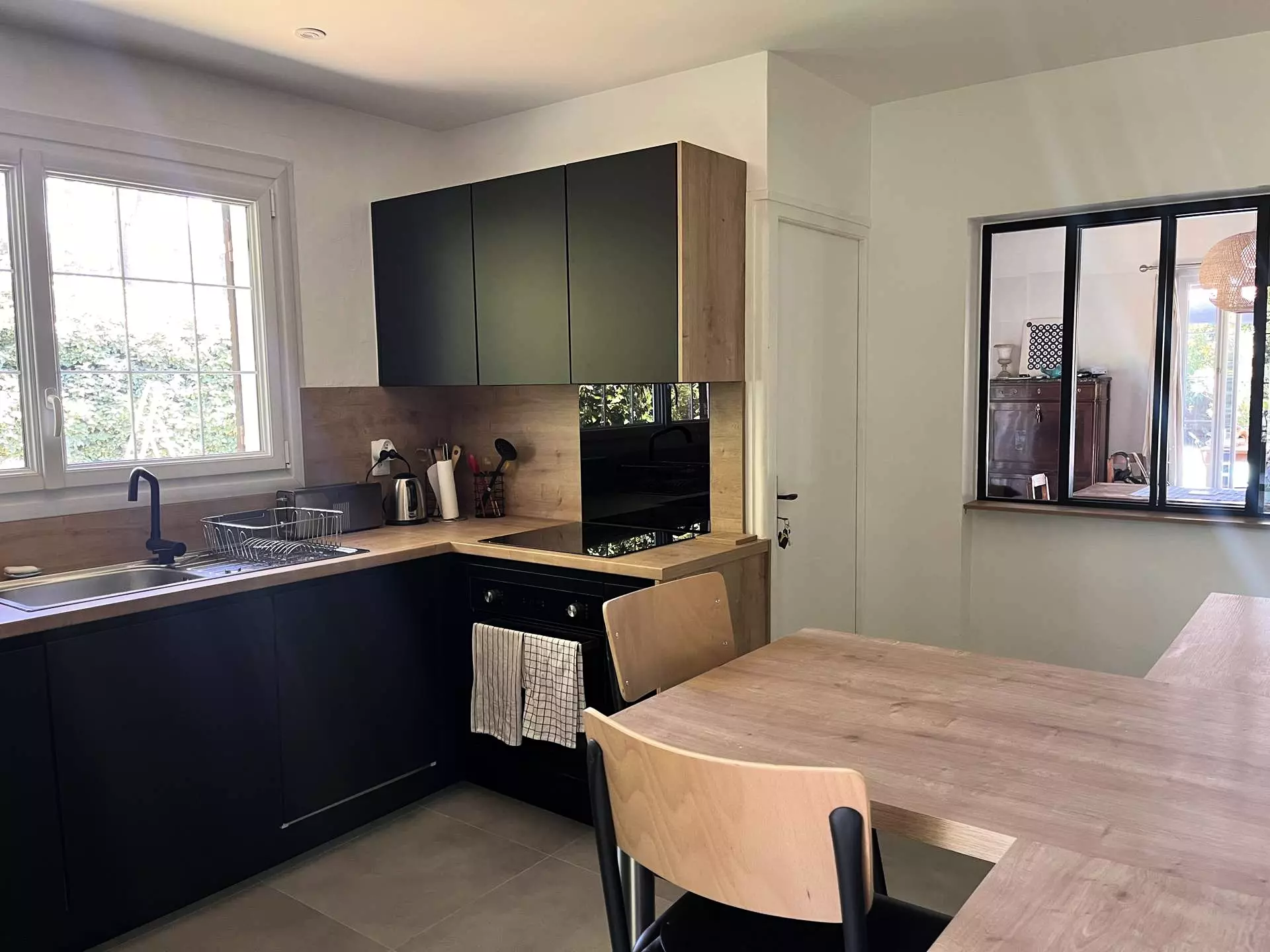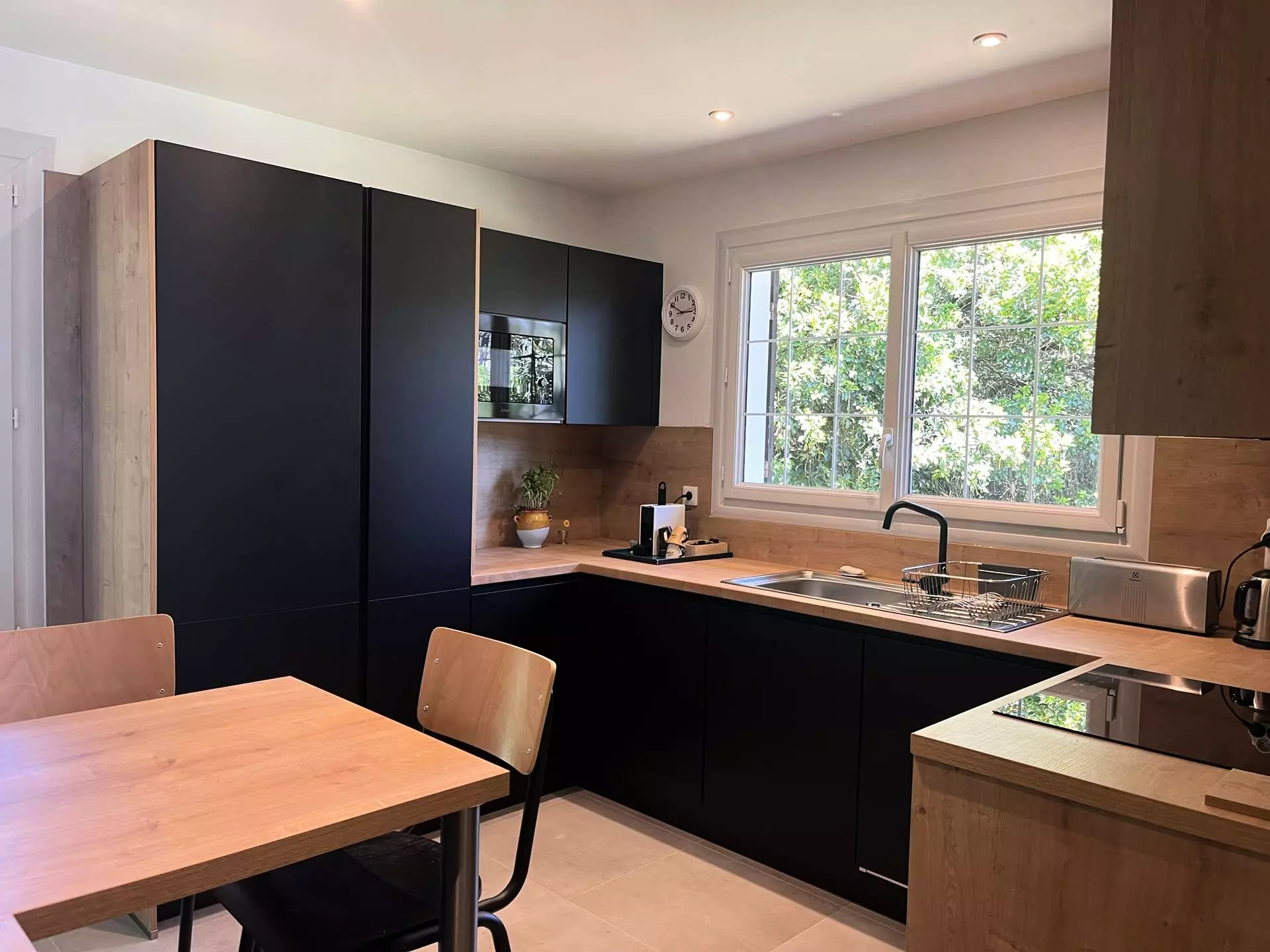 CUISINE refait intégralement à neuf : table, chaises, plaques induction 4 emplacements , frigo congélateur, lave-linge, lave-vaisselle, micro-onde, bouilloire, cafetière + Nespresso, cave à vin.