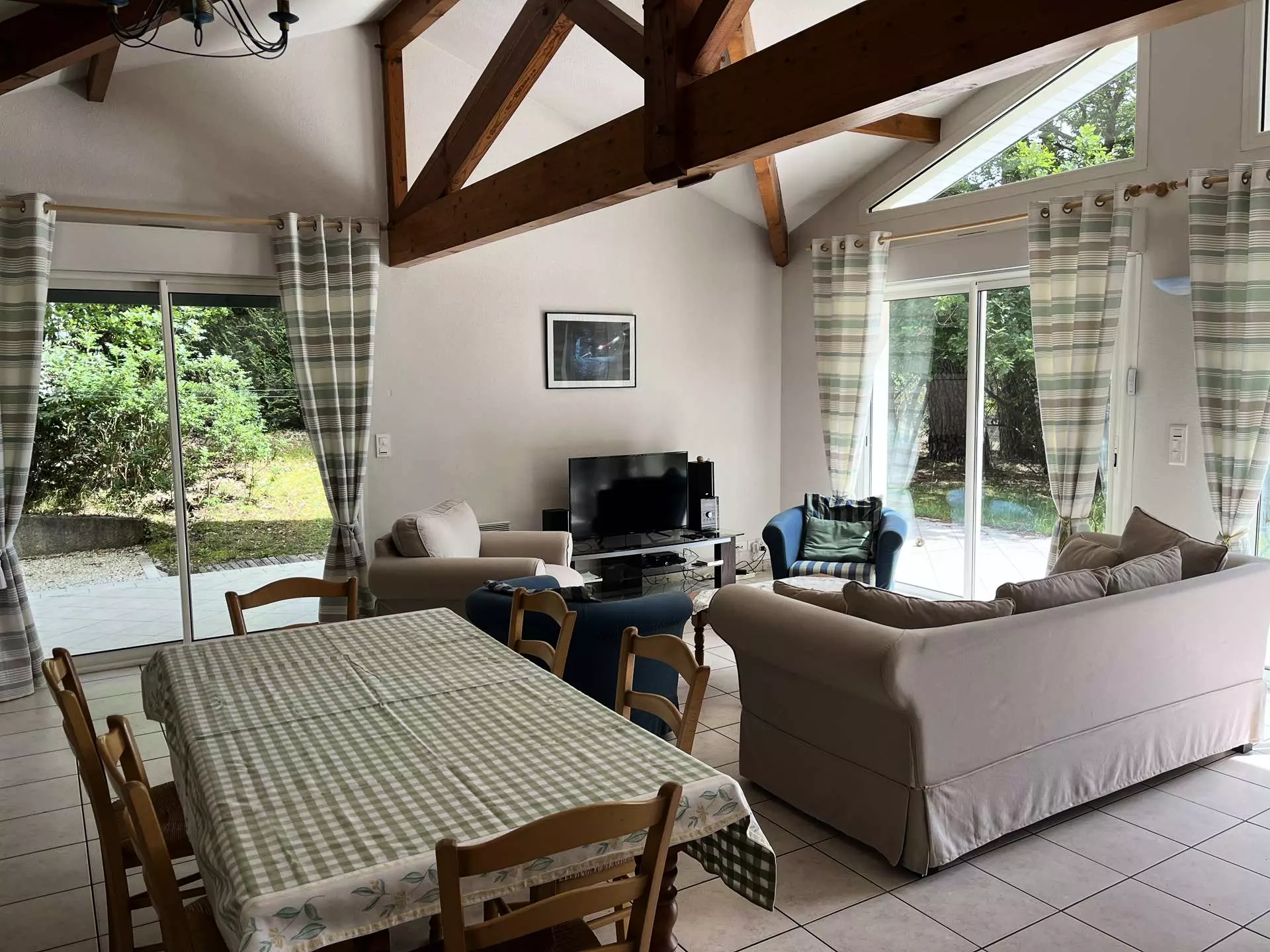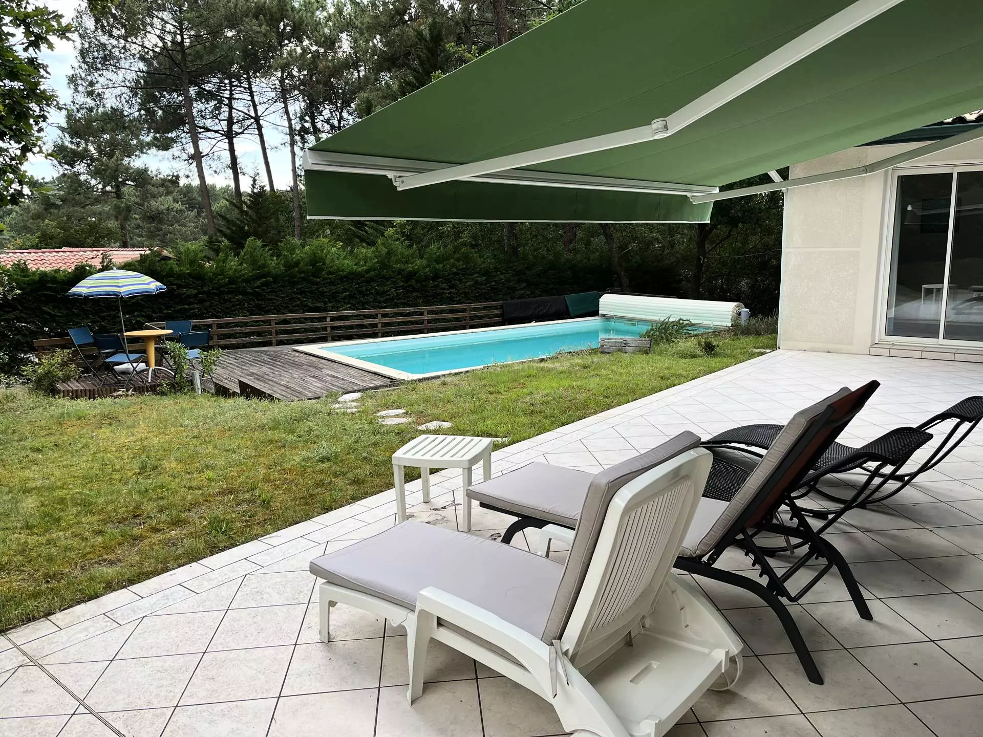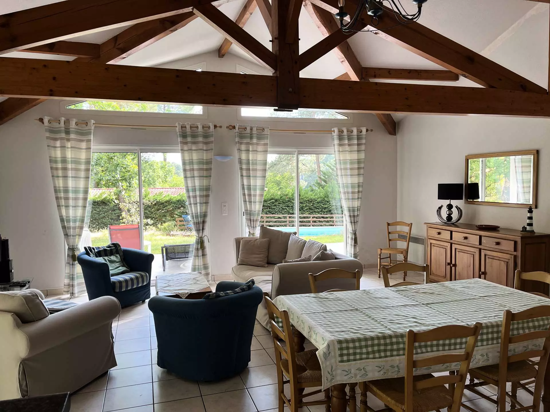 Située sur le Domaine du Golf, à 500m du lac et 6 km de la plage, dans un quartier résidentiel verdoyant et calme, agréable villa de 115m2 pour 6 personnes, bien équipée, avec 3 chambres, grand séjour et cuisine américaine, sur un terrain boisé de 1115m2. Terrasse ombragée avec mobilier de jardin et transats, store électrique, piscine chauffée de 8x4m, sécurisée avec volet roulant électrique.