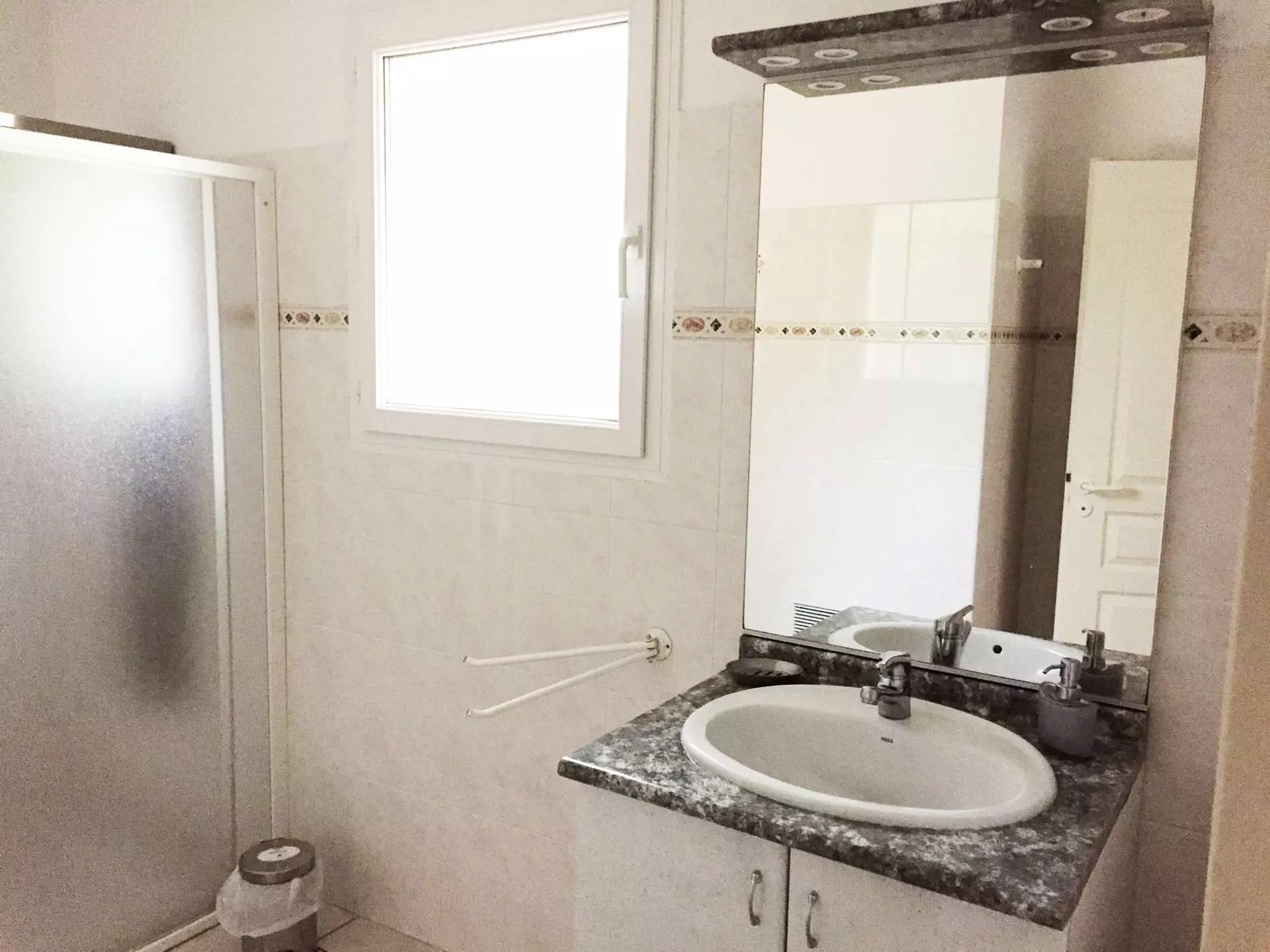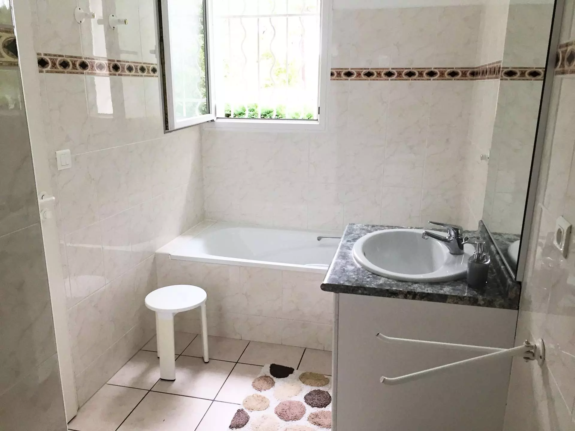 1 CHAMBRE 1 lit en 160, chevet, placard, chaises, petit meuble et sa salle de bain attenante avec baignoire, 1 vasque, WC et tabouret