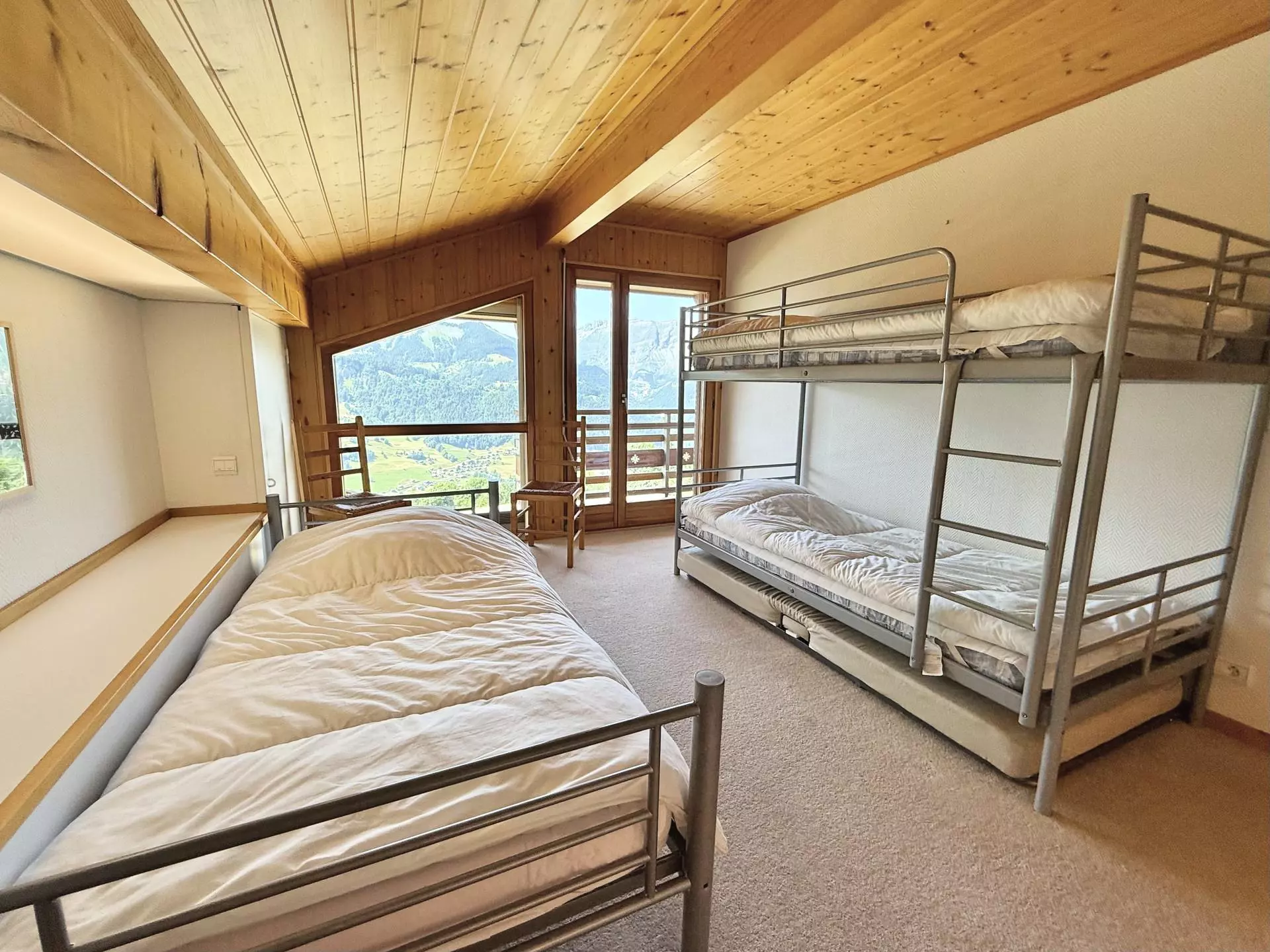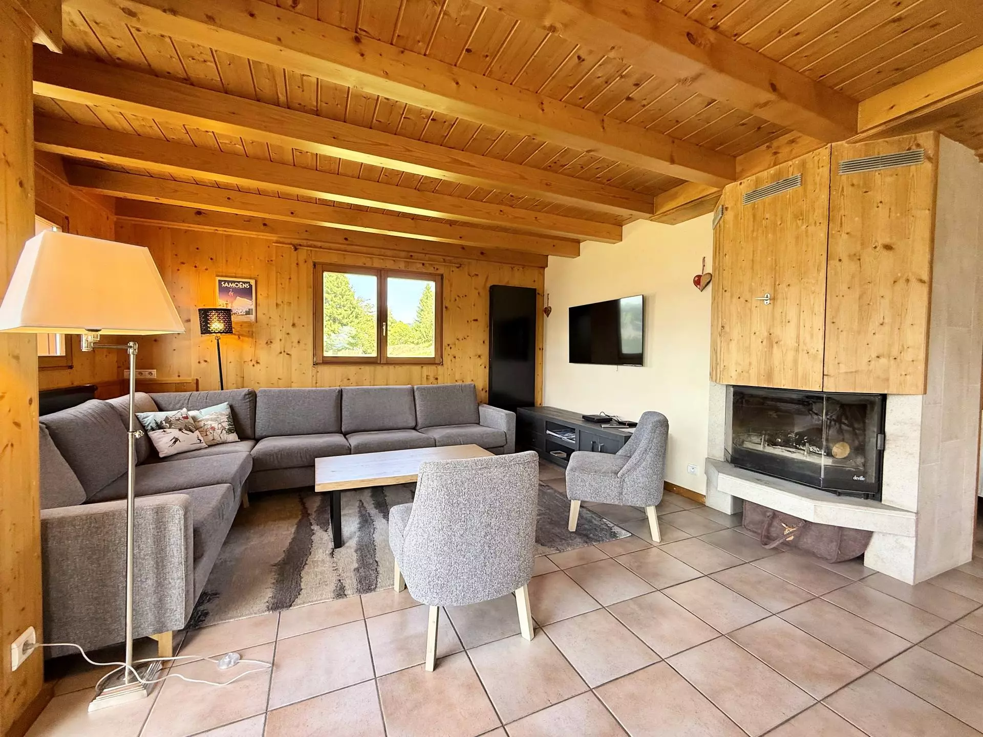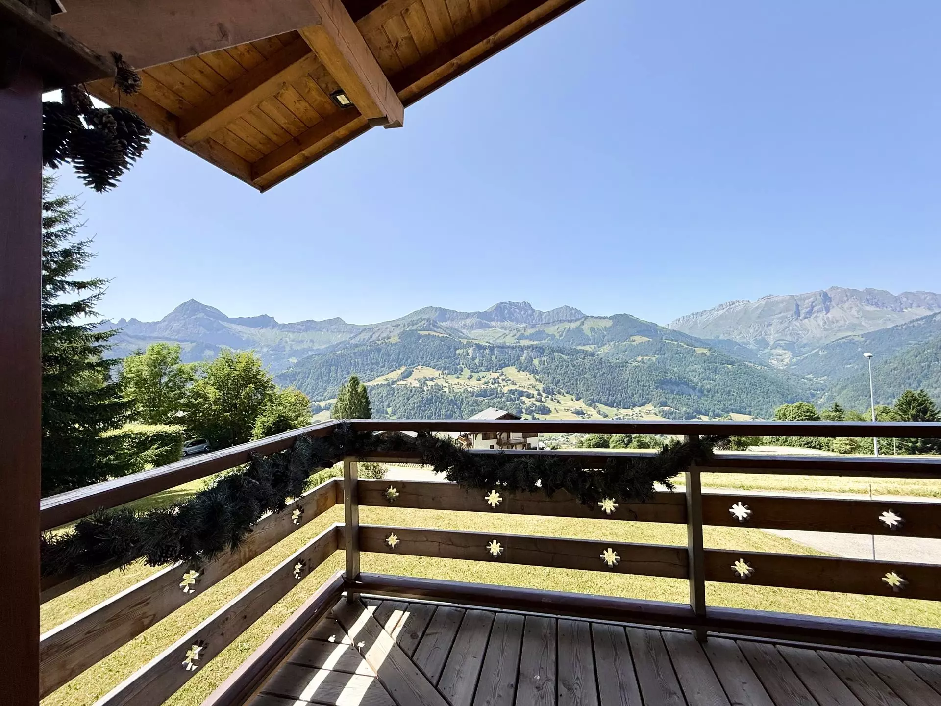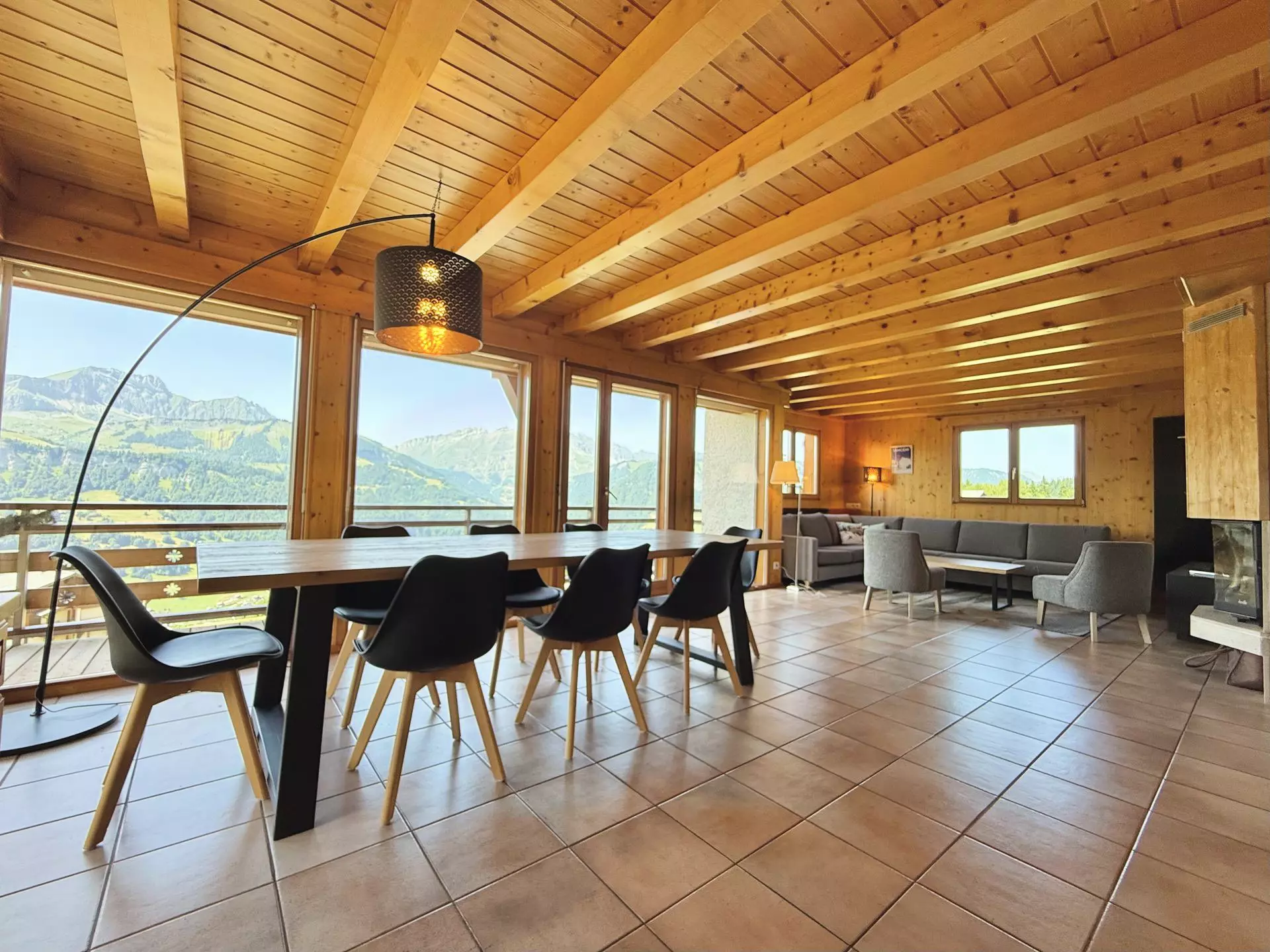 Le chalet bénéficie d'une bonne exposition et offre de somptueuses vues sur les chaines de montagnes allant du Mont Charvin à la chaine des Aravis.