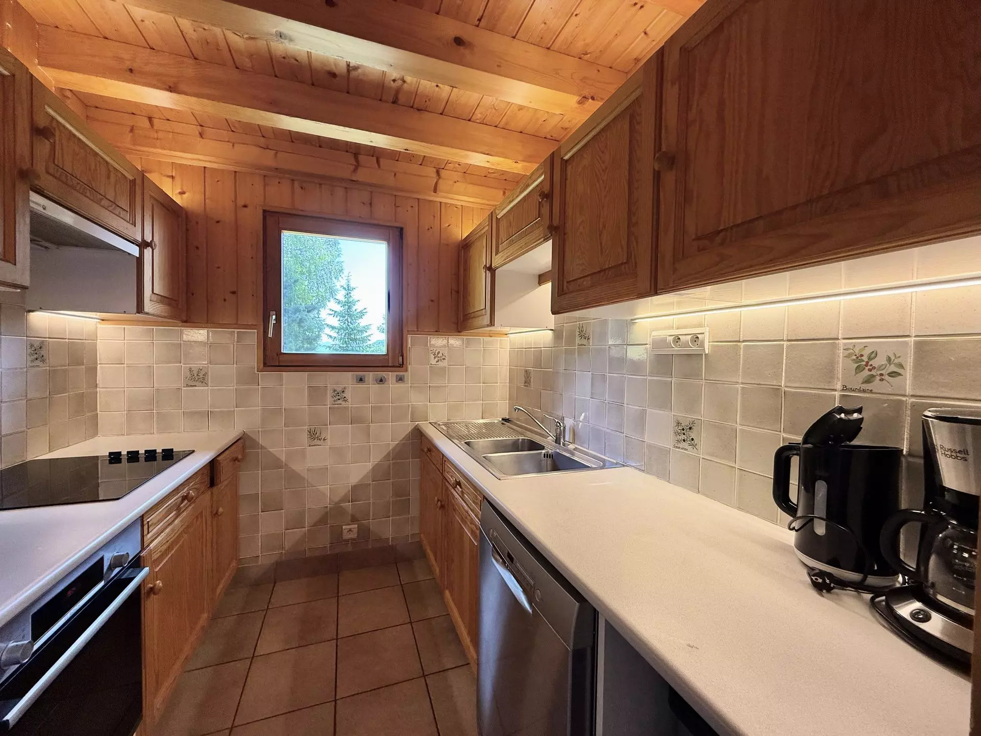 - Cuisine équipée ouverte sur séjour : plaque de cuisson avec 4 feux vitrocéramiques, un lave-vaiselle, une hotte, un réfrigirateur avec compartiment congélateur, un four et un micro-ondes.