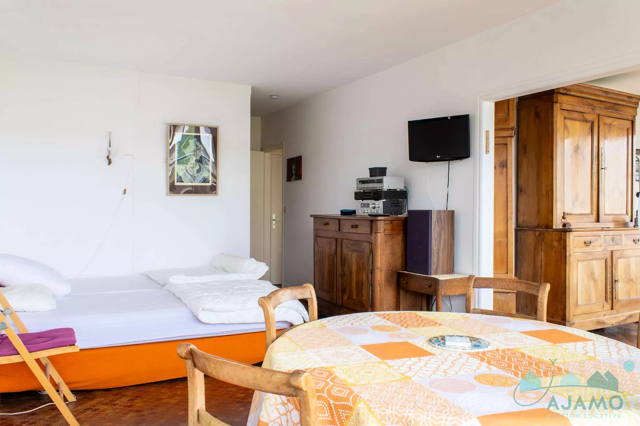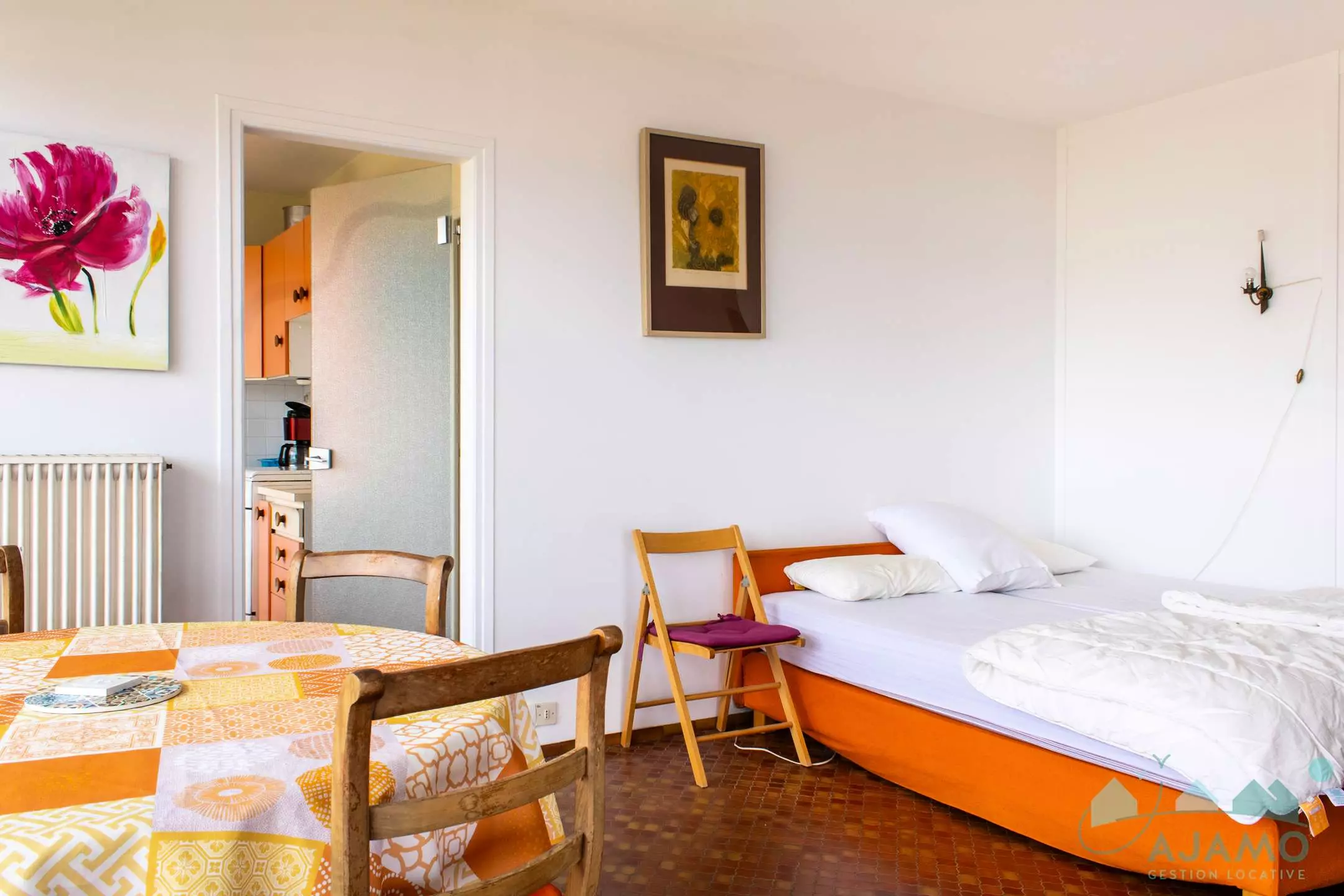 - Un salon séjour lumineux avec espace repas pour 4 personnes et 2 couchage (90x190cm) pouvant accueillir 2 personnes, faisant office de canapés ;