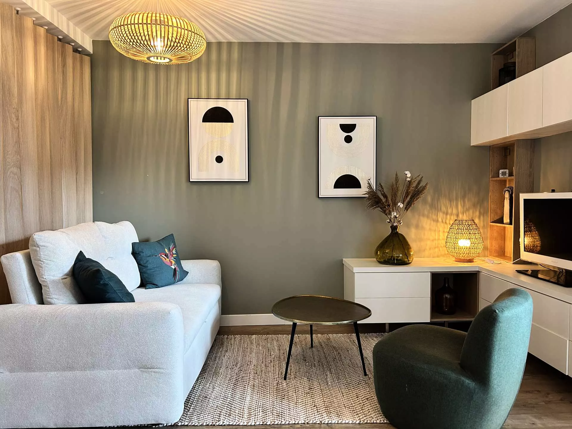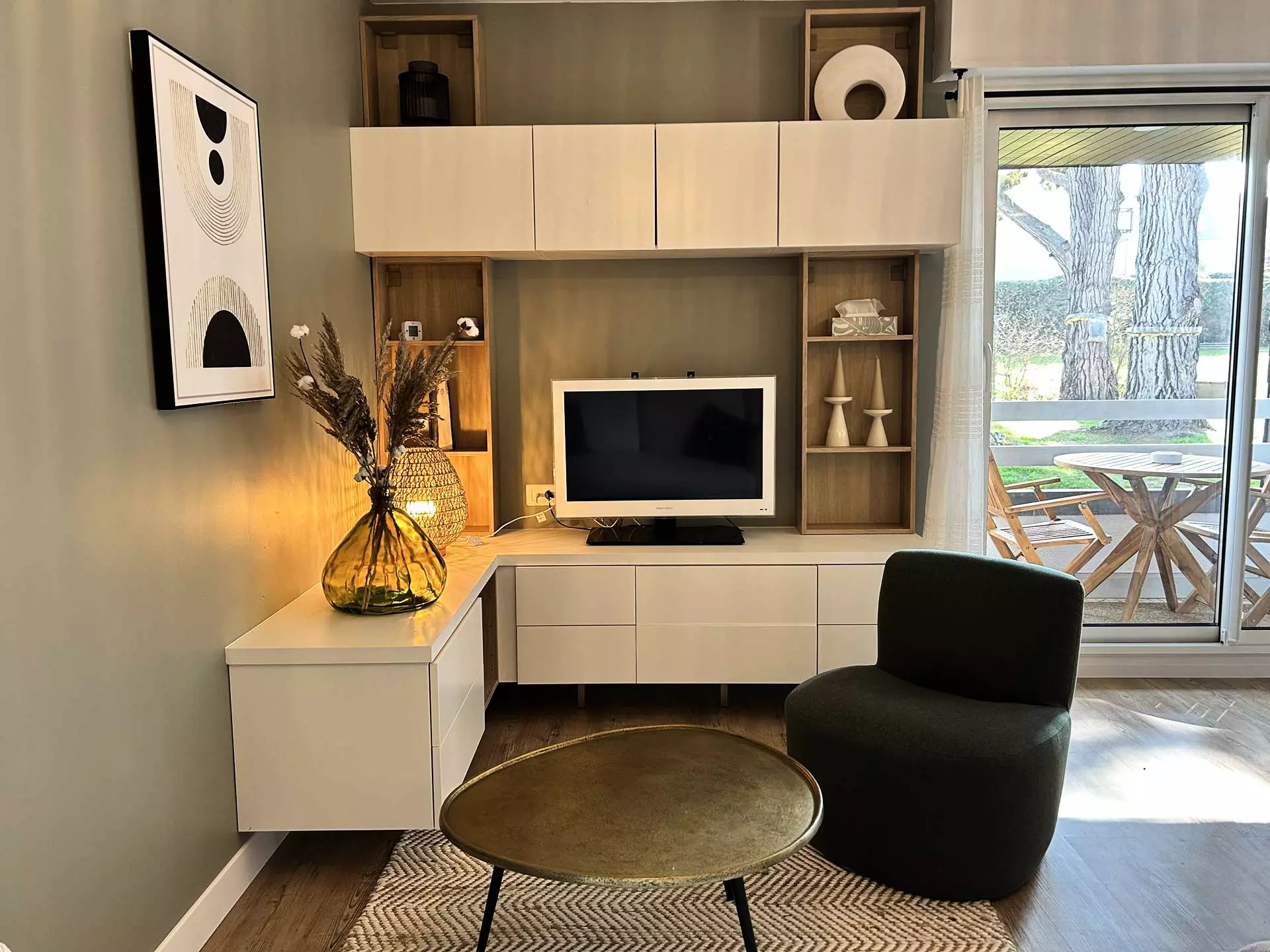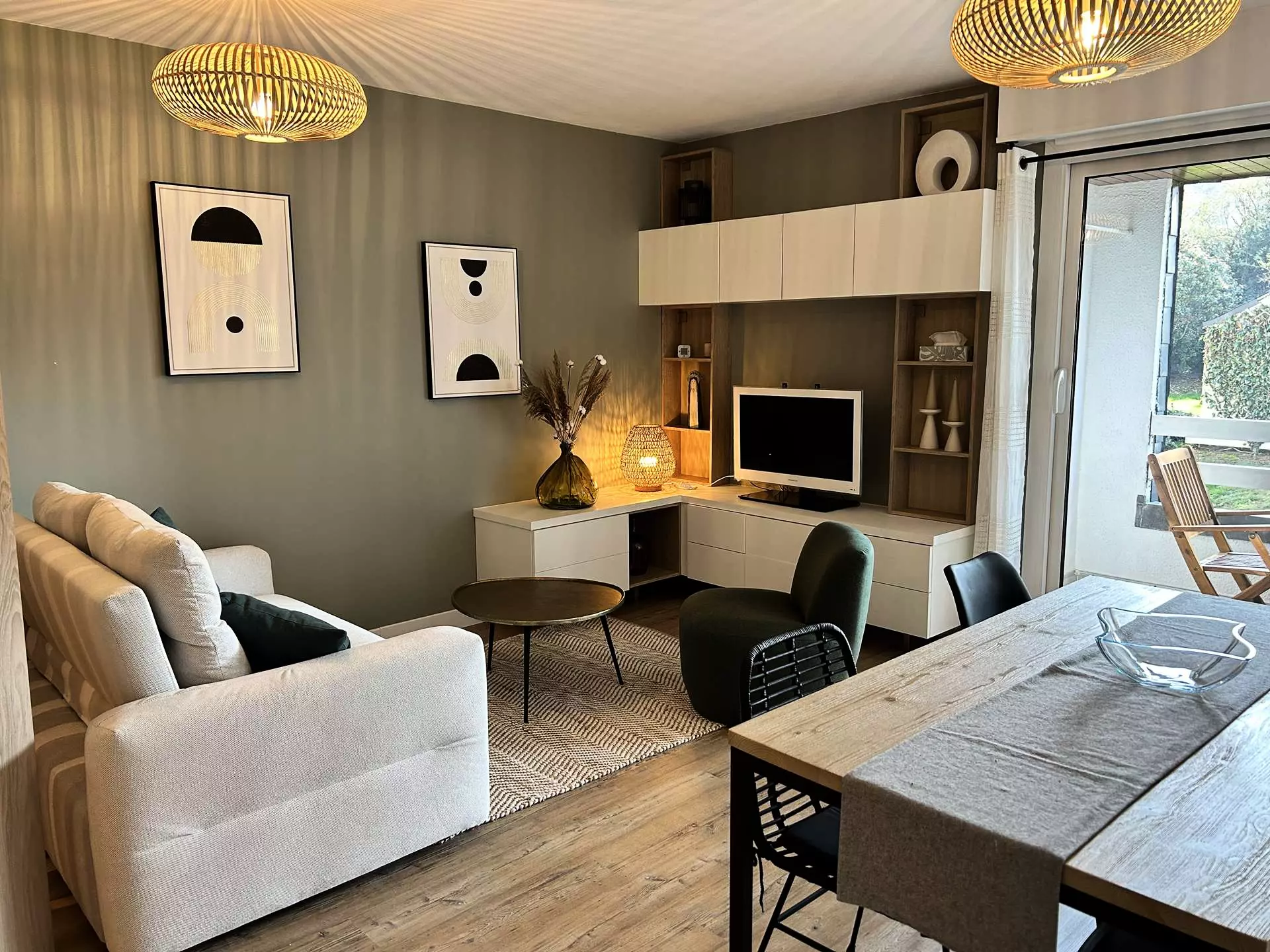 - Une pièce de vie avec espace salon (canapé, fauteuil, télévision, jeux de société), offrant un accès sur le balcon, ainsi qu'une table à manger pour 4 convives ;
