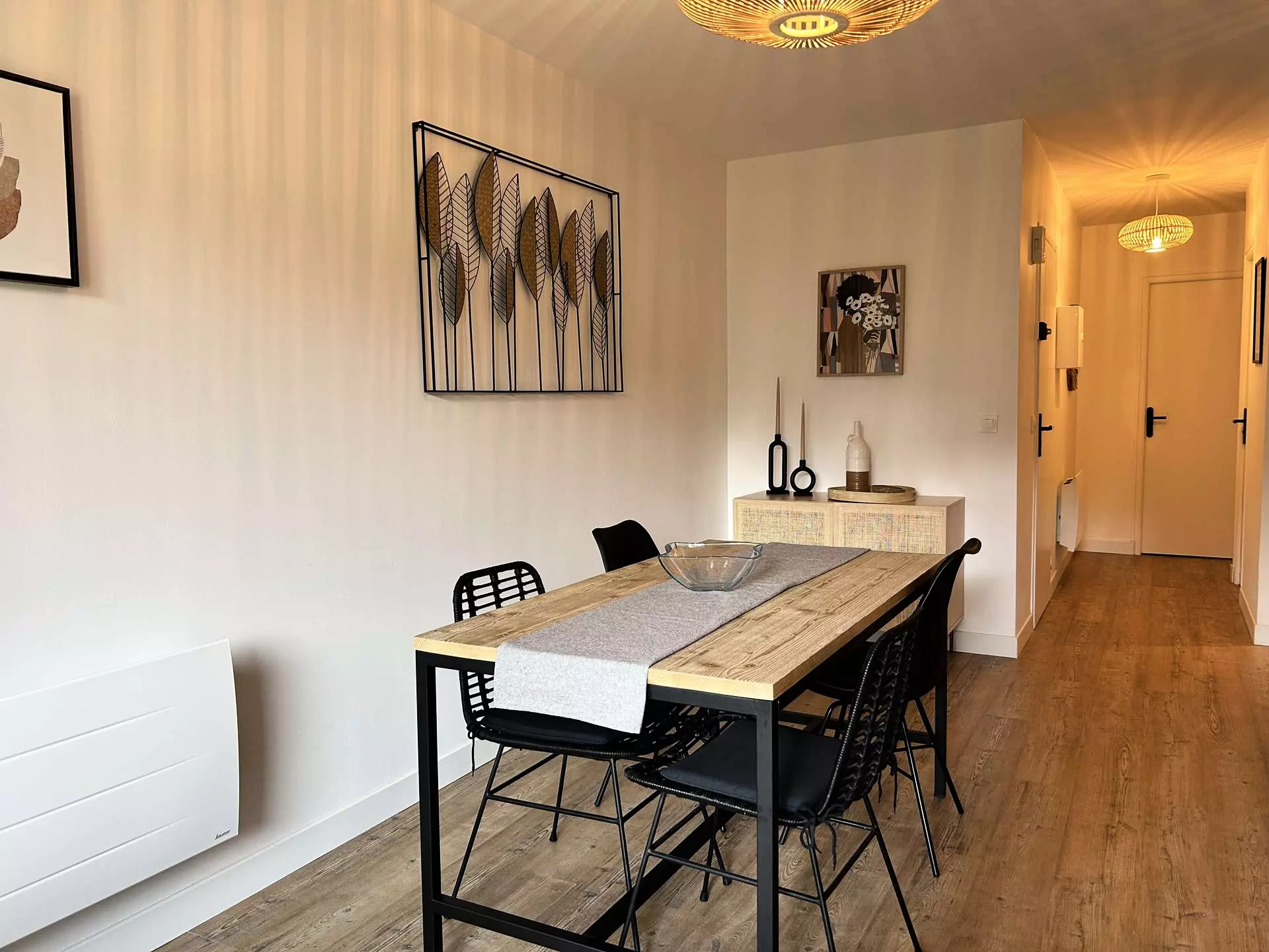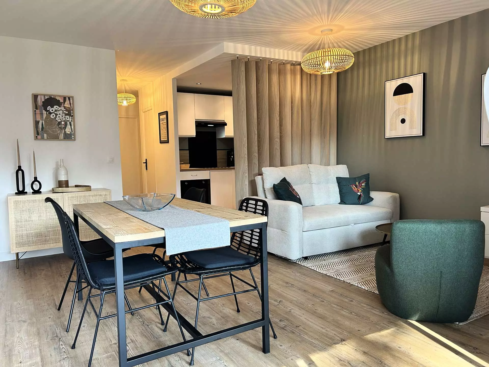 - Une cuisine ouverte sur la pièce de vie entièrement équipée avec : évier, plaques à induction 3 feux, hotte, four, réfrigérateur - congélateur, lave-vaisselle, cafetière Nespresso, bouilloire et grille-pain, ainsi que divers accessoires (essoreuse à salade, passoire, ustensiles, poêles, casseroles...) ;