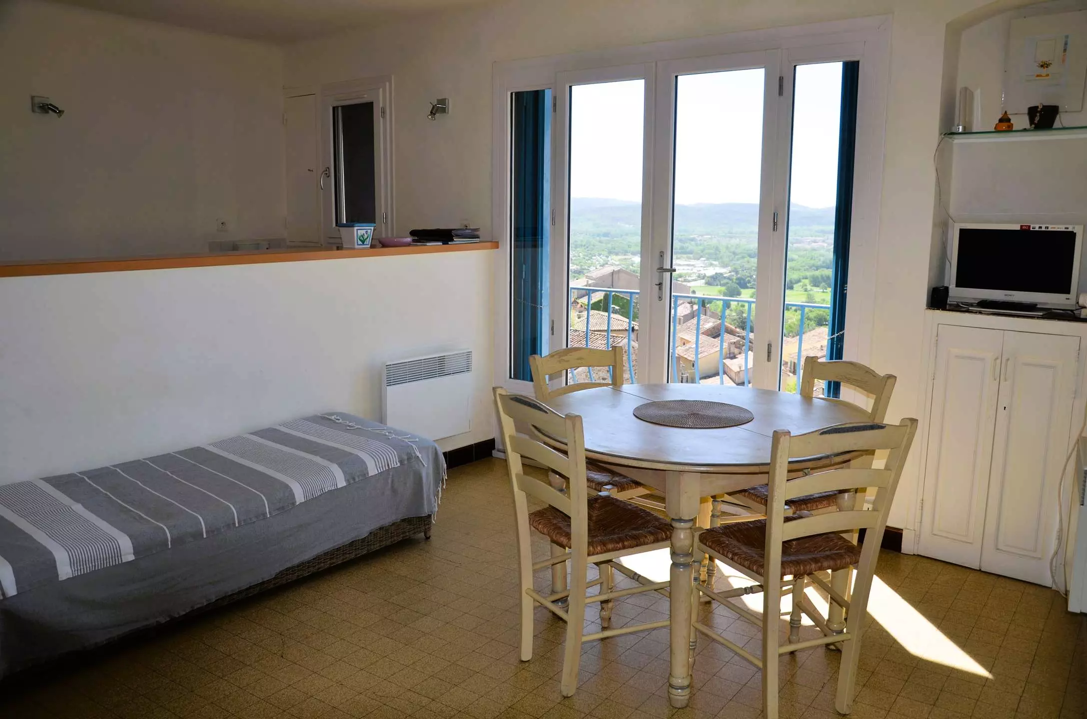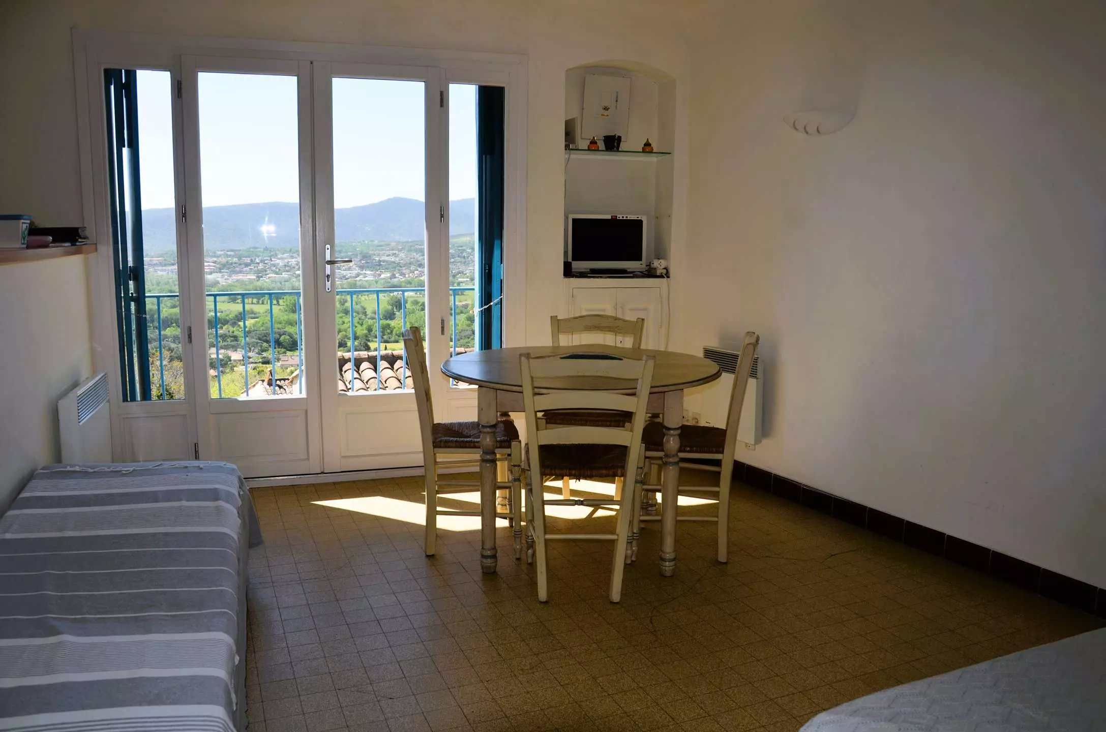 L'appartement situé au premier étage d'une maison est composé d'une entrée desservant une chambre double, une salle de douche avec WC, un séjour avec vue sur la campagne grimaudoise et une cuisine américaine.