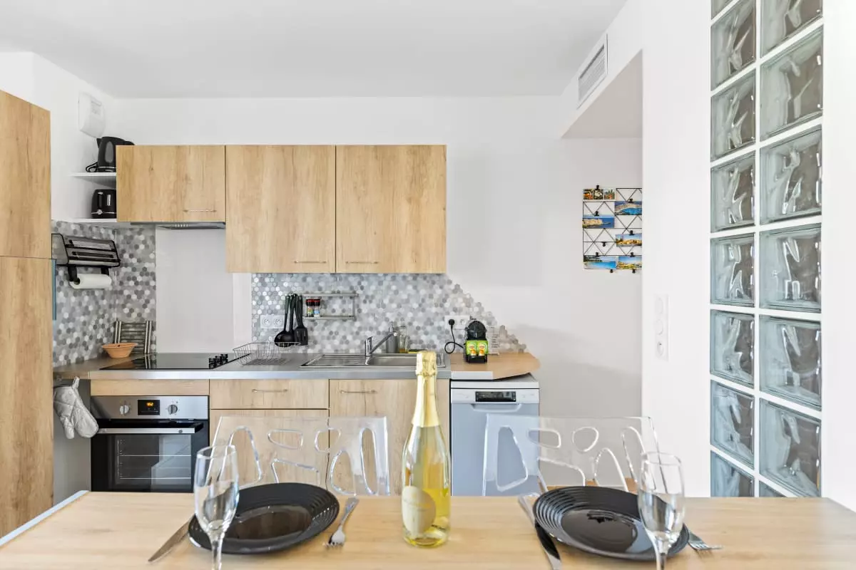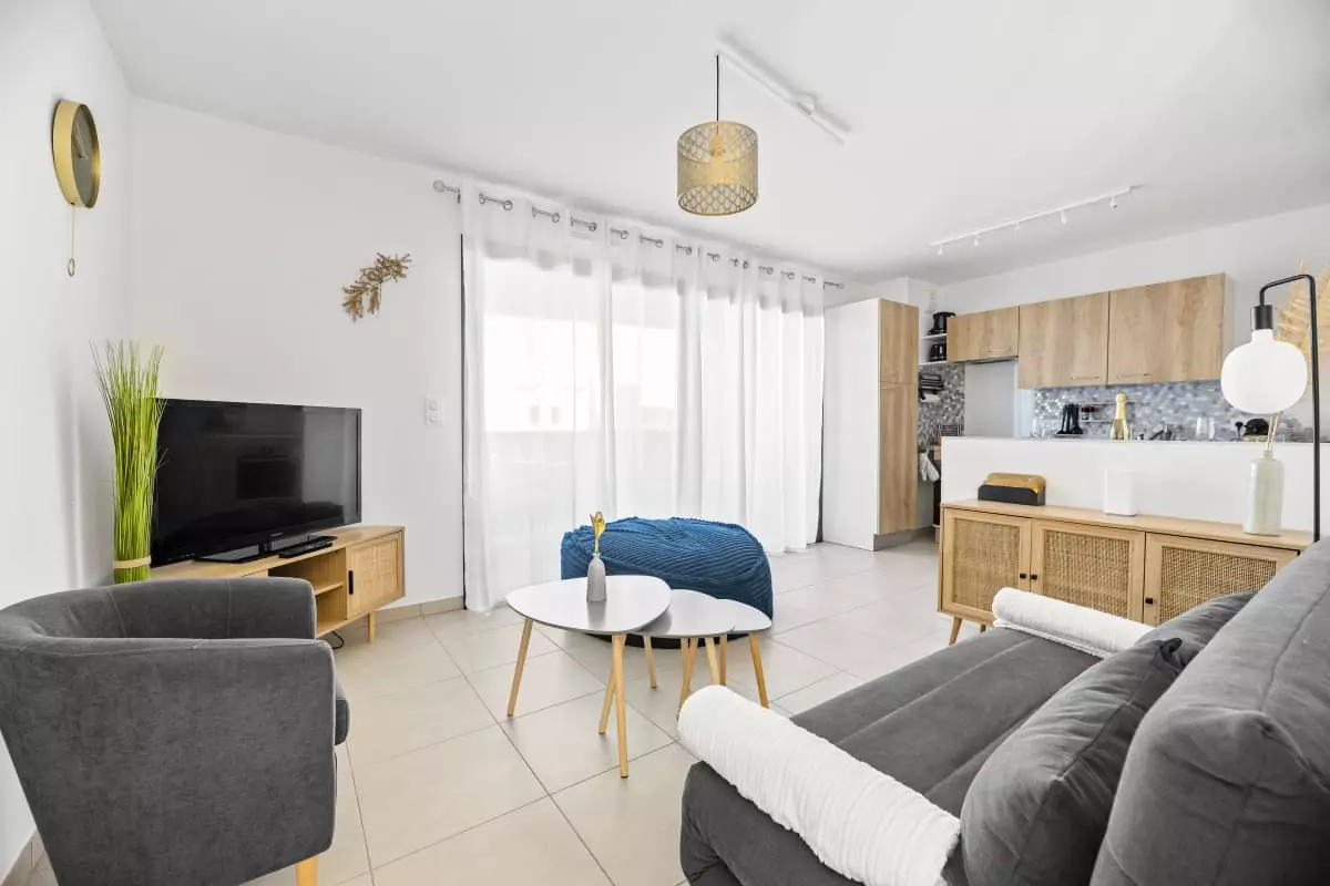 À l’intérieur, chaque détail a été pensé pour rendre votre séjour aussi agréable que possible. Le salon cosy, équipé d’un canapé 2 places et d’une TV, est l’endroit idéal pour vous détendre après une journée d’aventures, que ce soit à la plage ou sur les sentiers de randonnée. La cuisine, moderne et entièrement équipée (plaques vitrocéramiques, micro-ondes, machine à café Nespresso, réfrigérateur avec congélateur), vous permettra de préparer de délicieux repas à savourer en toute simplicité.