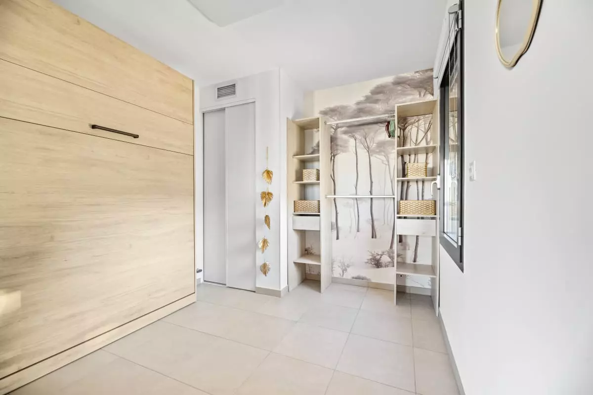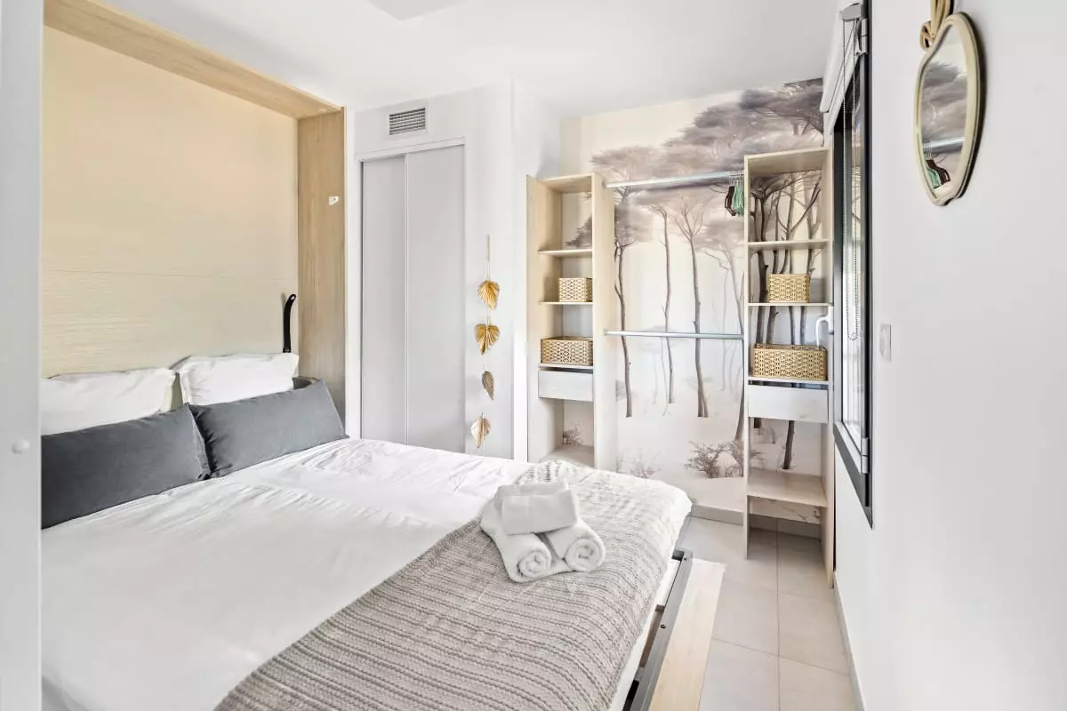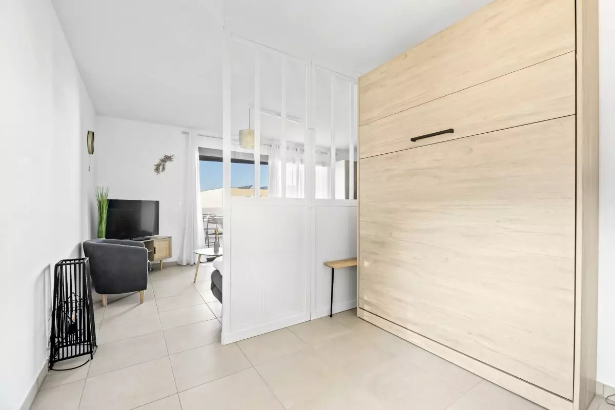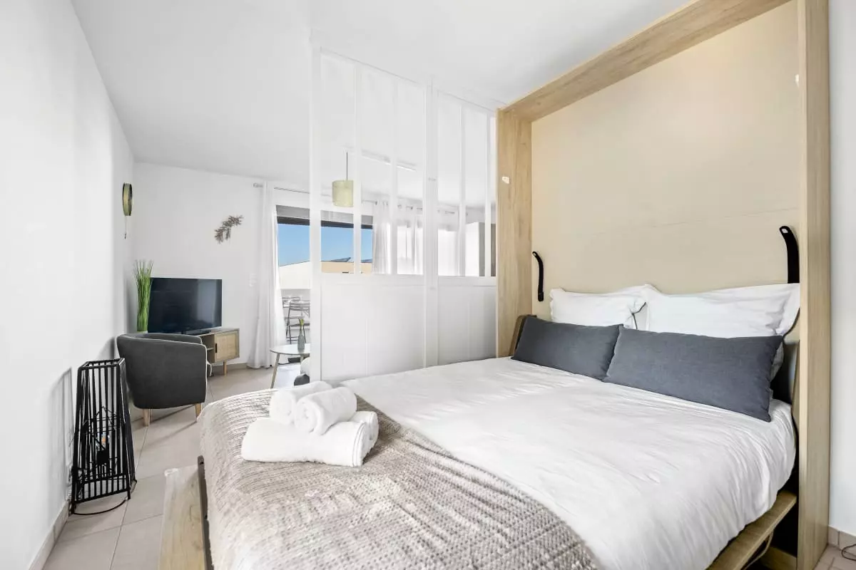 L’espace nuit climatisé vous accueille avec un lit double escamotable (140x200 cm) et des rangements pratiques pour vous sentir comme chez vous. La salle de bain, élégante et fonctionnelle, offre une douche, un WC suspendu et un sèche-serviettes design, avec des serviettes incluses pour votre confort. Une machine à laver, un défroisseur et un étendoir à linge sont également à votre disposition.