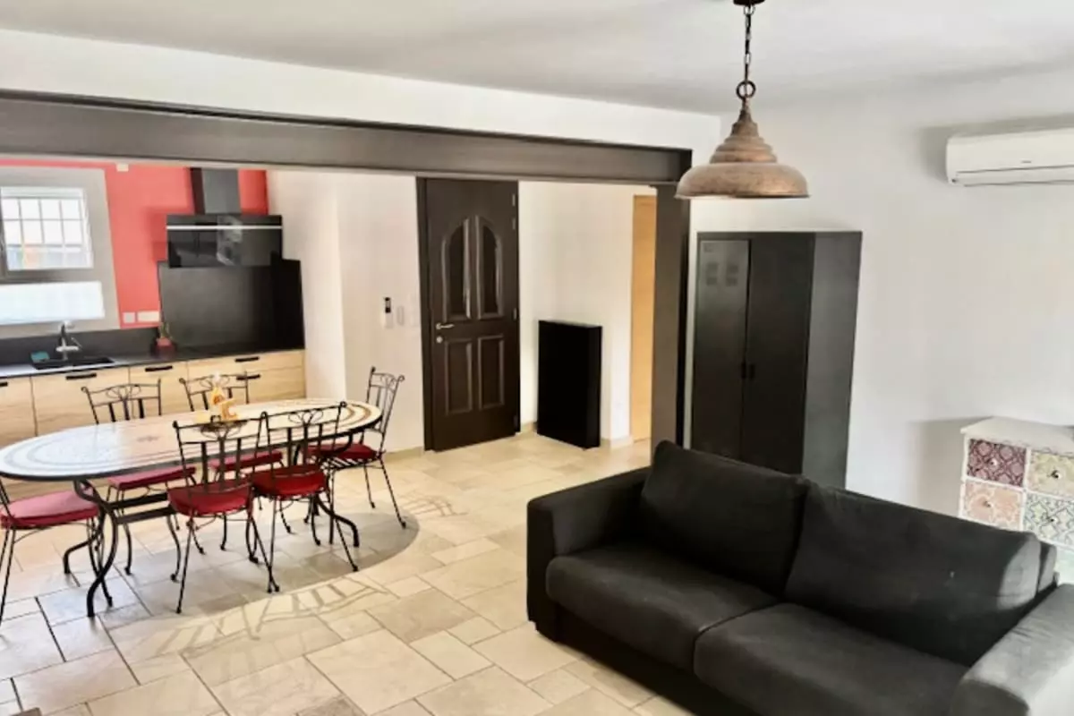 La maison se compose d’une entrée donnant sur une cuisine entièrement équipée, un espace dinatoire ainsi qu’un coin salon baigné de lumière et avec un accès direct sur le jardin.