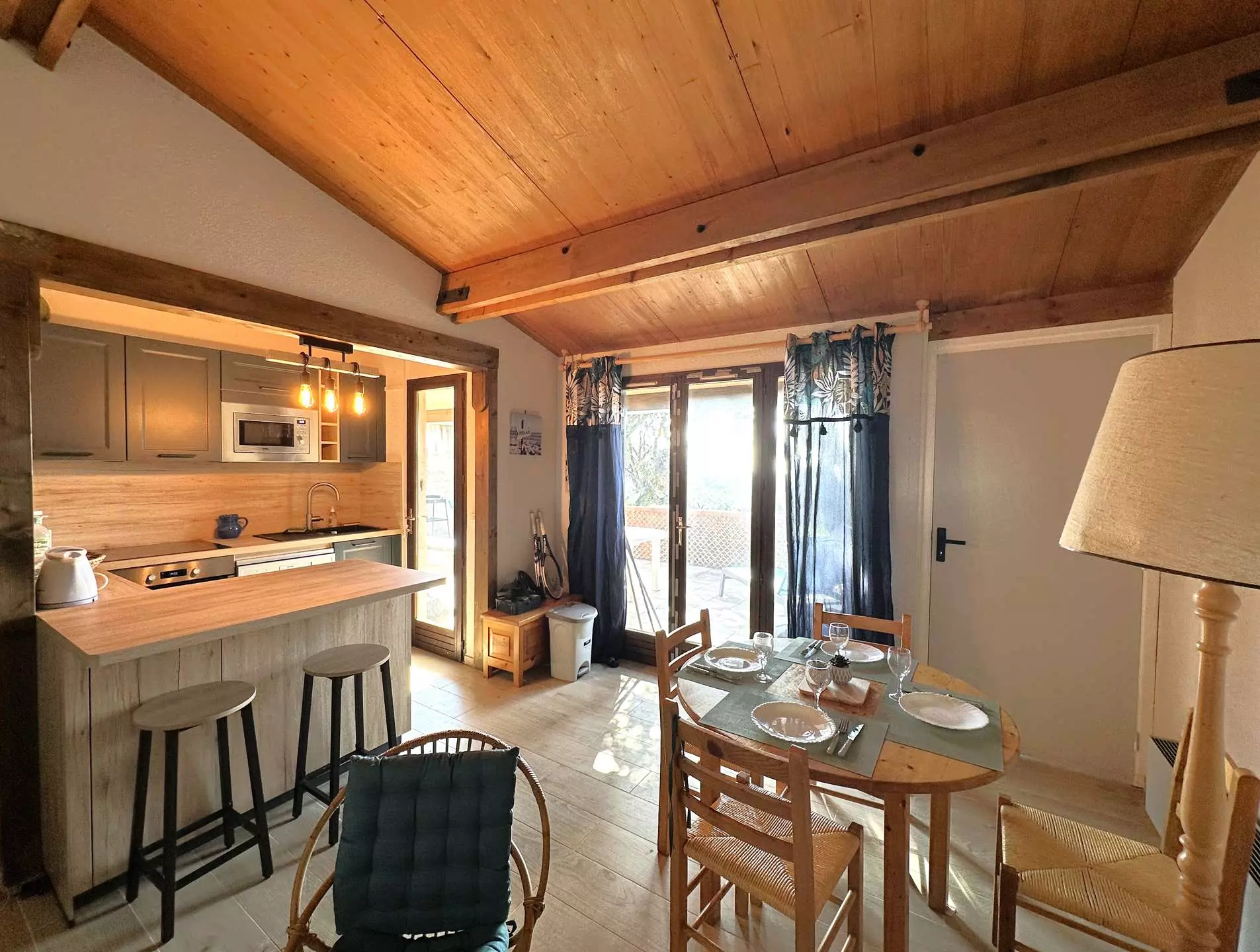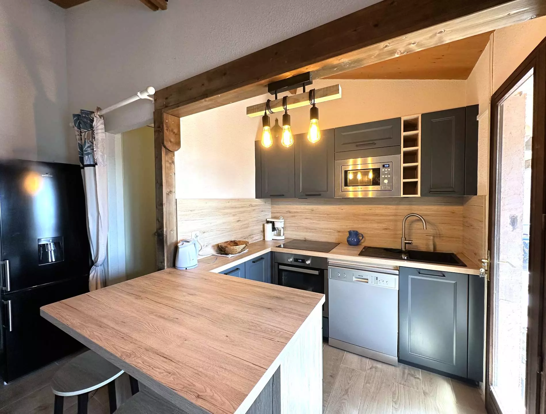 Une jolie cuisine ouverte, entièrement équipée (four, plaque à induction 3 feux, réfrigérateur combiné, micro-ondes, cafetière filtre, bouilloire, lave-vaisselle).