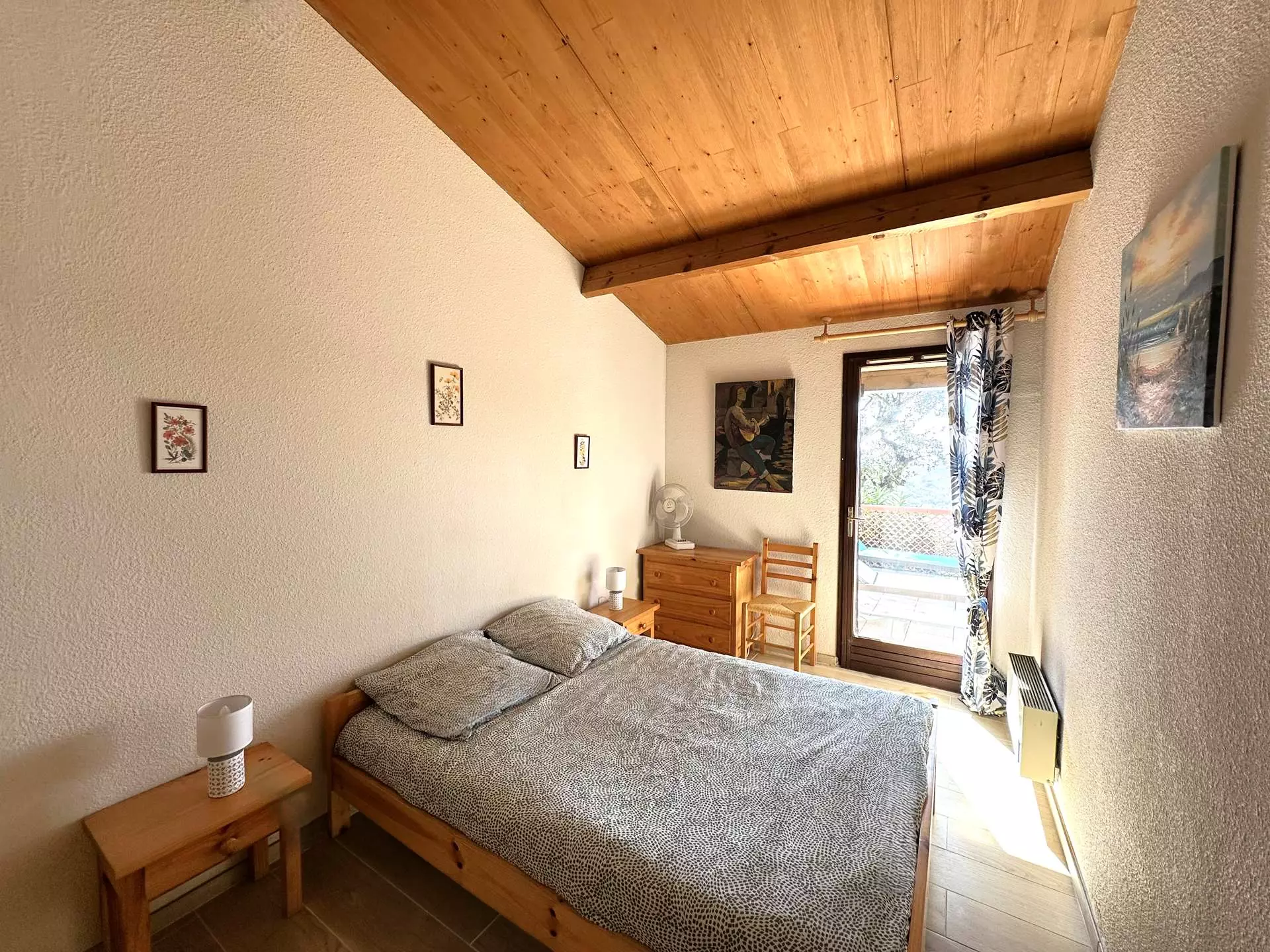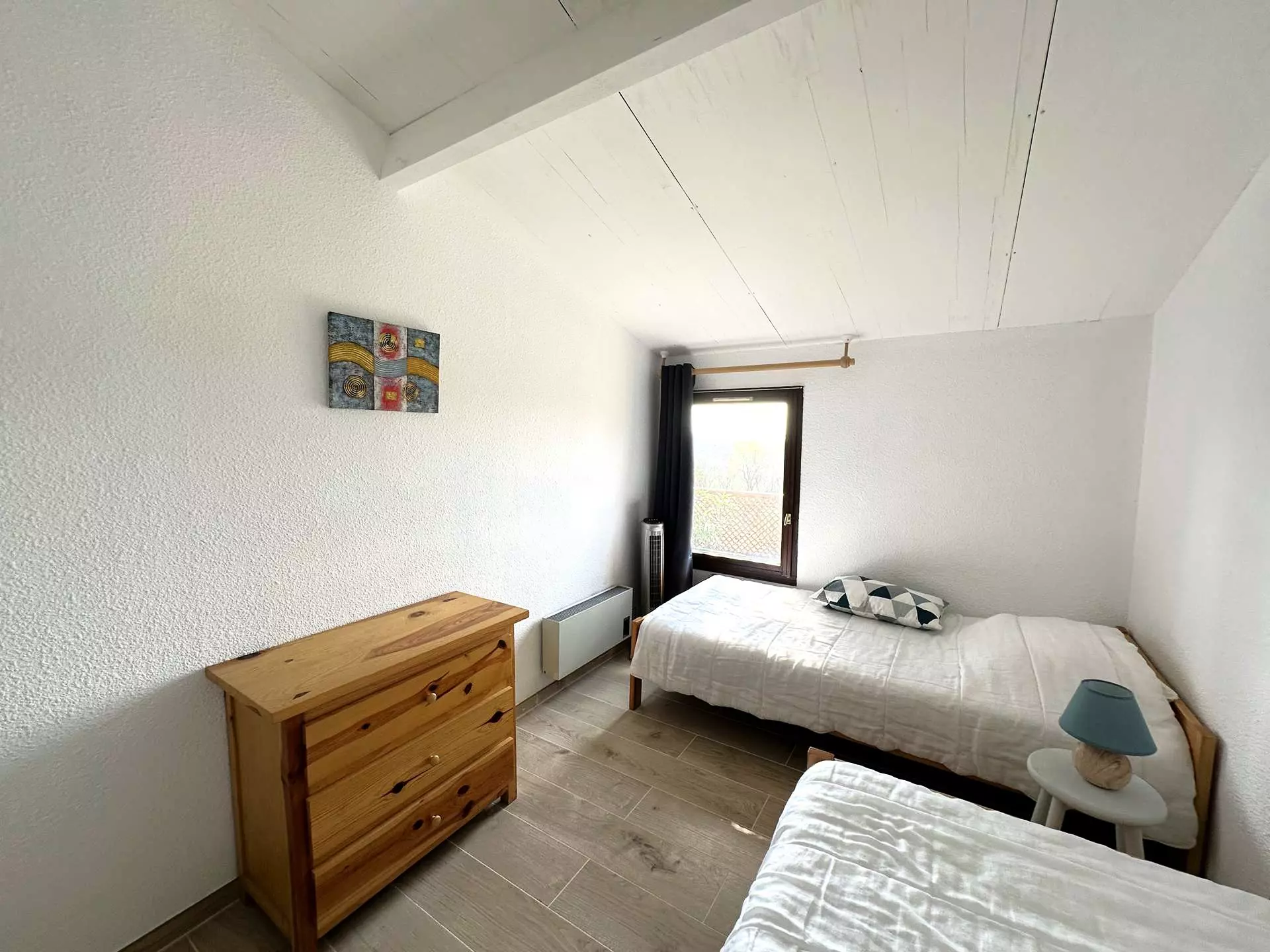 L'espace nuit se compose d'une chambre double avec un lit en (140x200 cm) donnant directement sur la terrasse, ainsi qu'une seconde chambre avec deux lits simples (80x190 cm).