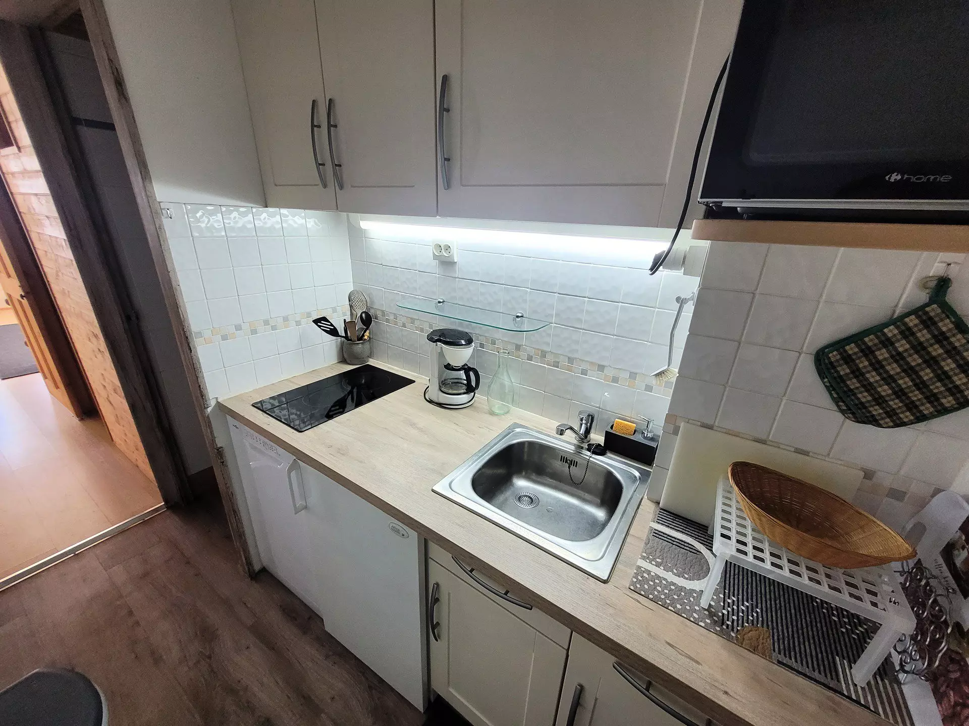 La cuisine, située dans l'entrée, est équipée d'un micro-ondes, de 2 plaques électriques, d'un réfrigérateur top et d'un lave-vaisselle.
