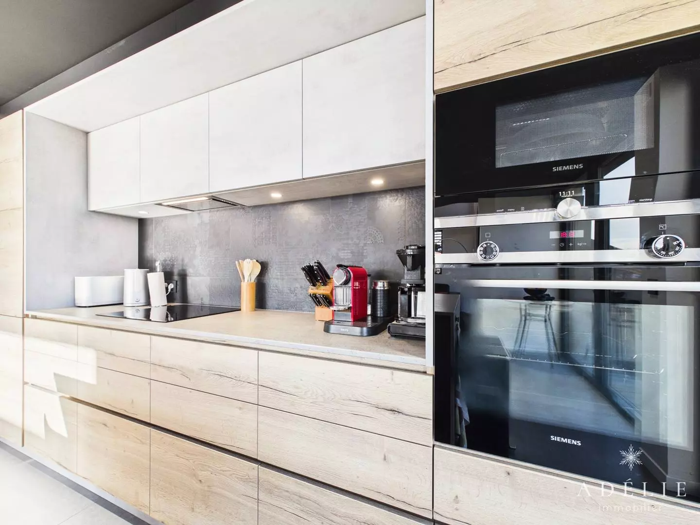 Cuisine américaine complètement équipée : plaques induction, réfrigérateur et congélateur, lave vaisselle, four, micro-ondes.