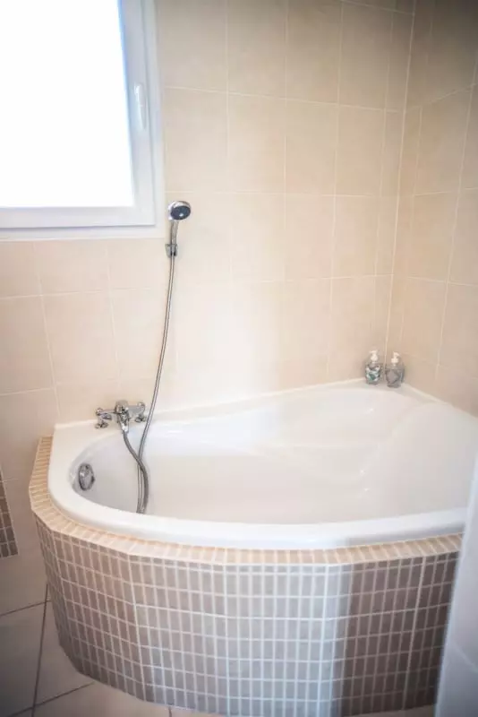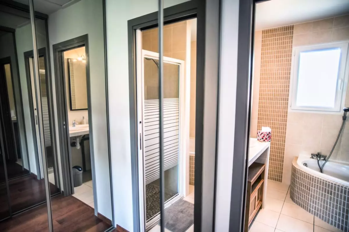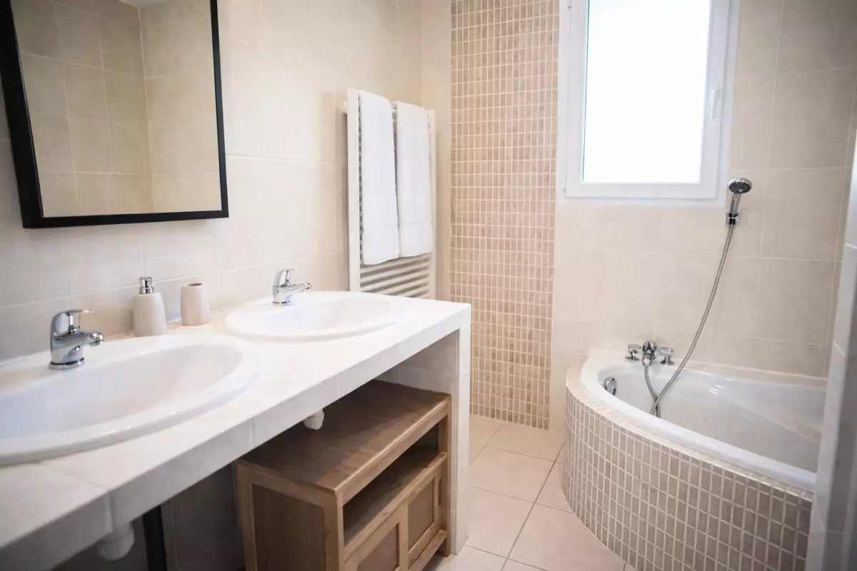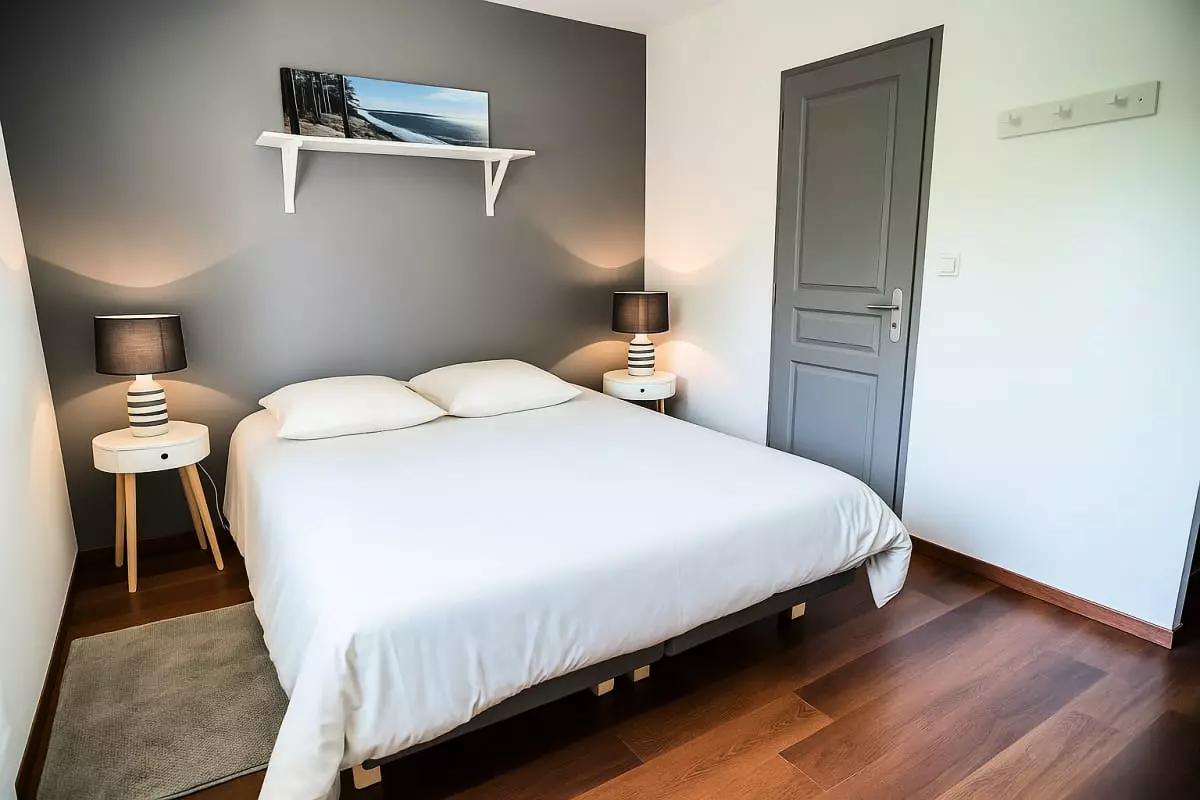-Deux chambres au rez-de-chaussée, avec lits de 160 cm et 140 cm, partageant une salle de bain avec baignoire.