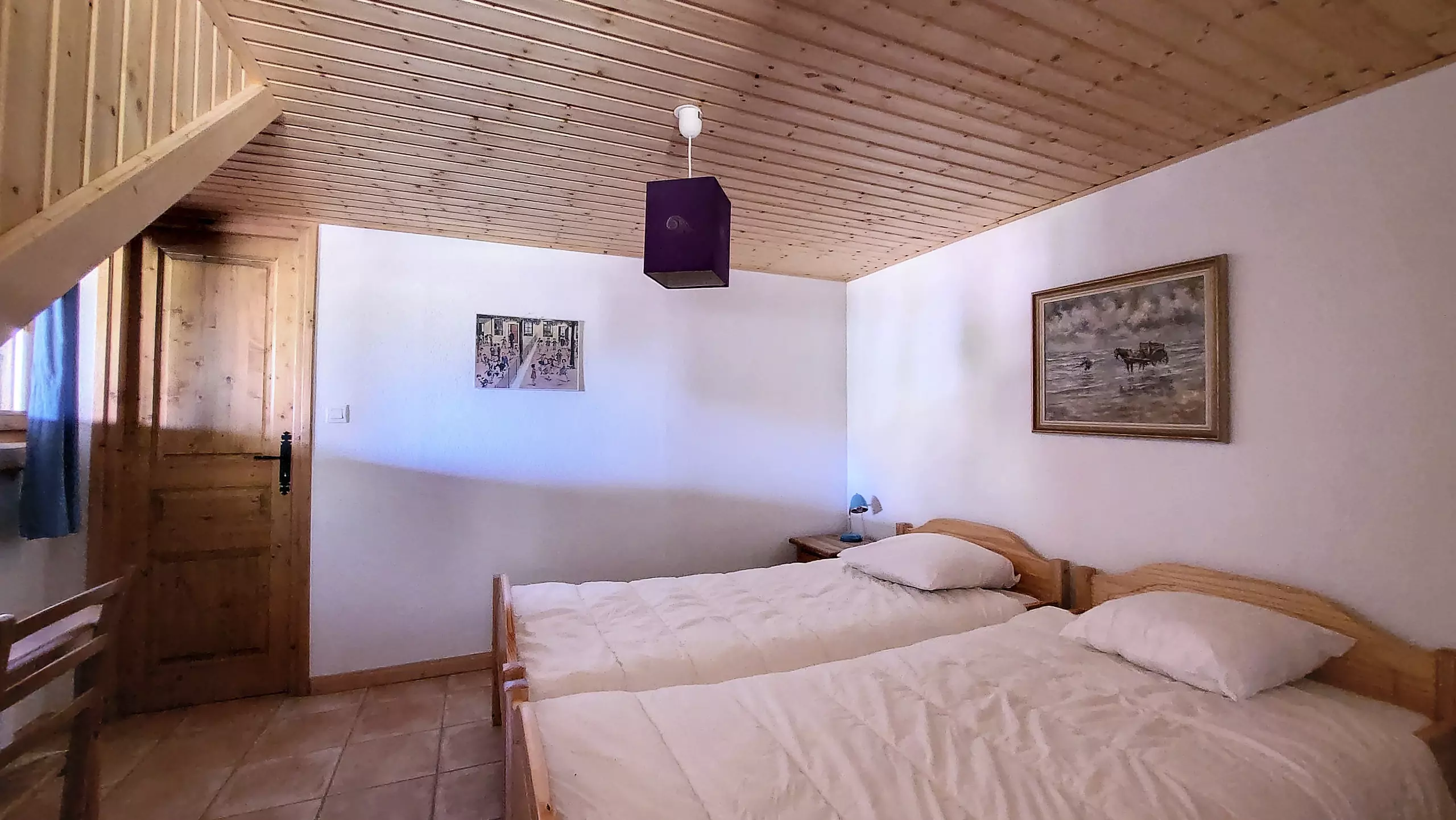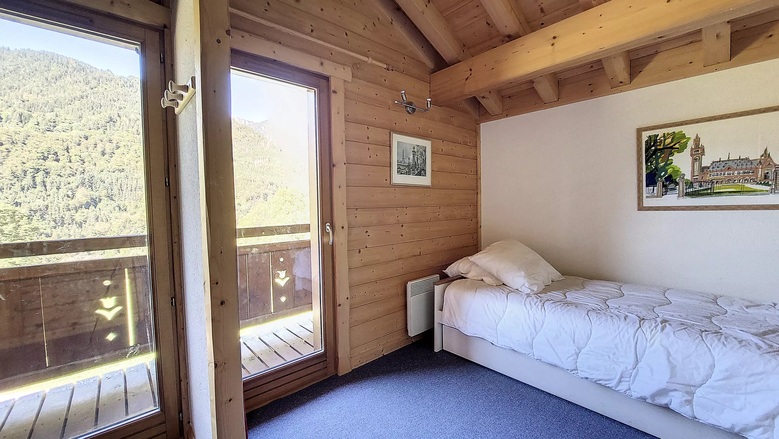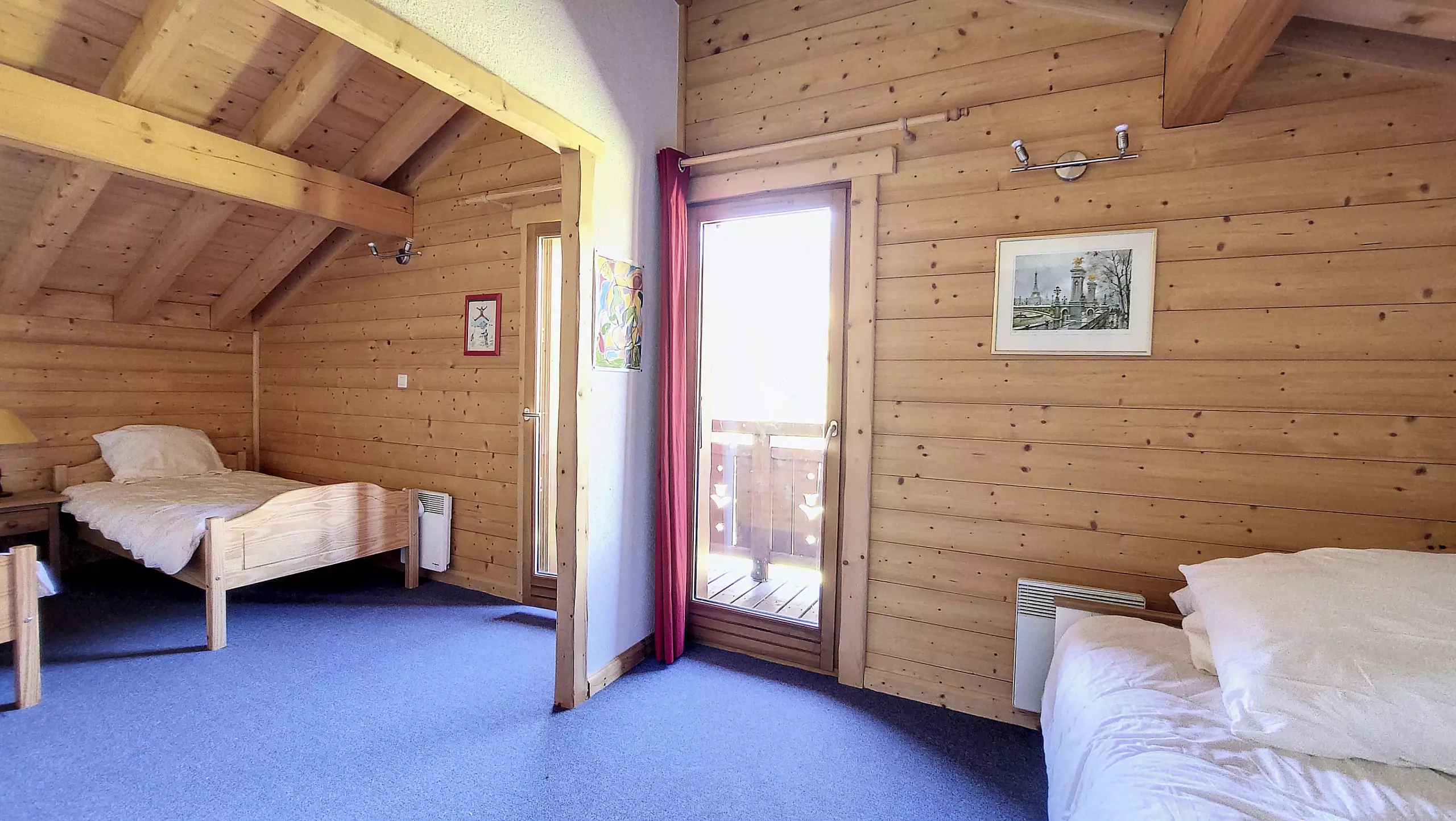 - 3ème chambre : Grande chambre mansardée, avec 2 lits simples, canapé, commode, 2 portes fenêtres donnant accès à un balcon exposé OUEST avec sublimes vues sur les montagnes