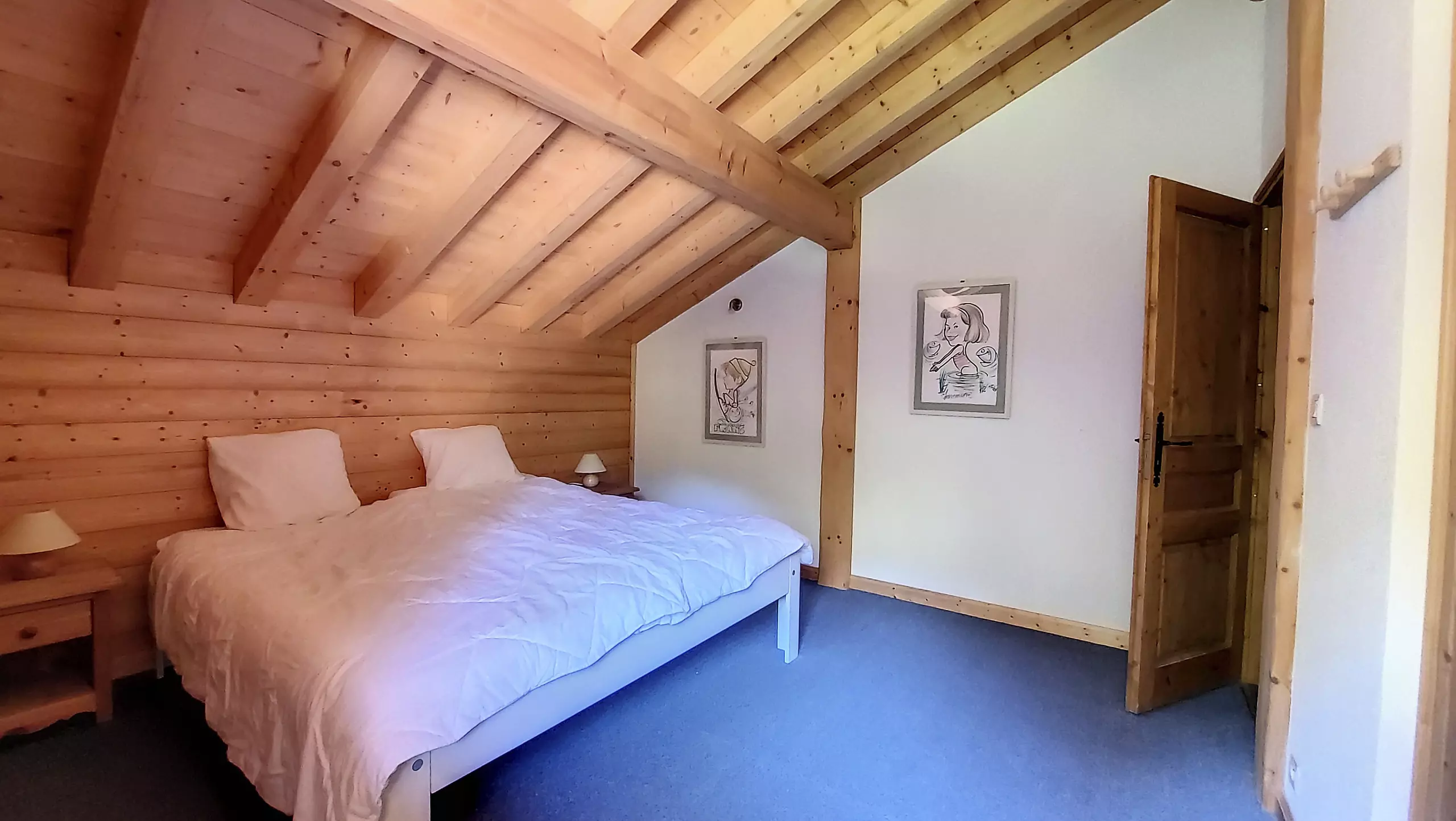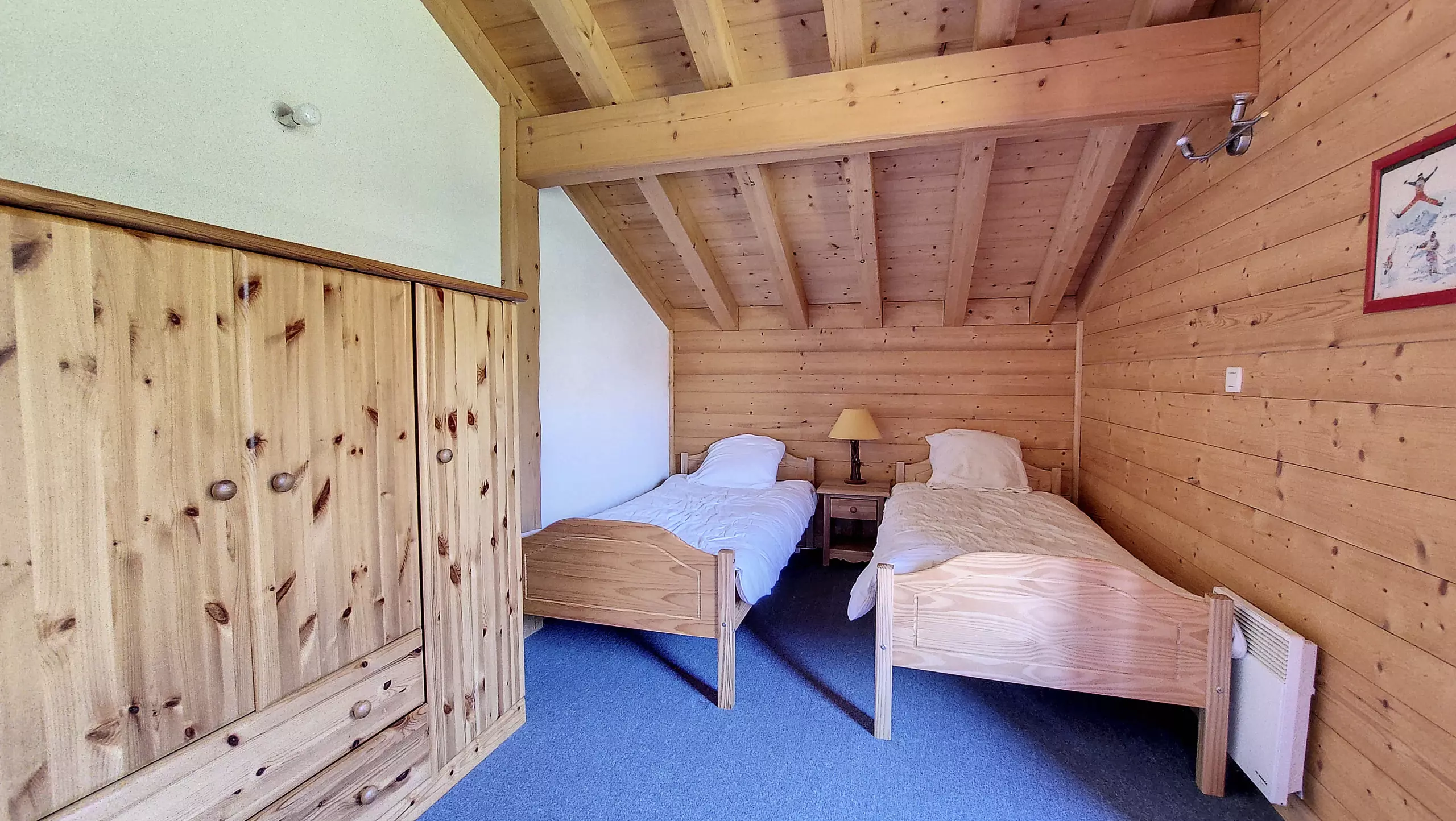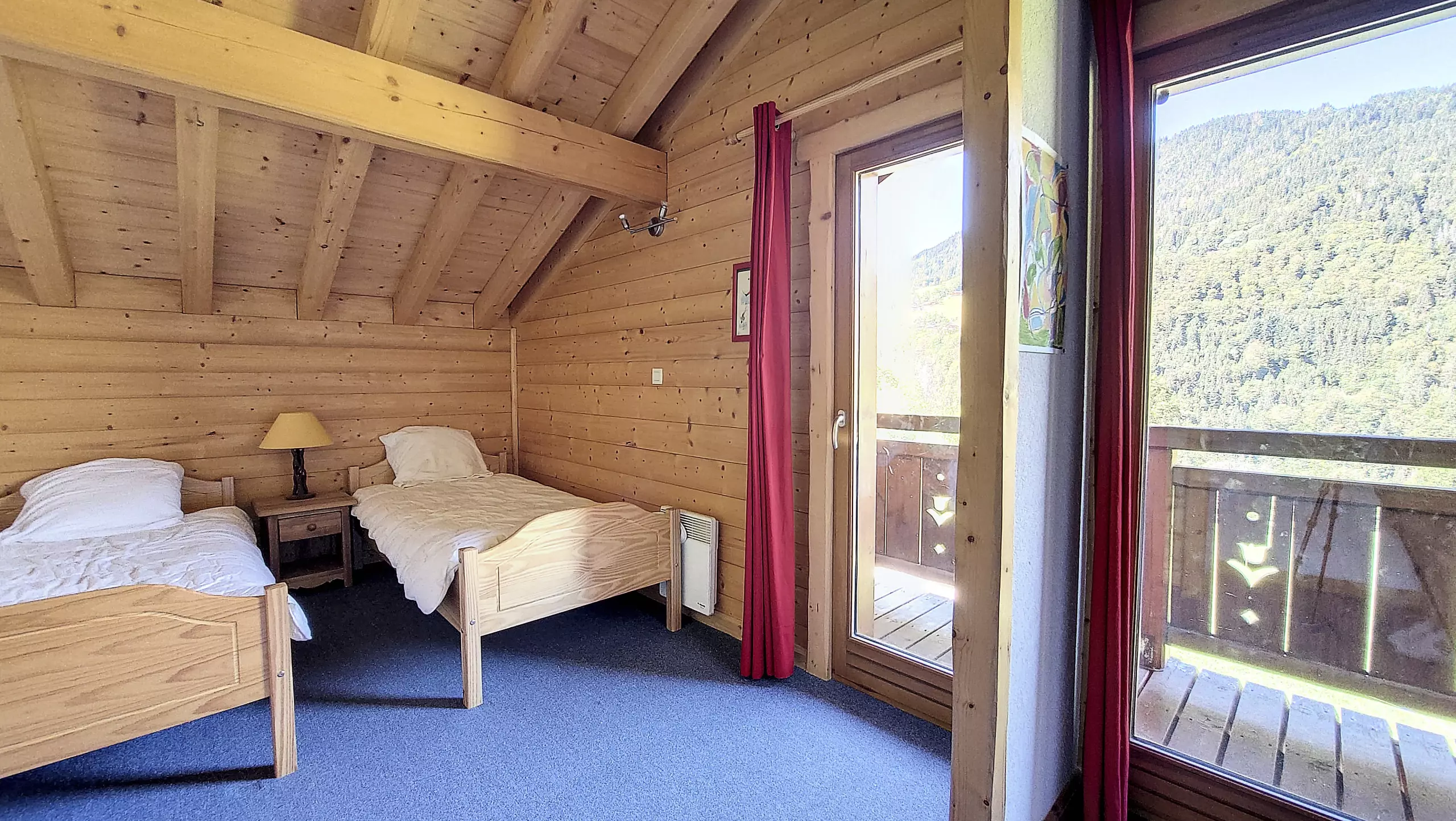 - 3ème chambre : Grande chambre mansardée, avec 2 lits simples, canapé, commode, 2 portes fenêtres donnant accès à un balcon exposé OUEST avec sublimes vues sur les montagnes