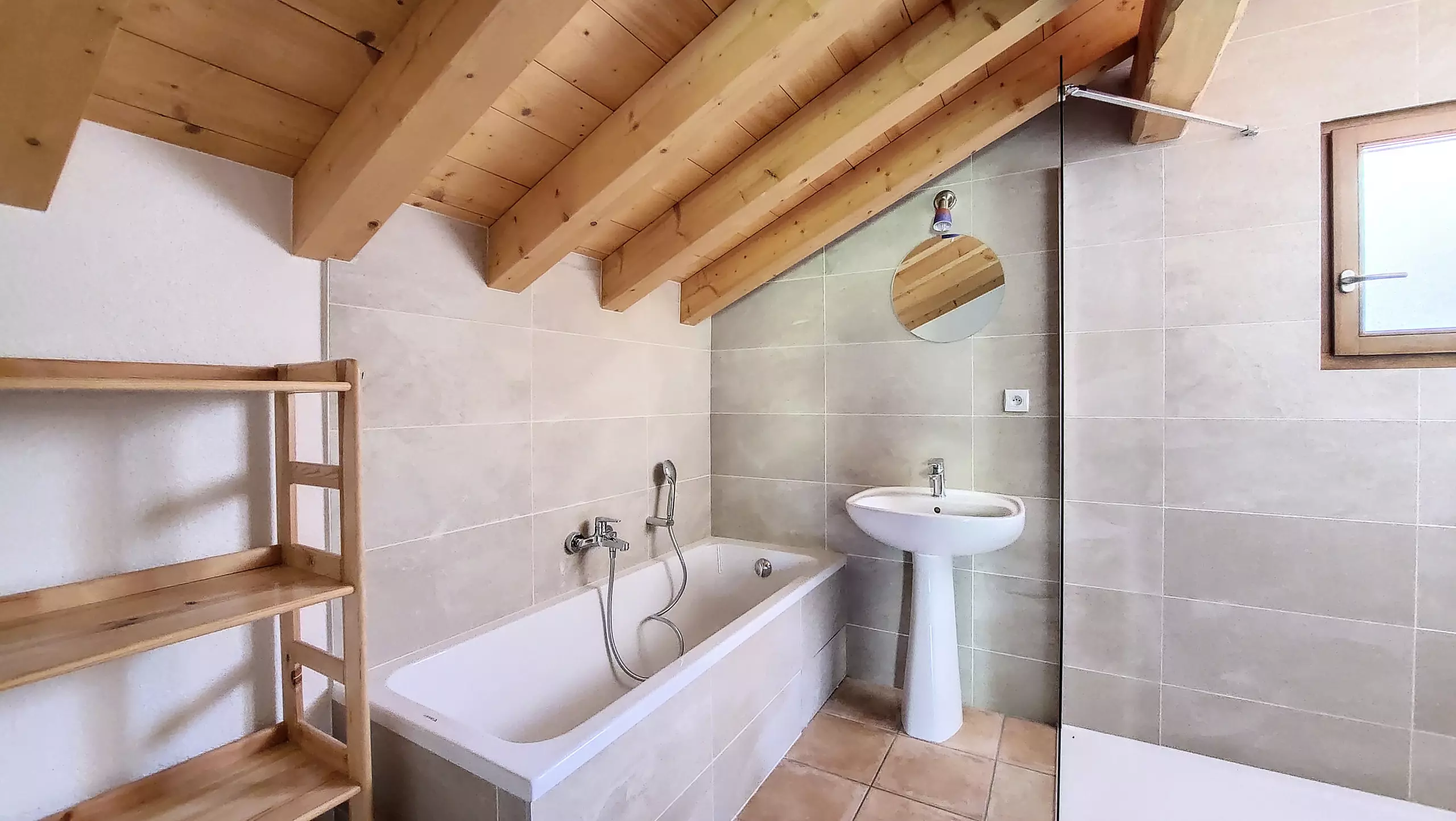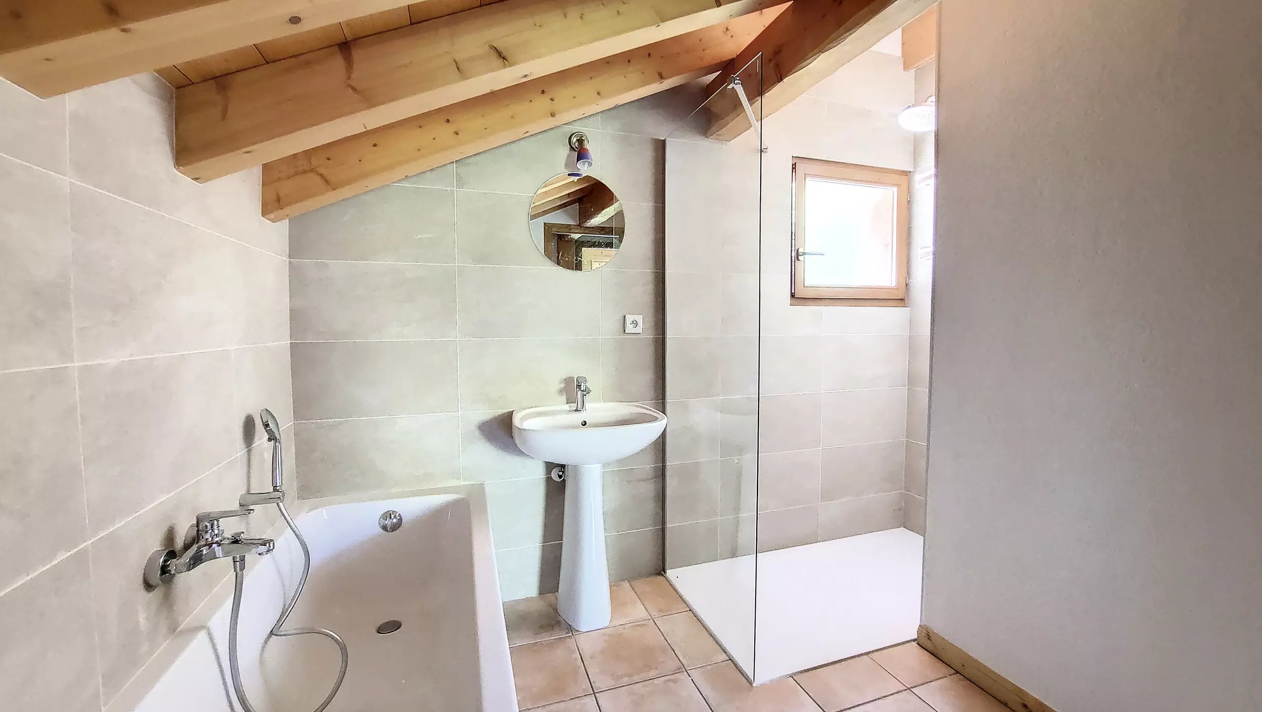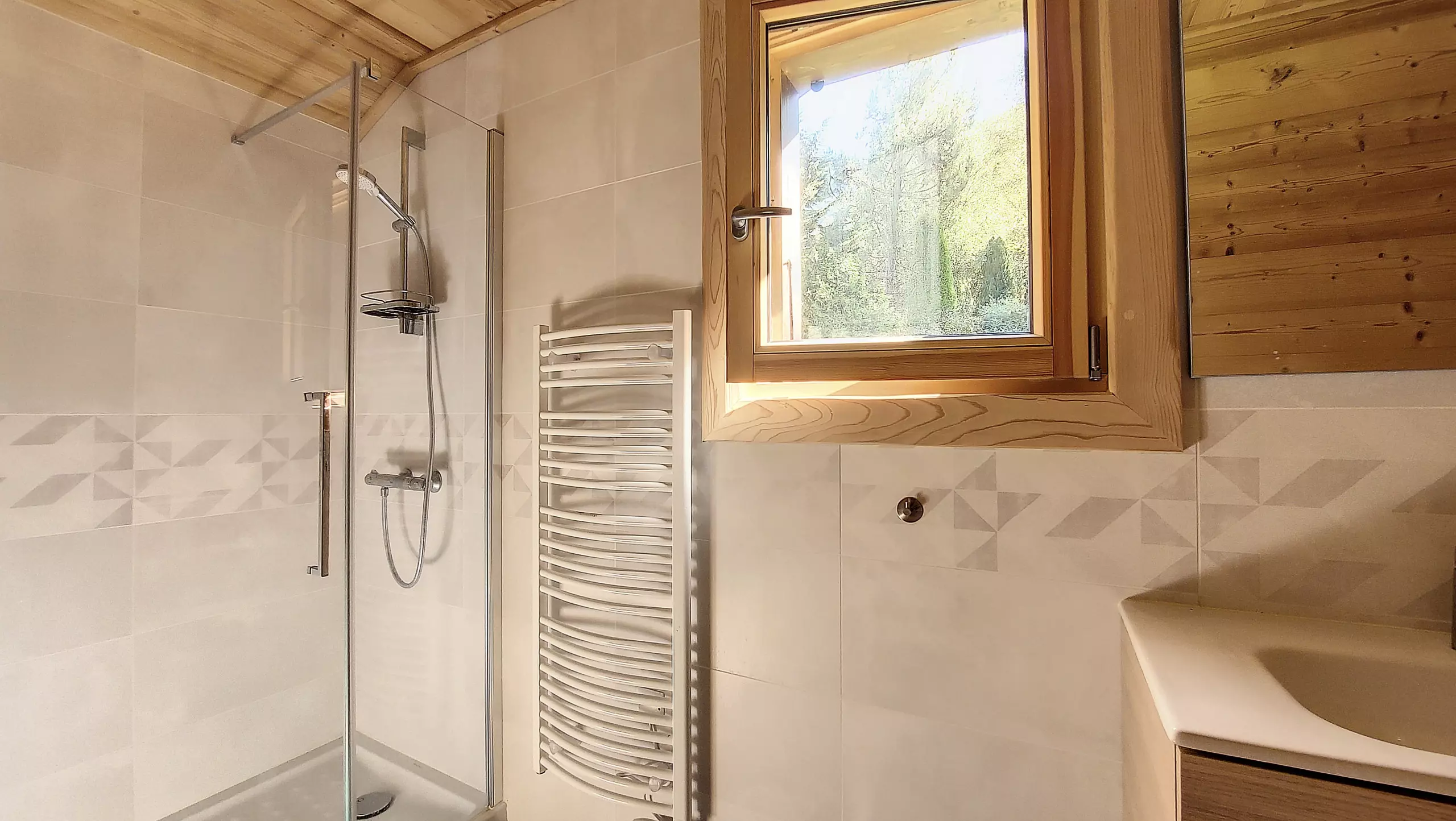 - Une salle de bain familiale et moderne (récemment rénové) avec bain, douche à l’italienne, vasque, rangement, sèche serviettes et fenêtre