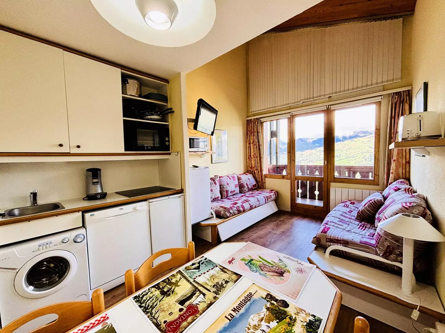 Cet appartement 2 pièces de 28 m², est situé au 4ème étage (accès direct niveau passerelle) et est équipé pour 5 personnes. Il comprend :