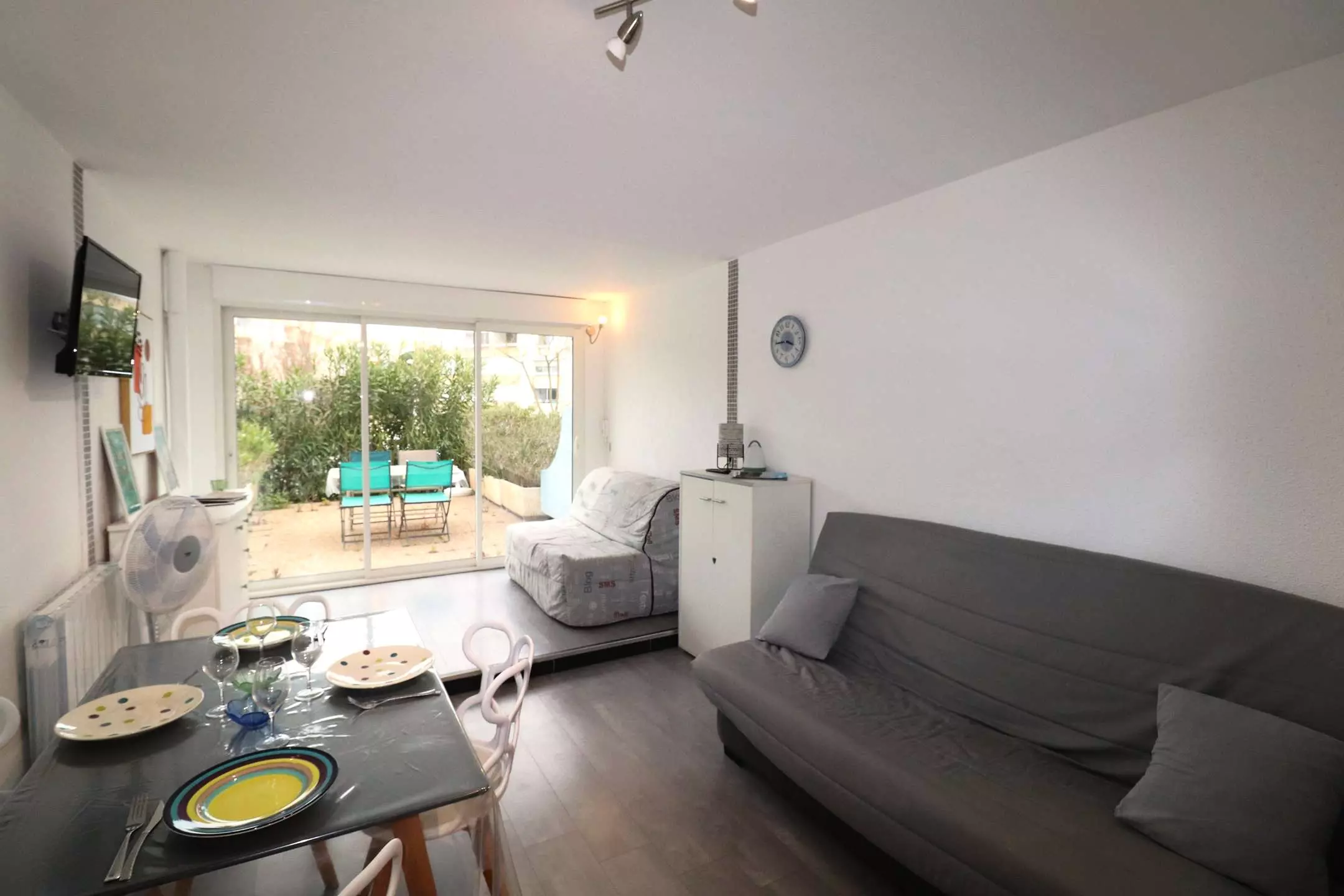 Résidence FLORALIES 2 – 1 pièce + cabine, avec une grande terrasse en rez-de-chaussée exposée sud-ouest, donnant sur les jardins.