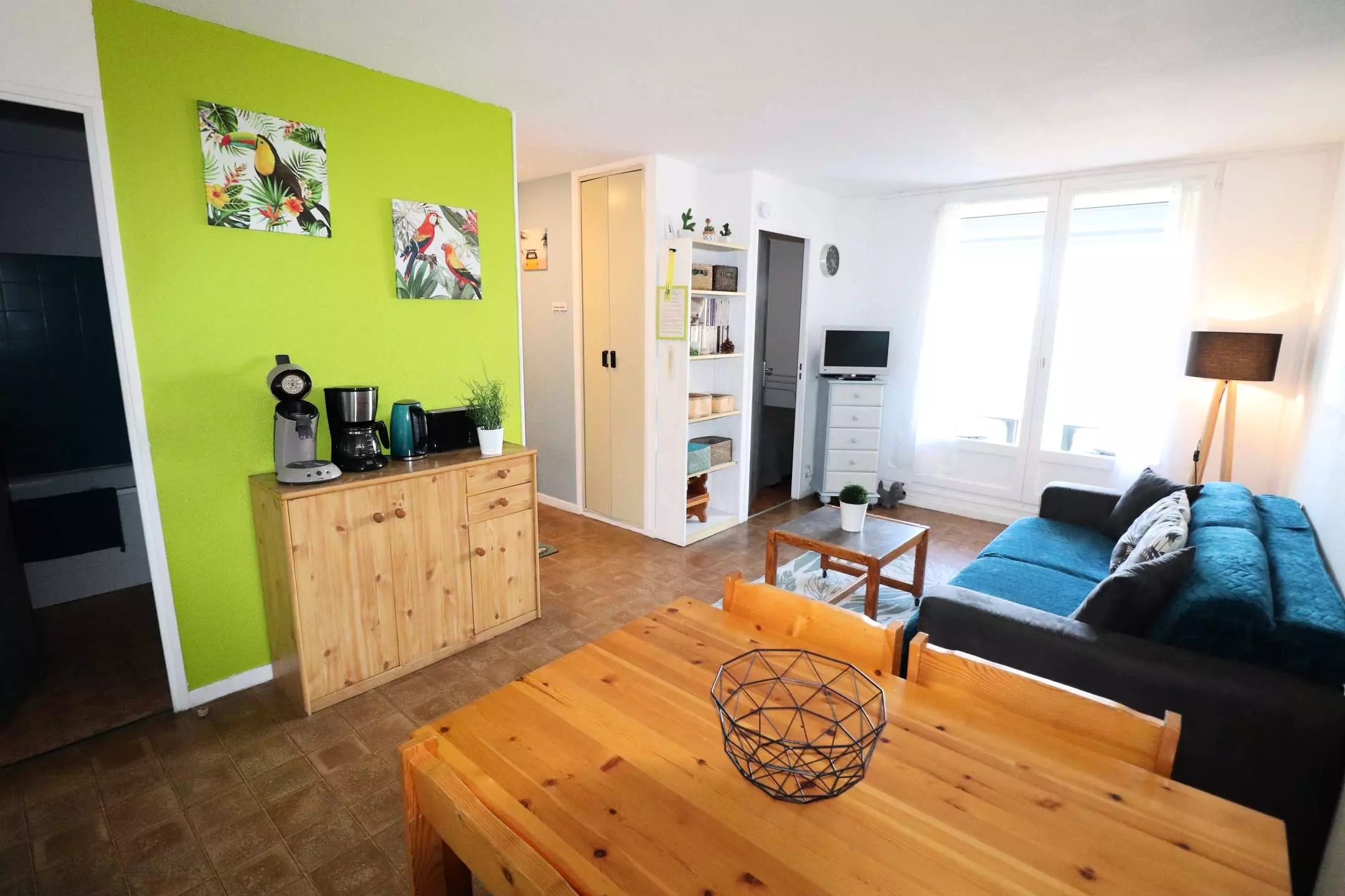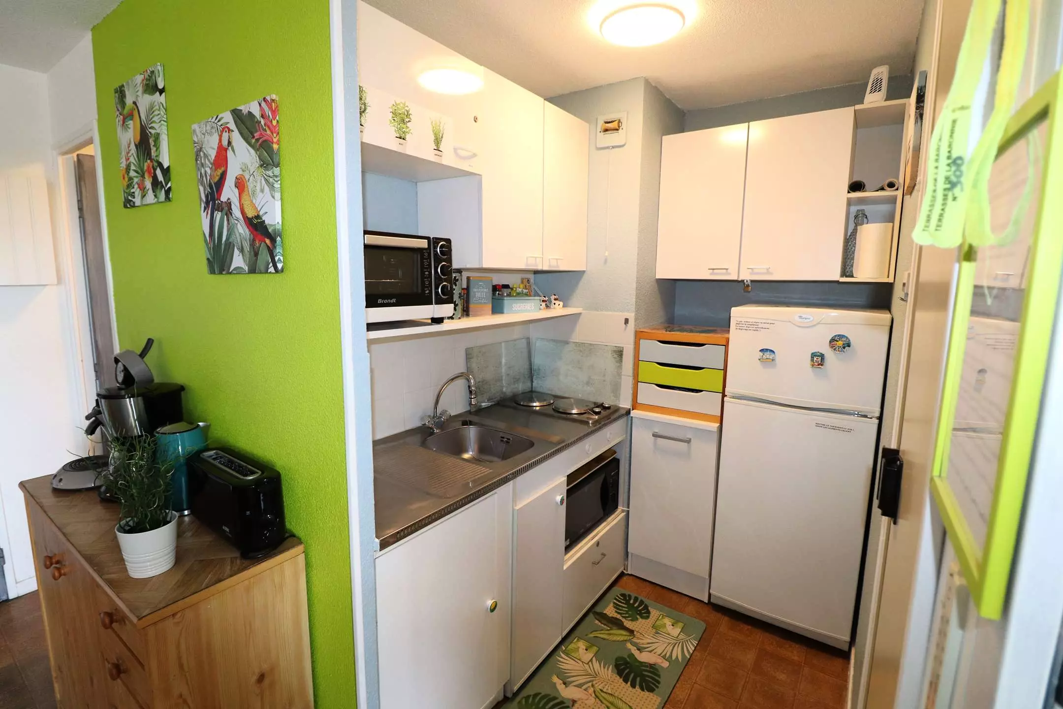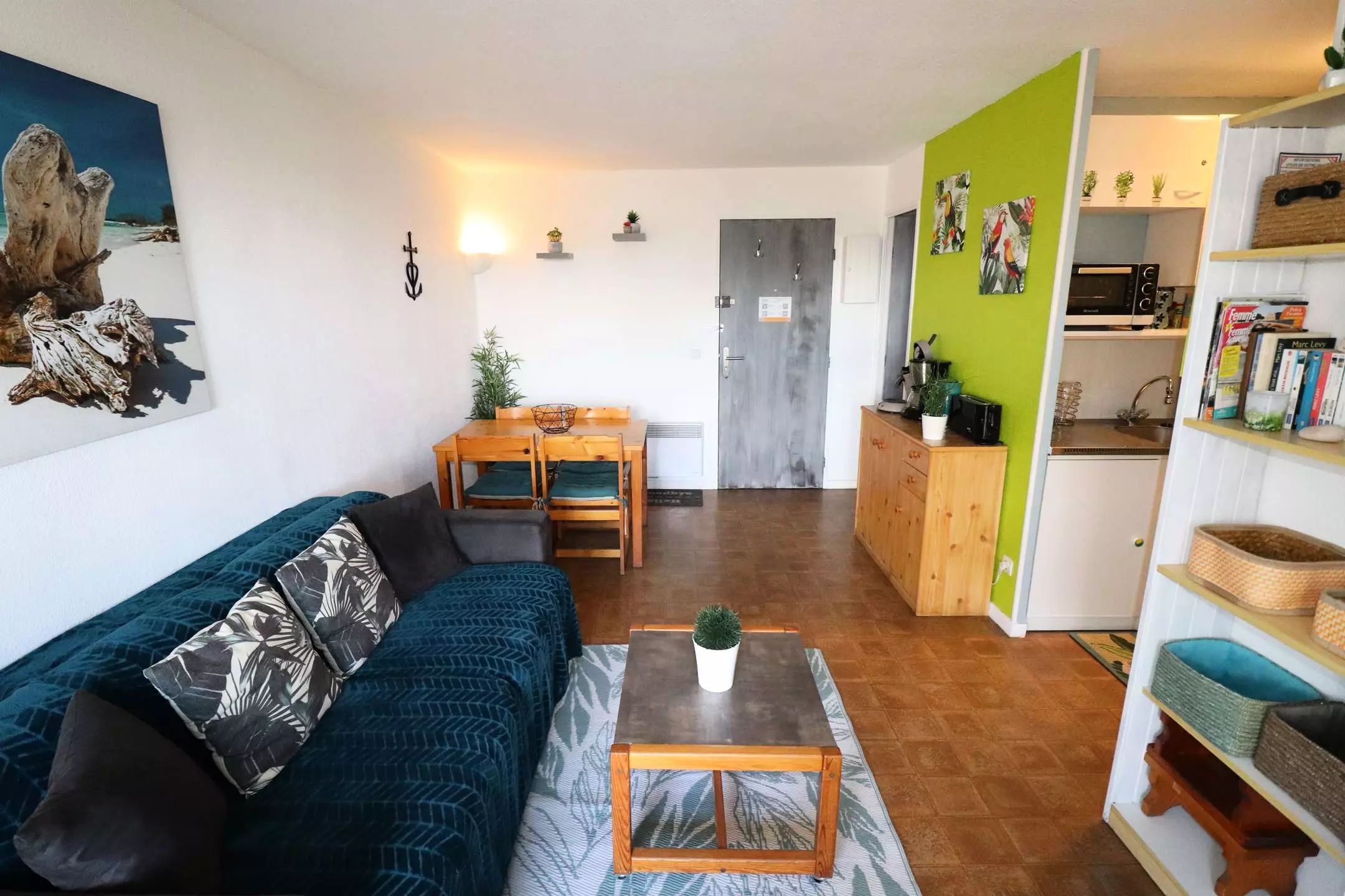 Résidence TERRASSES DE LA BARONNIE- Piscine, ascenseur, espaces verts, proche commerces et plages. Cet appartement se compose d'un grand séjour donnant sur une belle terrasse au Sud et vue dégagée avec coin repas et coin salon : canapé convertible pour 2 personnes, T.V, cuisine équipée, salle d'eau avec WC, une chambre avec un lit 2 personnes, placard et fenêtre.
