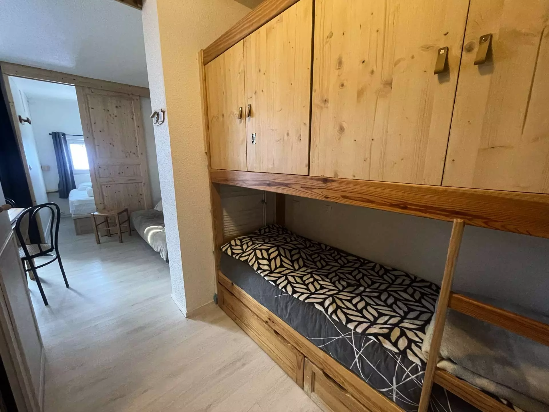 A l’entrée vous trouverez un miroir en bois et des porte-manteaux, le coin montagne comprend un lit de 90*190 équipé d’une lampe et prise électrique, ce qui permet de lire et recharger un téléphone. Au-dessus vous accèderez à un placard pour le rangement de vos affaires personnelles ainsi qu’un espace pour déposer vos valises.