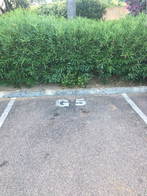 Terrasse (couverte) avec petit jardin privatif : salon de jardin, douche extérieure (chaud/froid), barbecue fixe en pierre, ombragée par 1 pin. Exposition sud