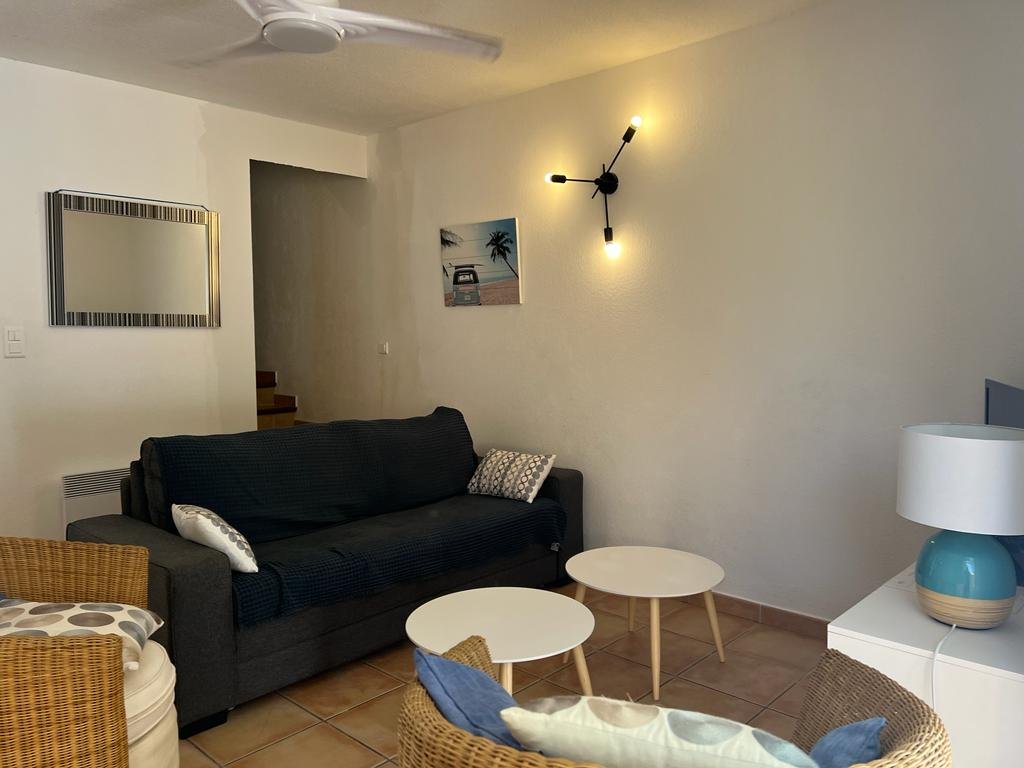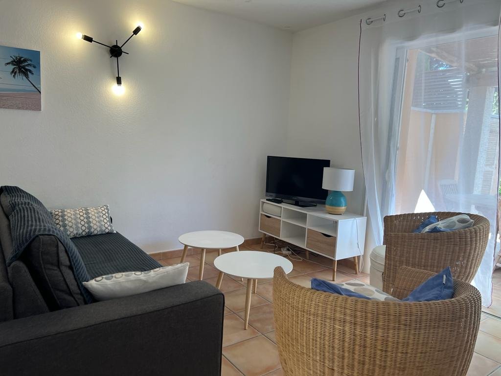 Séjour/cuisine américaine - (baie vitrée) – ventilateur - internet par WI-FI: plaque de cuisson (vitrocéramique), four (électrique), hotte aspirante, frigo-congélateur, cafetière NESPRESSO, lave-vaisselle, rangements aménagés, canapé convertible, télévision.