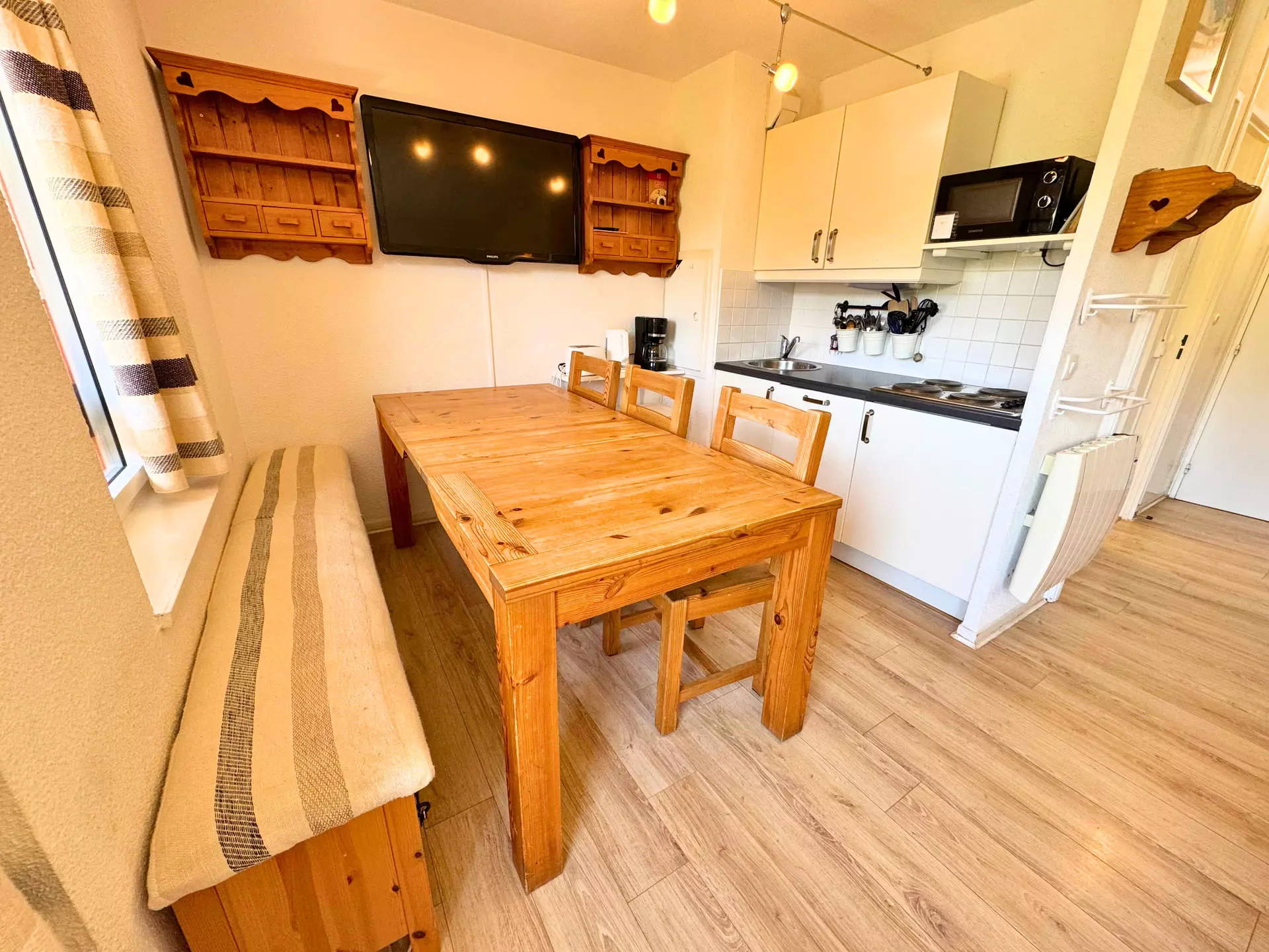 Cuisine : plaques electriques (x4) , micro-ondes, réfrigérateur , lave-vaisselle, cafetière, bouilloire, grille-pain, appareil à raclette, set à fondue