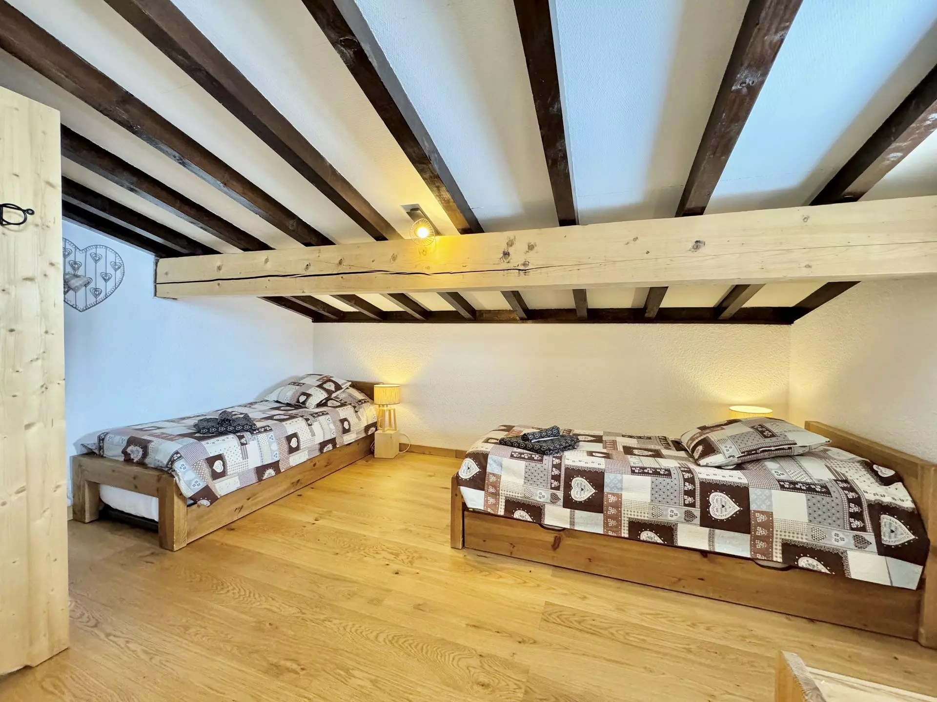 - Couchages : une chambre avec un lit double (160) et un lit simple (90), une chambre avec deux lits jumeaux et lit tiroir (3x90). Literie équipée de couettes.