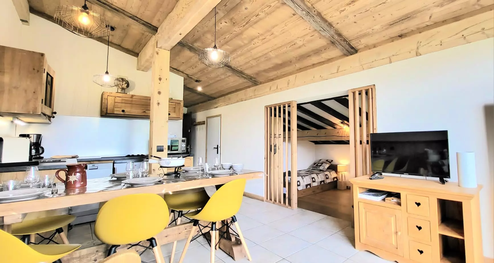 - Séjour avec télévision écran plat avec cuisine ouverte équipée : 4 plaques vitrocéramiques, micro-ondes, réfrigérateur, lave vaisselle.