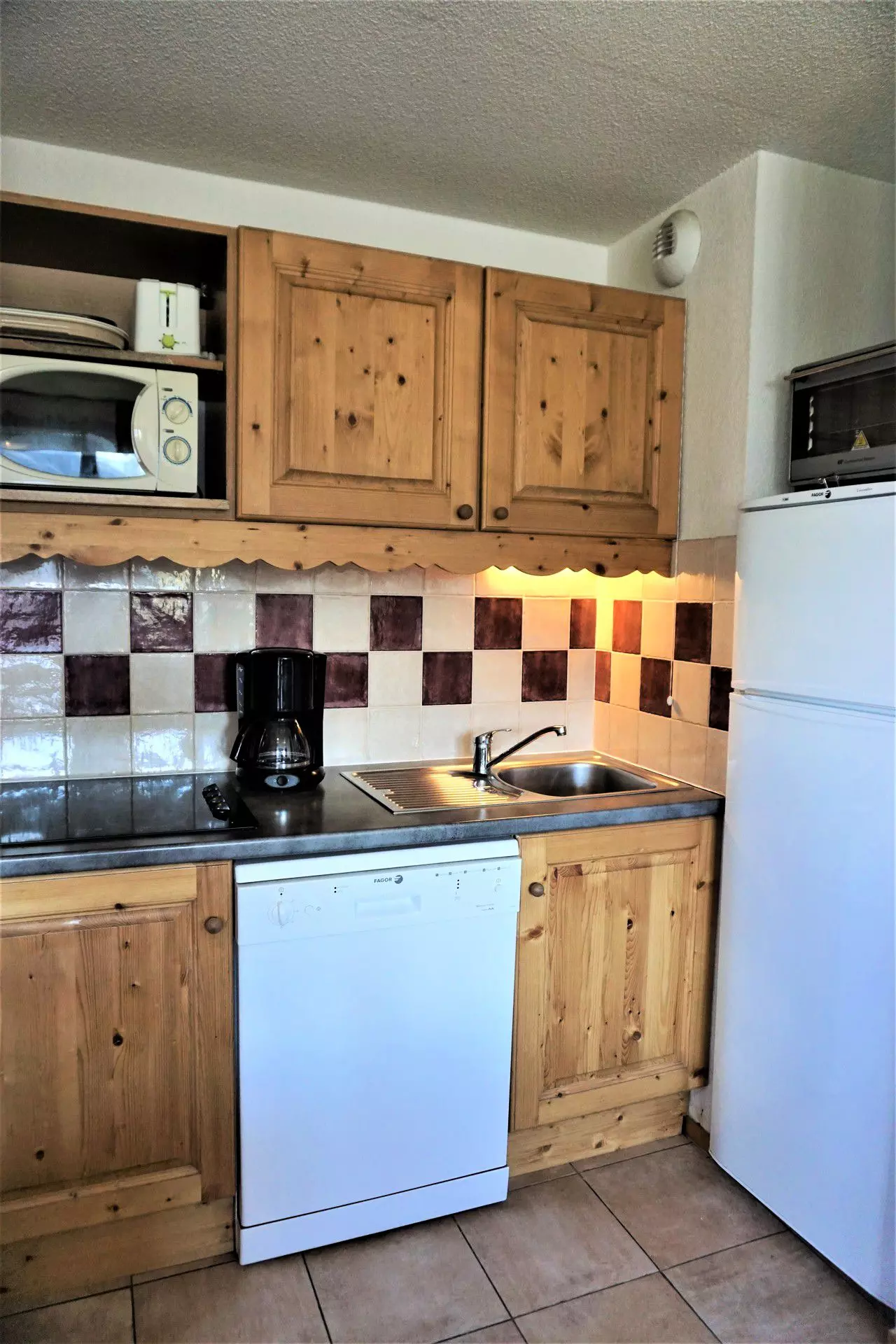 Coin cuisine : 4 plaques vitrocéramiques, frigo/congélateur, micro-ondes,four , lave-vaisselle.