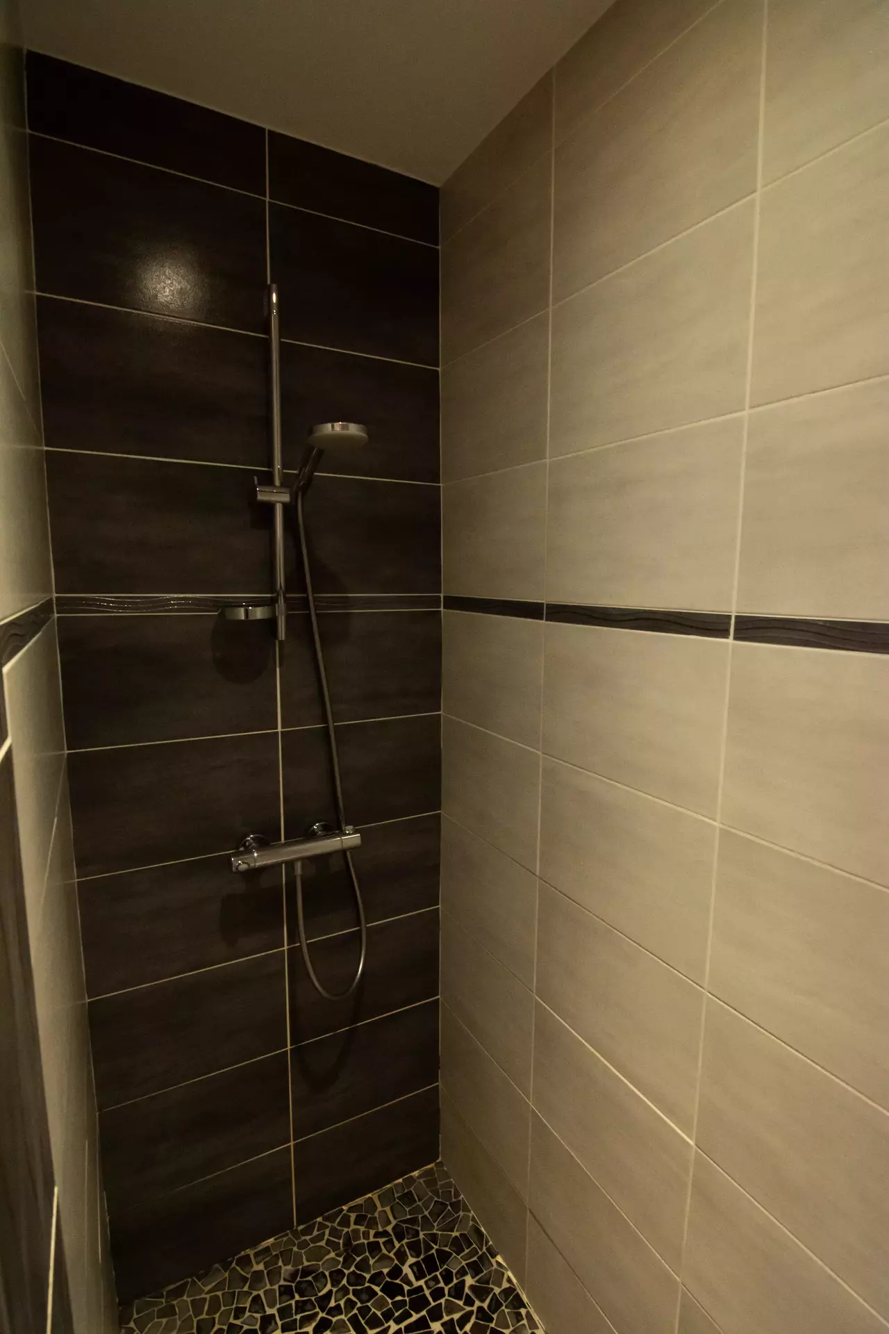 Salle d'eau : douche, sèche-cheveux et sèche-serviettes.