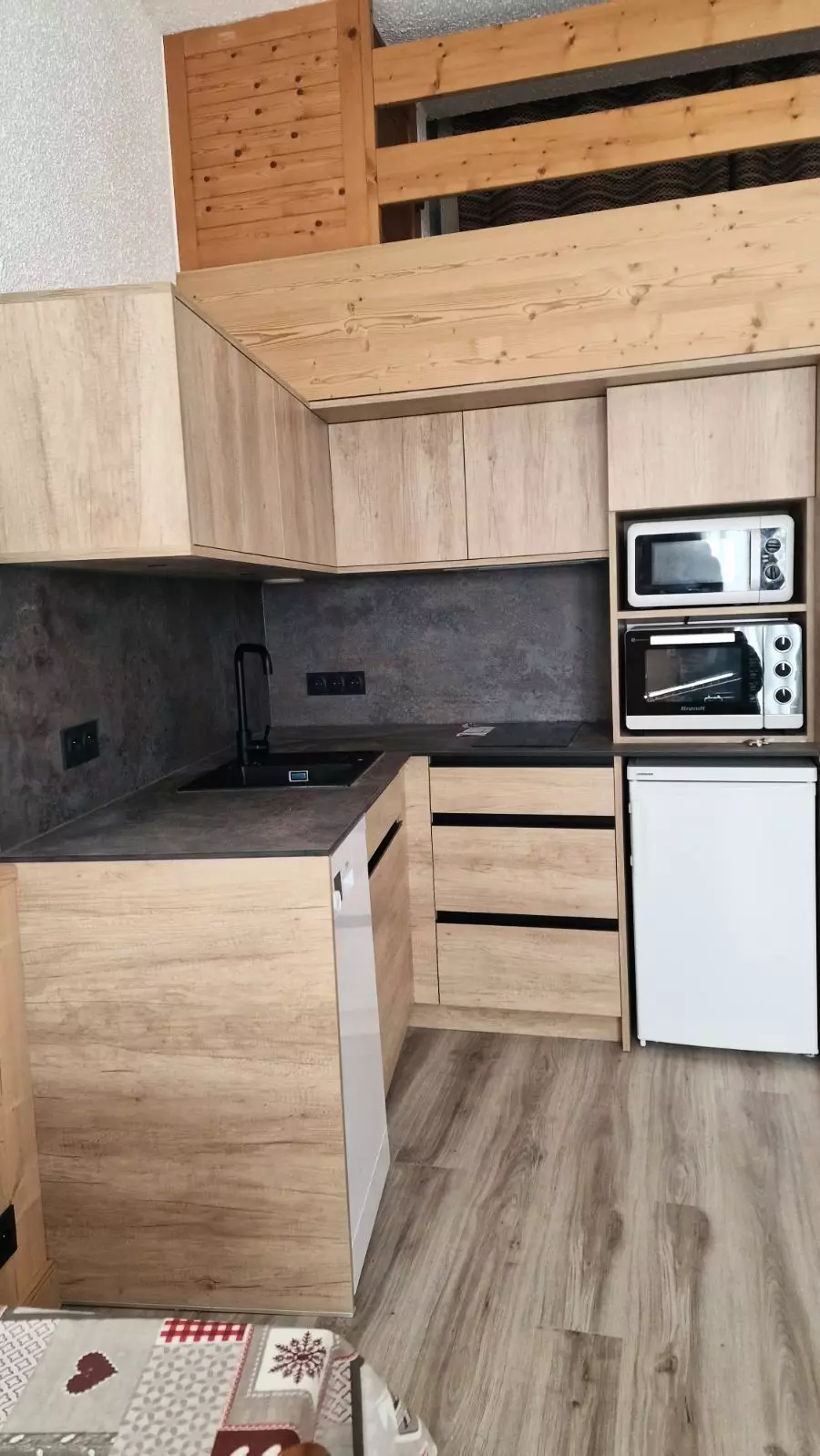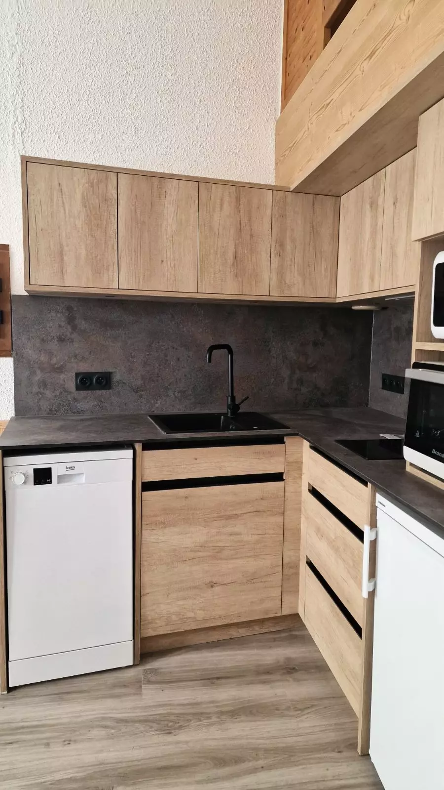 - Coin cuisine : four, micro-ondes, lave-vaisselle, réfrigérateur, plaque induction (2 foyers).