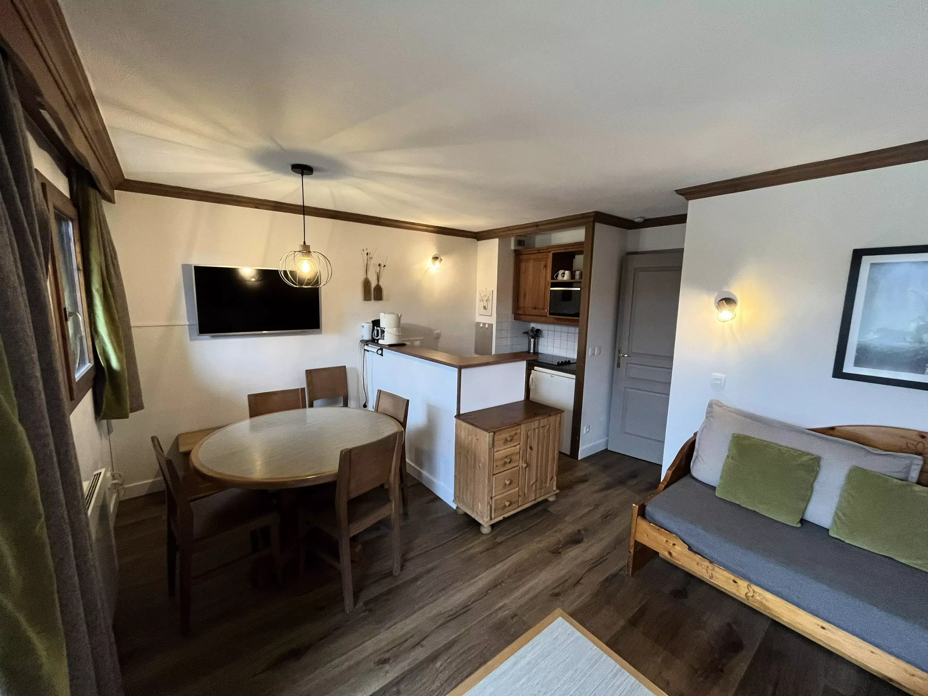 Composition du séjour : 2 banquettes-lit (2 couchages). Côté repas : 1 table avec 6 chaises.