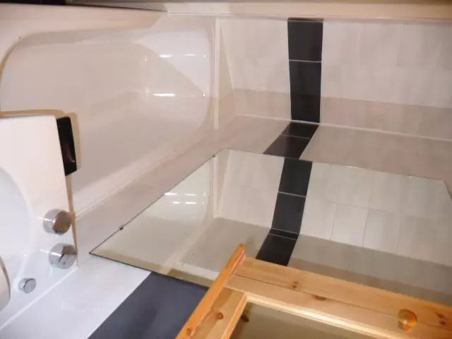 Salle de bains rénovée : baignoire, lavab, miroir, grand placard