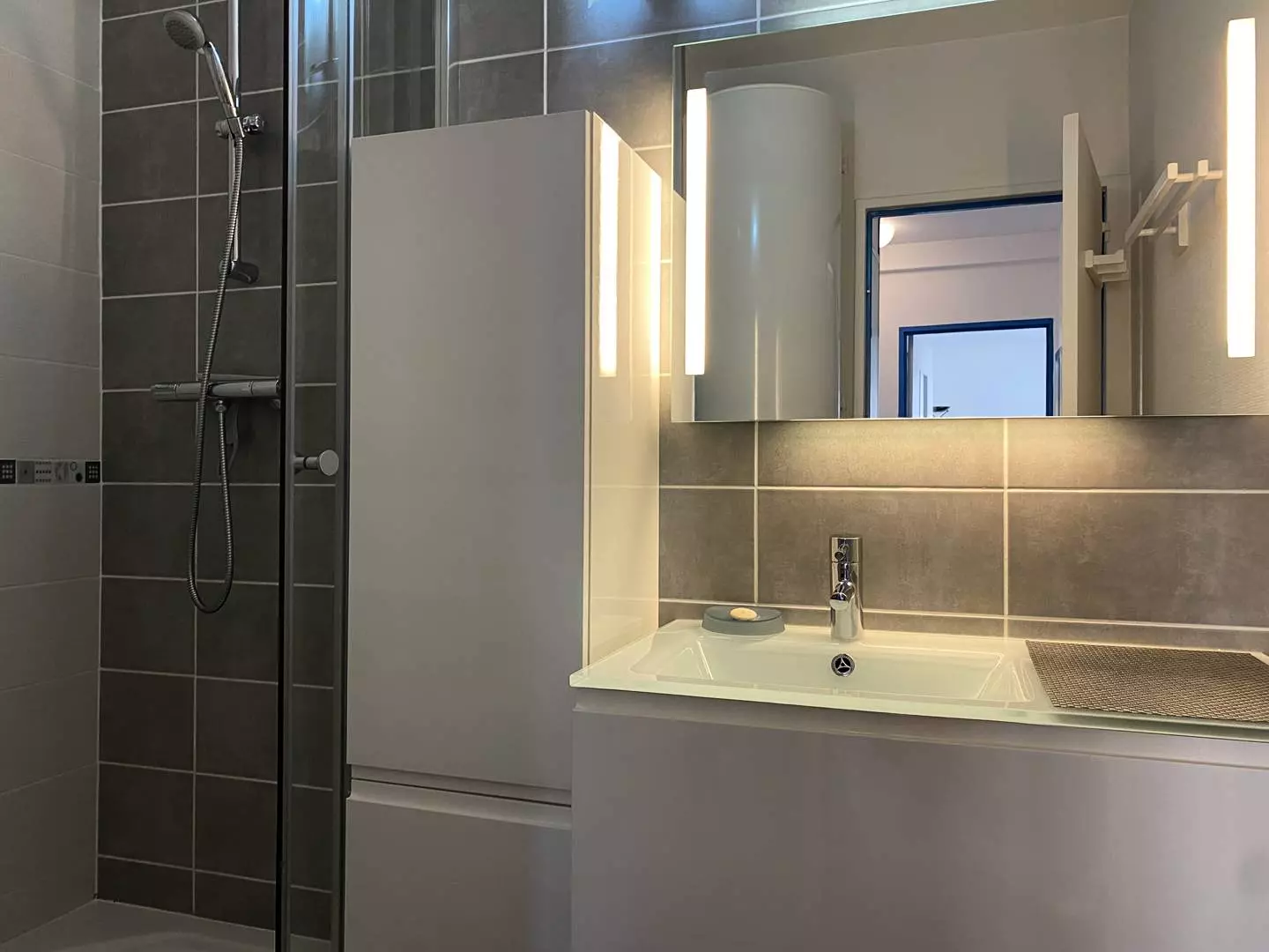-Une salle d'eau avec douche, vasque, lave-linge;