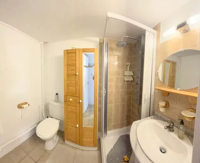 Une chambre avec lit superposés et une salle d'eau avec douche cabine et WC.