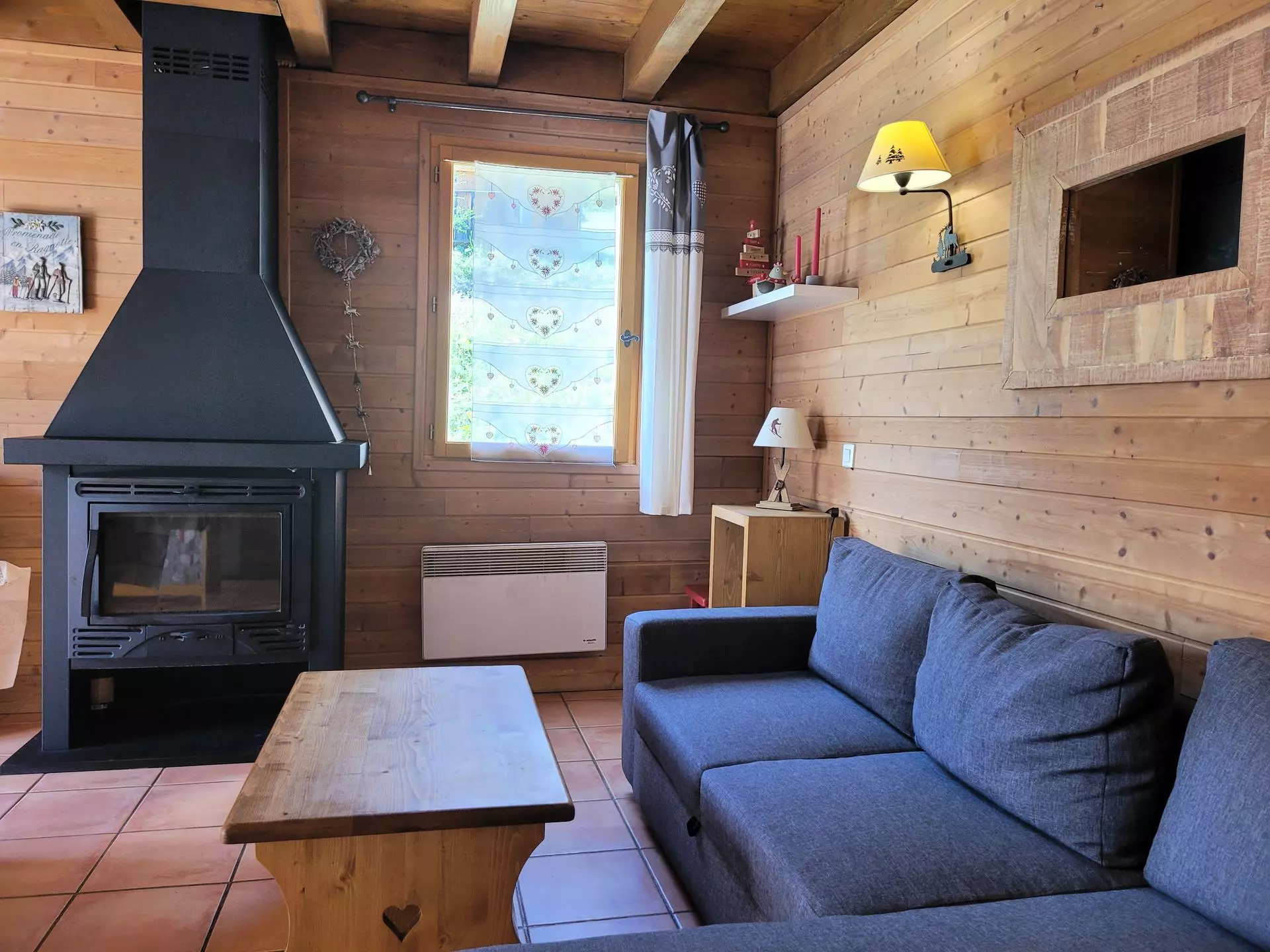 * Séjour avec canapé d'angle convertible pour 2 personnes, TV en HD, cheminée insert, beaux meubles en bois, volets bois, accès terrasse.