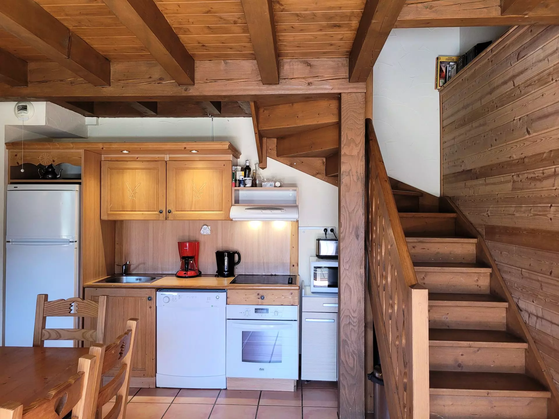 * Coin cuisine : plaque vitrocéramique, four, réfrigérateur/congélateur, lave vaisselle, micro-ondes, cafetière filtre, placards de rangement, appareil à raclette ;