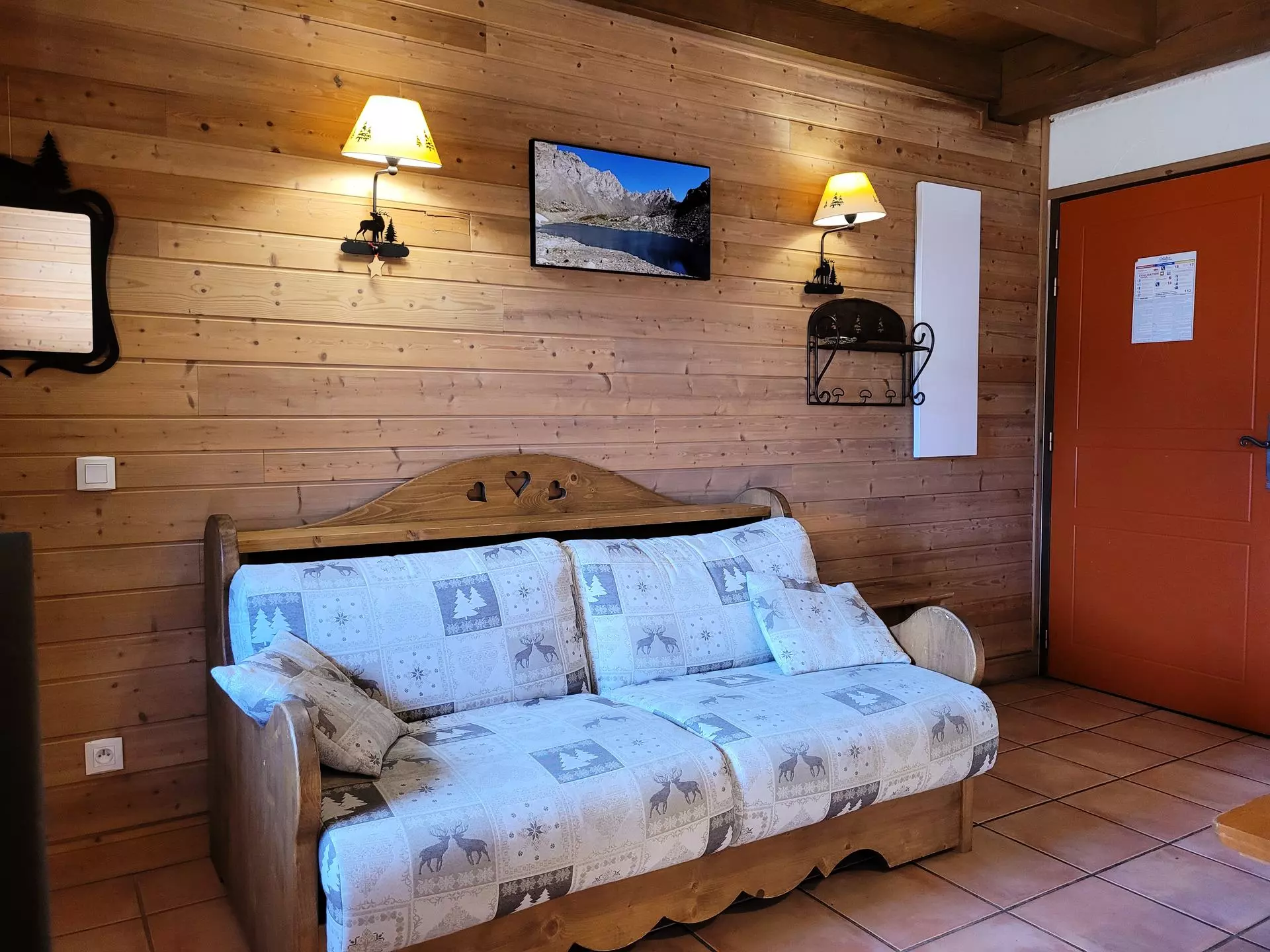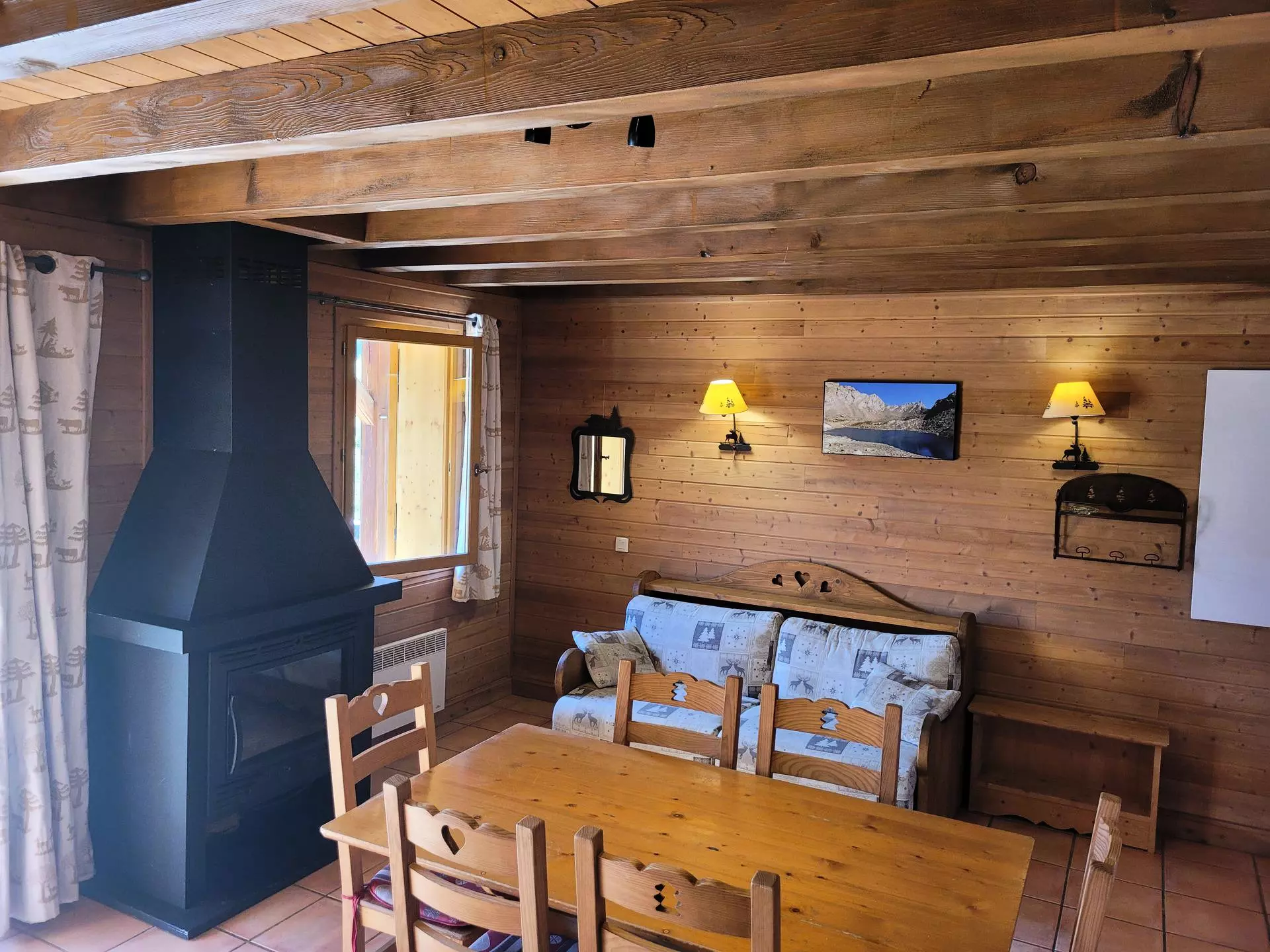 * Séjour avec convertible lit 2 personnes type rapido, couette, T.V. H.D., cheminée insert, beaux meubles en bois, accès terrasse.