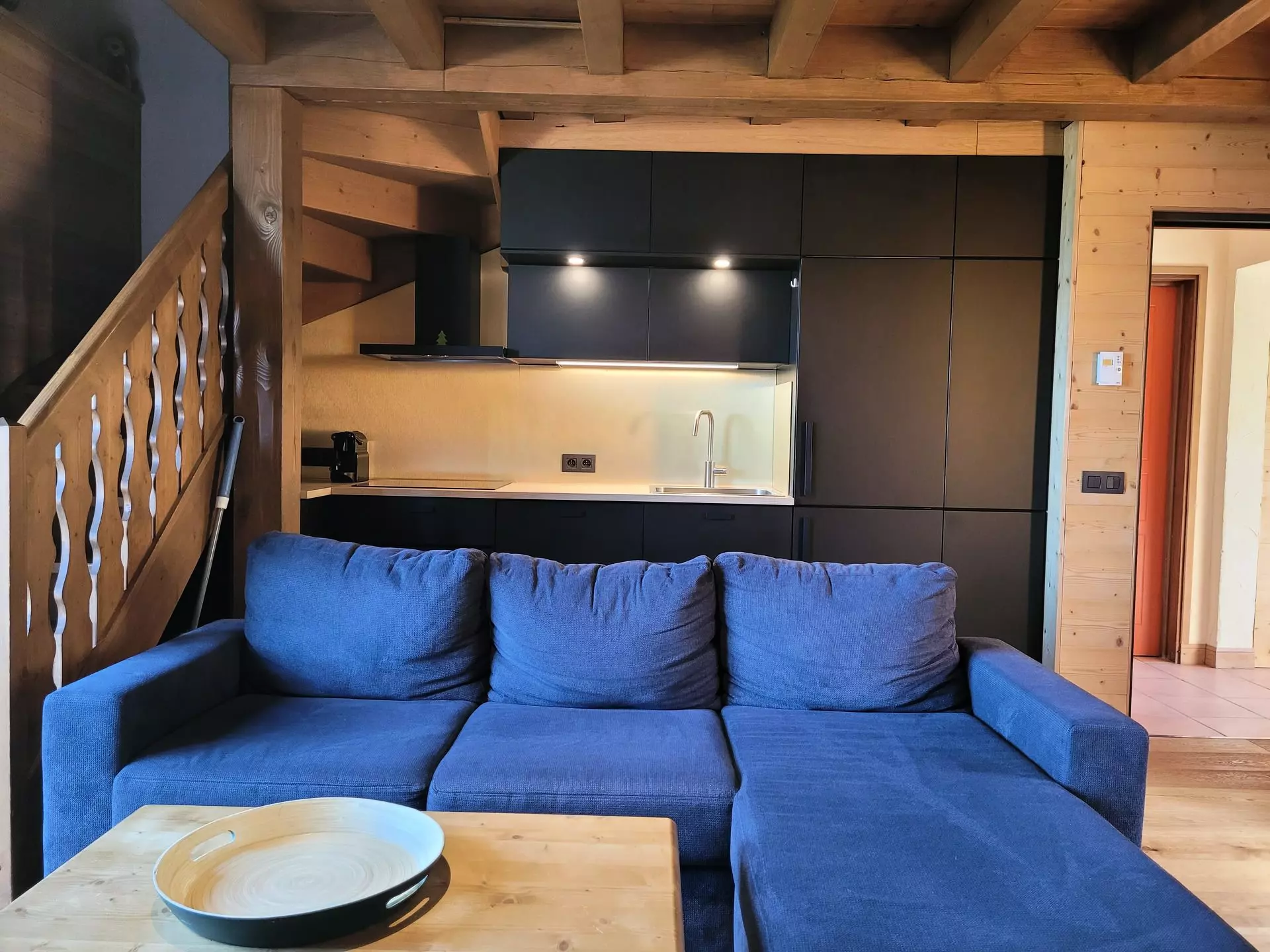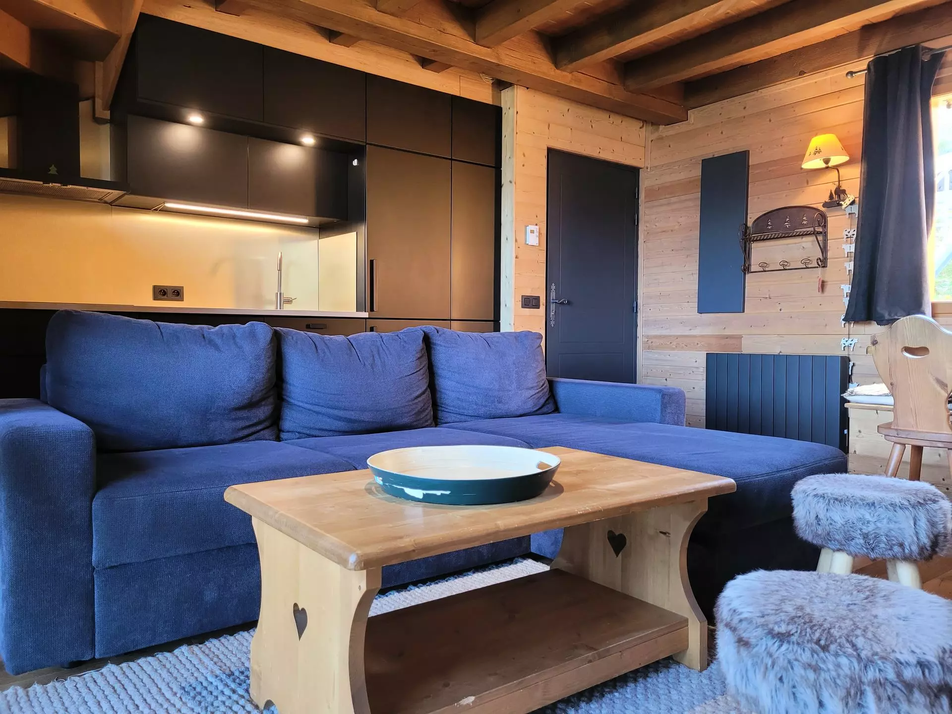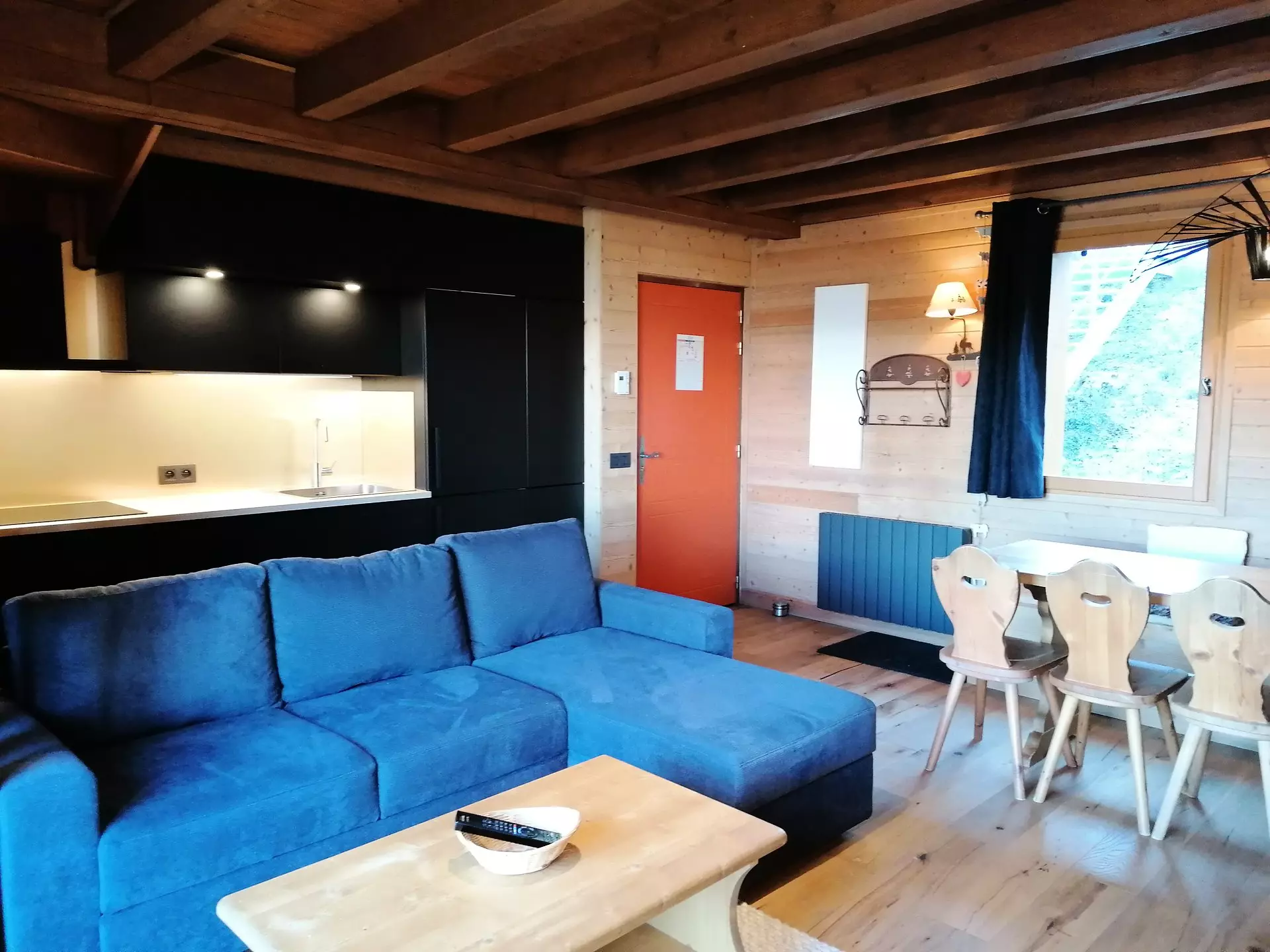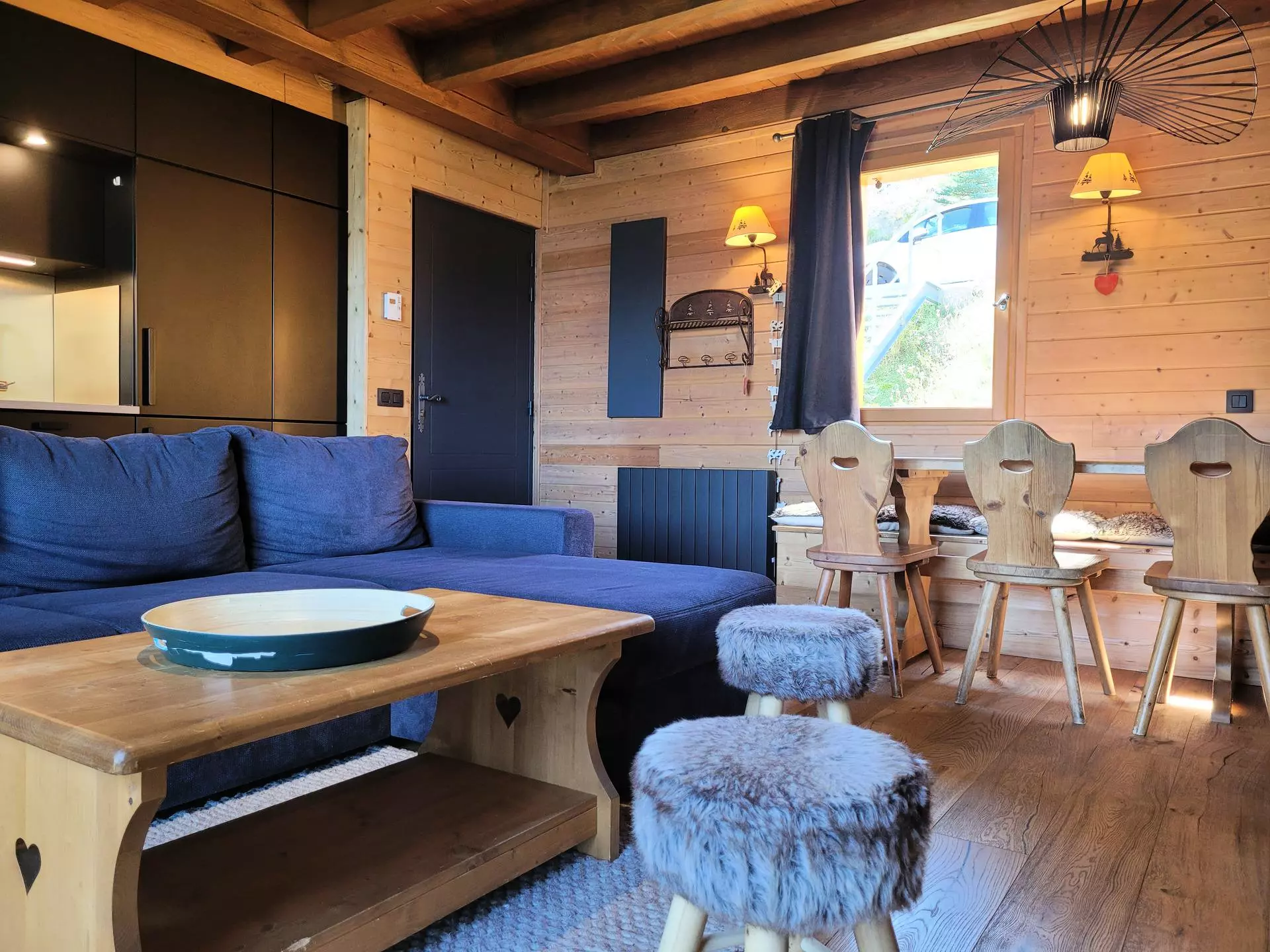 * Séjour avec convertible 2 personnes, couvertures, TV en HD, cheminée insert, beaux meubles en bois, accès terrasse.