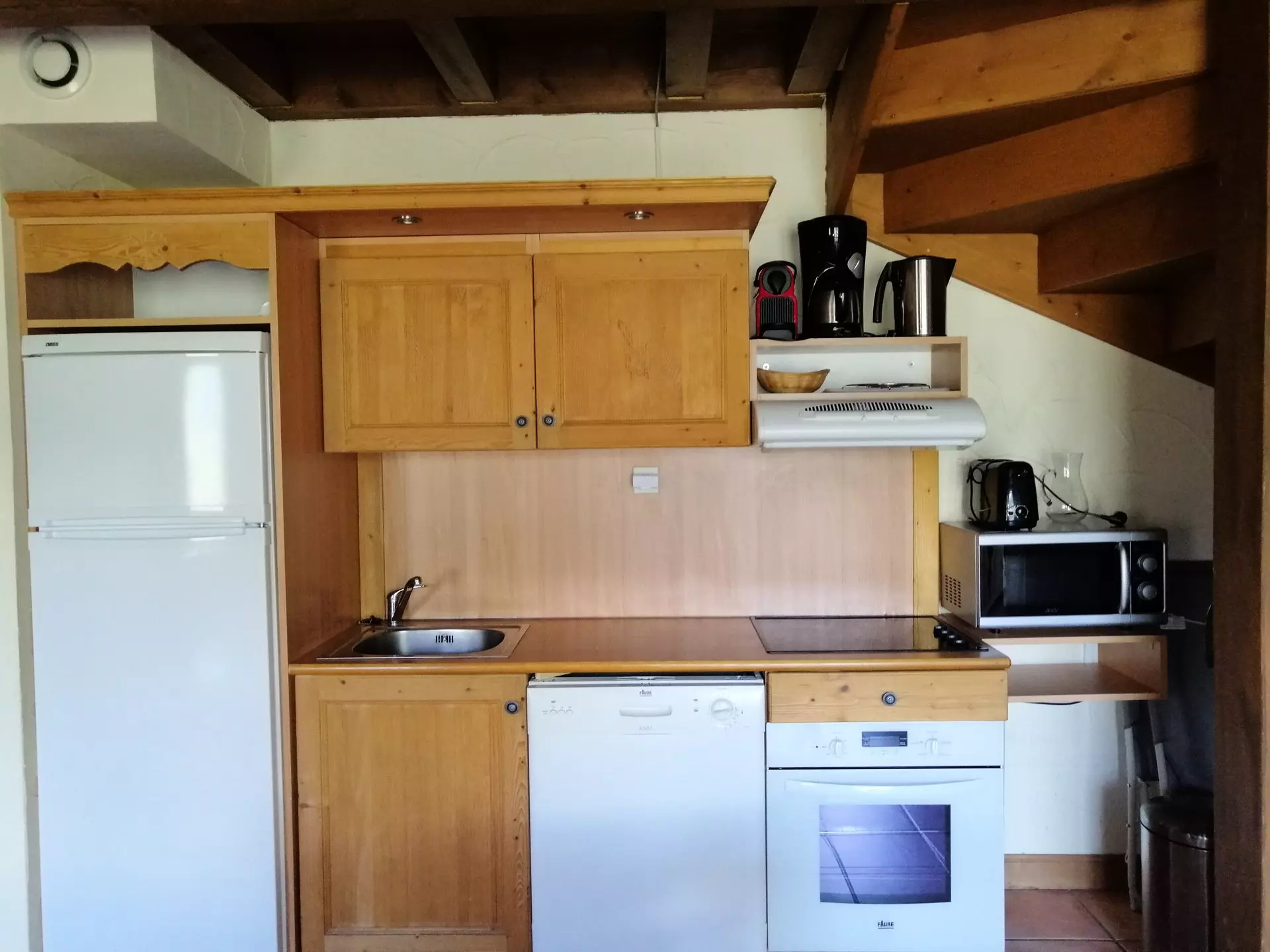 * Coin cuisine : plaque vitrocéramique, four, réfrigérateur/congélateur, lave vaisselle, lave linge, micro-ondes, cafetière Nespresso et cafetière filtre, batteur, placards de rangement ;