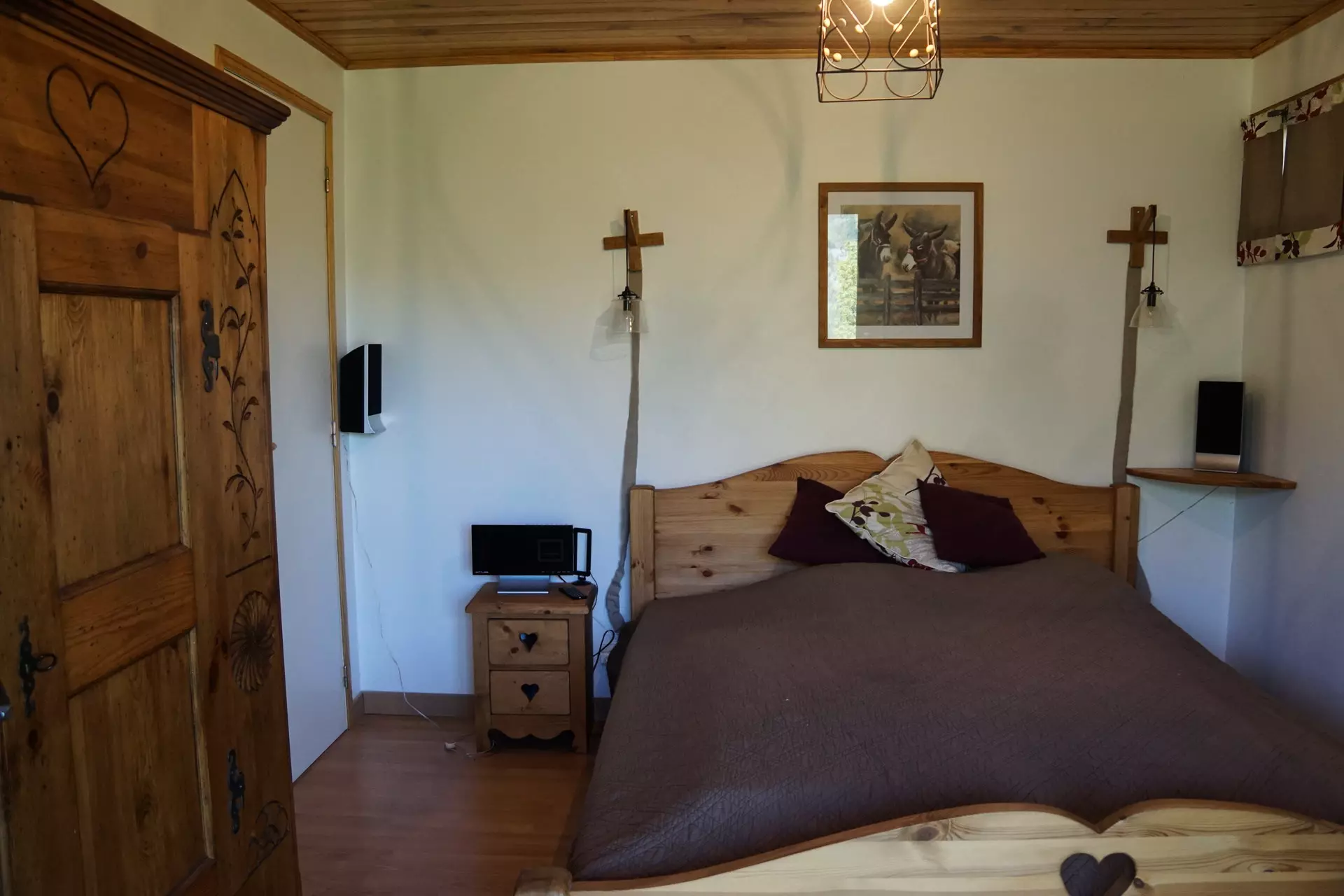 ** RDC : * Chambre 3 : 1 grand lit 2 places 160, couette, belle armoire bois rustique, accès jardin, lumineuse ;