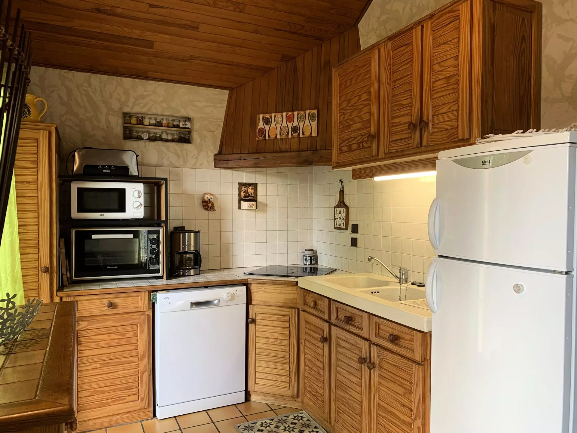 * Cuisine : réfrigérateur/congélateur, lave-vaisselle, four, micro-ondes, 4 plaques induction, cafetière filtre, grille pain, crépière, appareil à fondue, appareil à raclette, accès terrasse ;