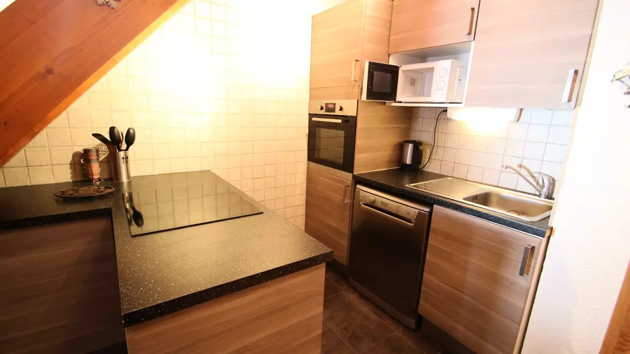 - Au rez de chaussée : une entrée avec placard, salle de bains et WC indépendant. Cuisine équipée d'un lave vaisselle, de 4 plaques électriques, d'un micro onde, d'une bouilloire, d'une cafetière, d'un grille pain. Séjour comprenant une banquette gigogne et son balcon plein sud.