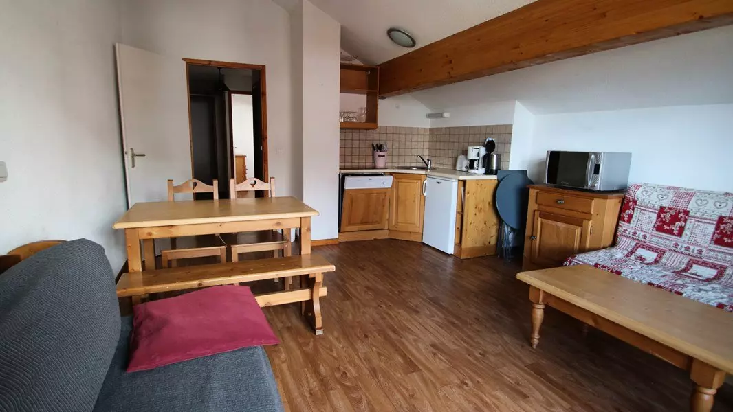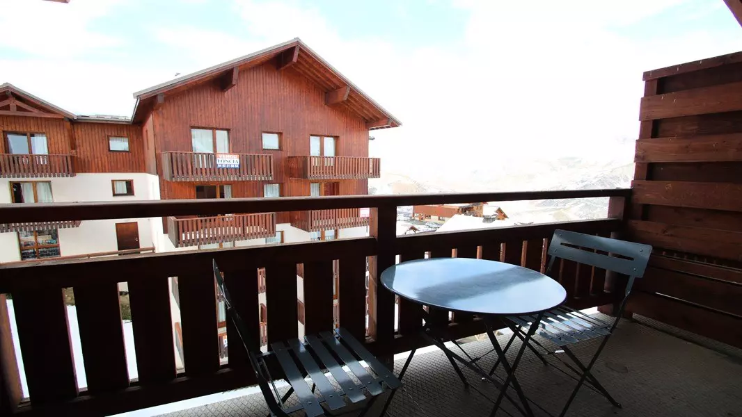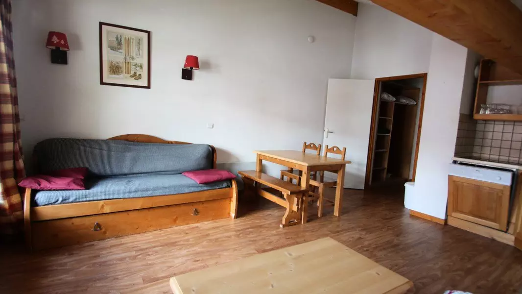 - Séjour avec canapé lit gigogne convertible (2/80x190 ou 160x190), table à manger, tv écran plat et balcon équipé d’une table et deux chaises.